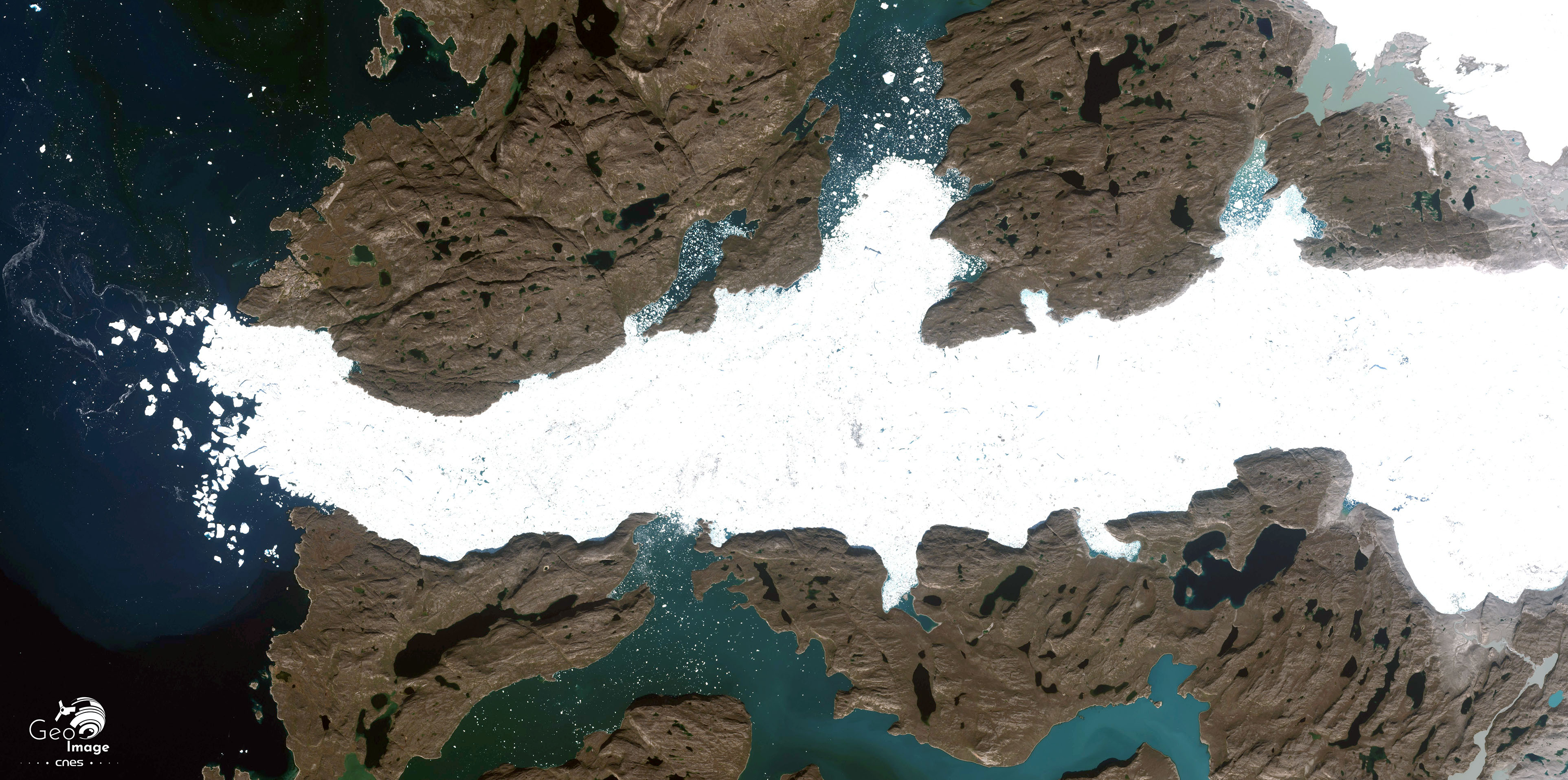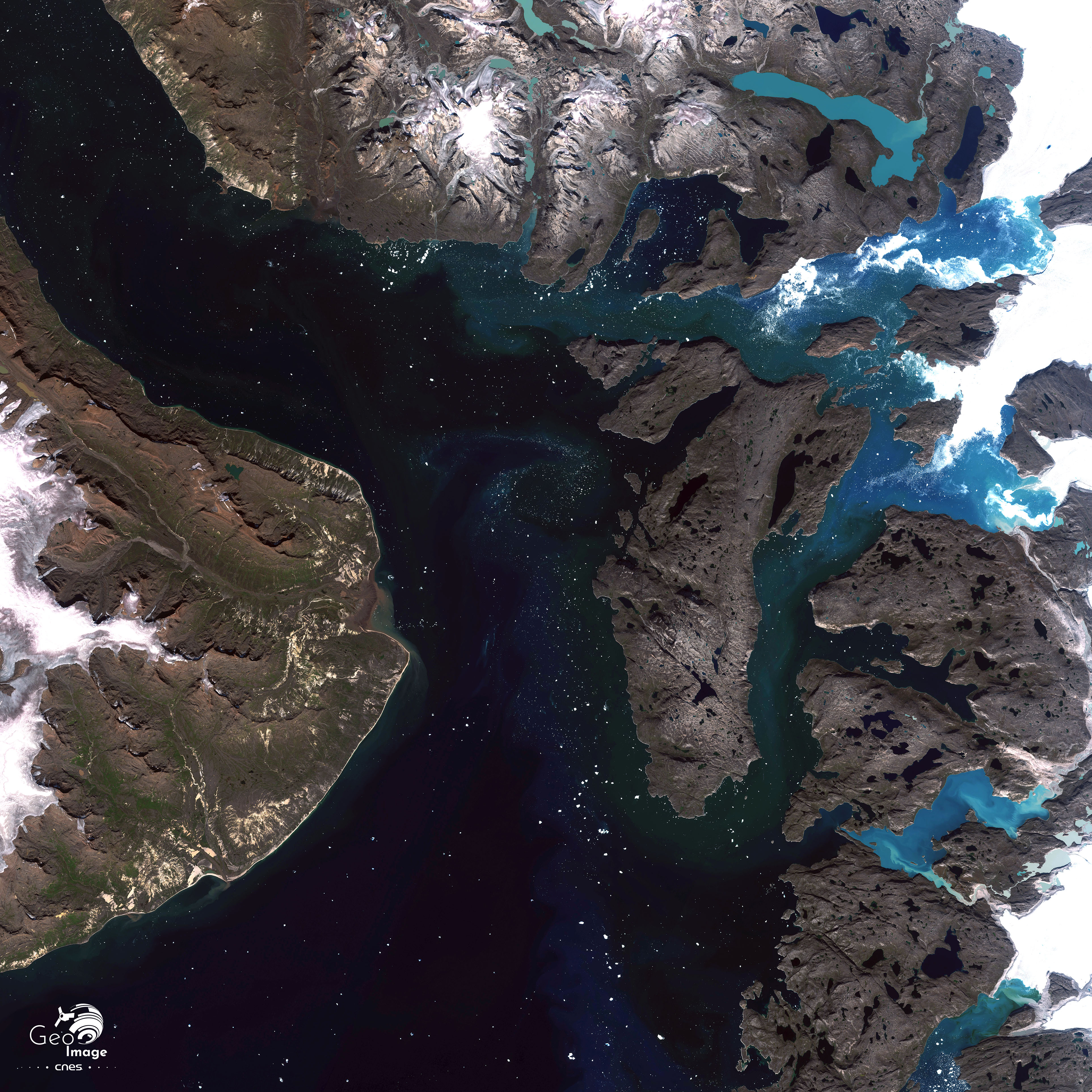 Nous sommes ici au Sud-Ouest du Groenland – une immense île de 2,1 millions km² couverte à 80 % de glace - bordé par la mer de Baffin où se déploie la baie de Disko bien visible au centre de l’image. S’étendant sur 150 kilomètres du nord au sud et 100 kilomètres d’est en ouest, c’est la plus grande baie ouverte de l’ouest du Groenland.