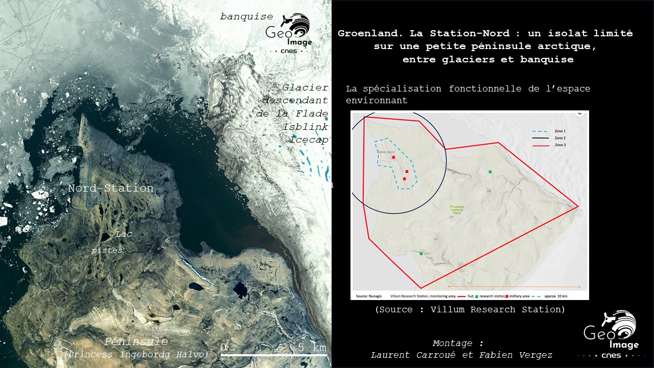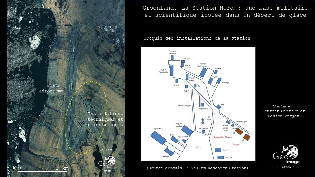 Dans ces conditions, les stations – comme la station Nord sur l’image satellite – choisissent, lorsque c’est possible, de s’installer sur des roches dures qui assurent une bonne stabilité. Si la station Nord se trouve à 80 m d’altitude, elle est dominée par des hauteurs montant de 100 à 133 m. On retrouve la même logique, par exemple, pour la station française Dumont d’Urville en Terre-Adélie dans l’Antarctique. On remarquera aussi dans le carton, tiré d’un document de la Villum Research Station à destination des chercheurs qui viennent travailler à la station Nord, l’importance prise en surface par les espaces militaires (military area).