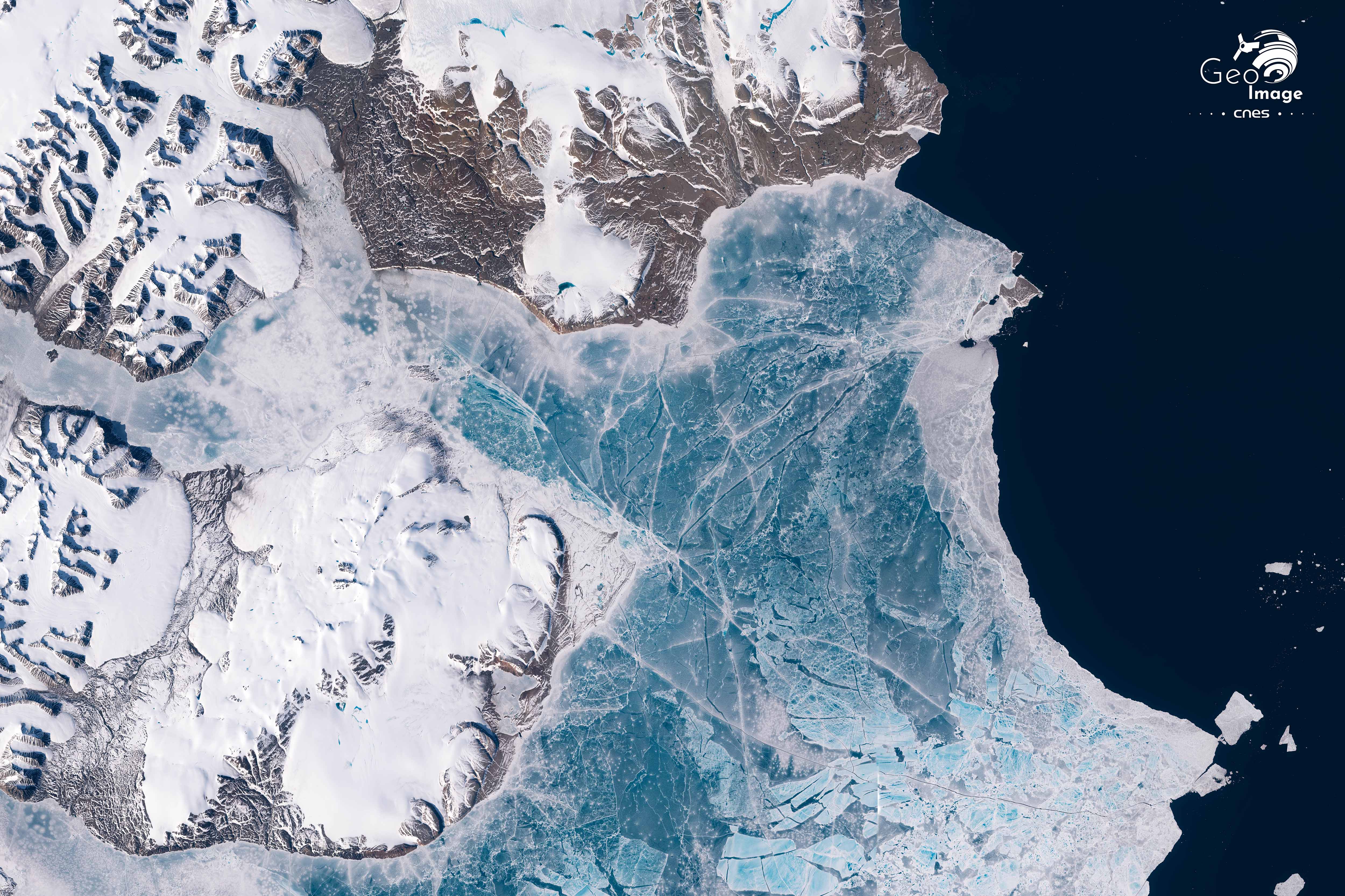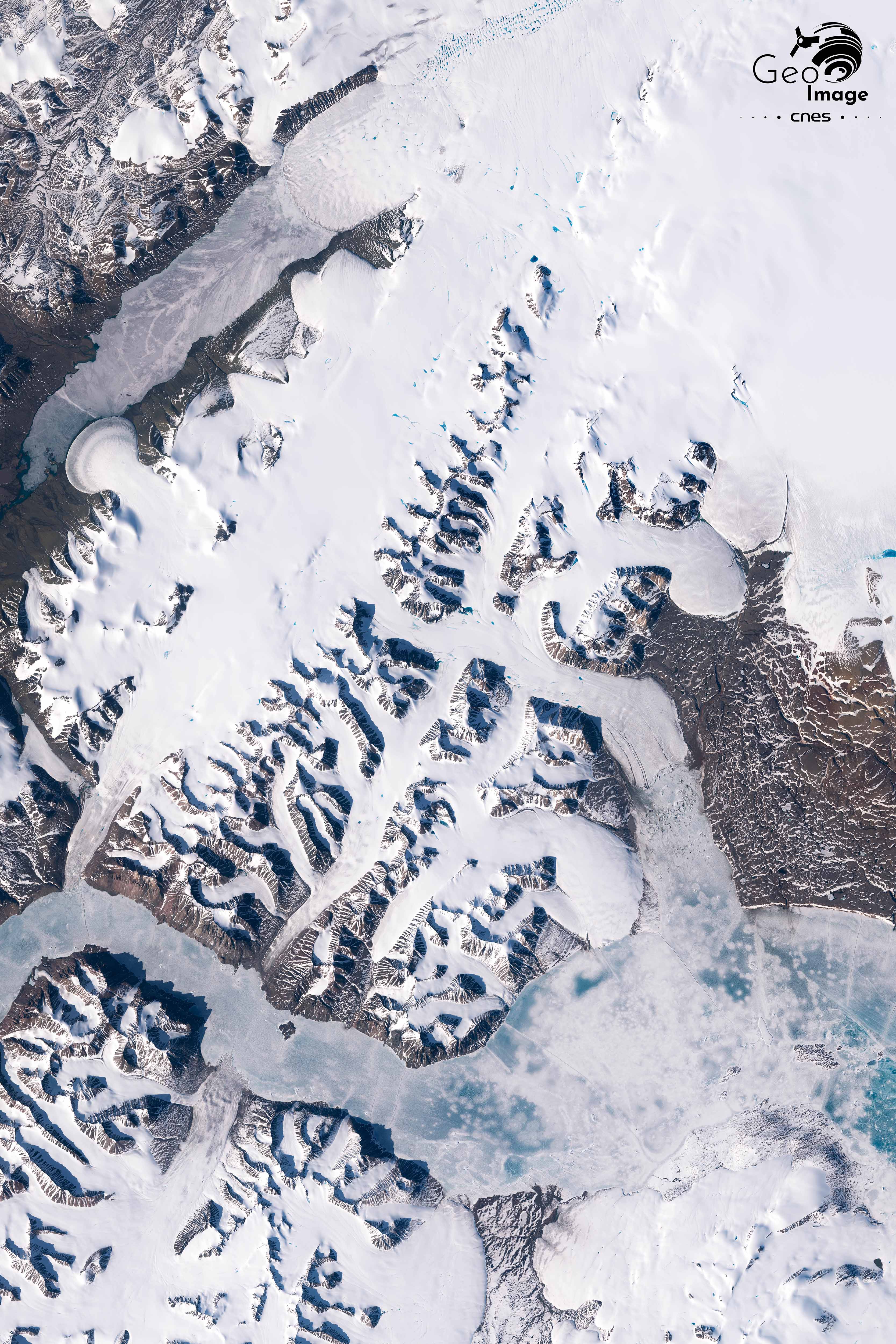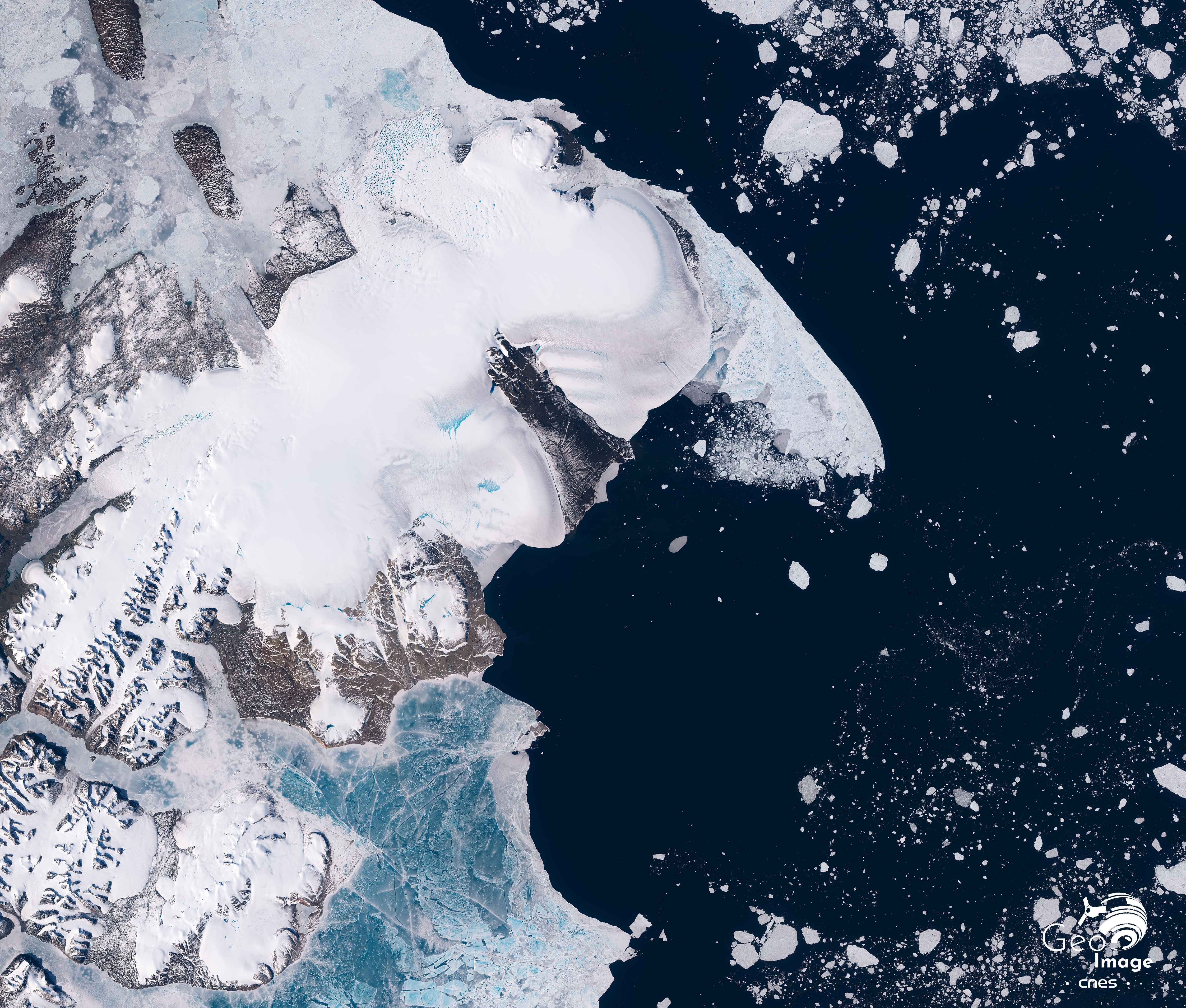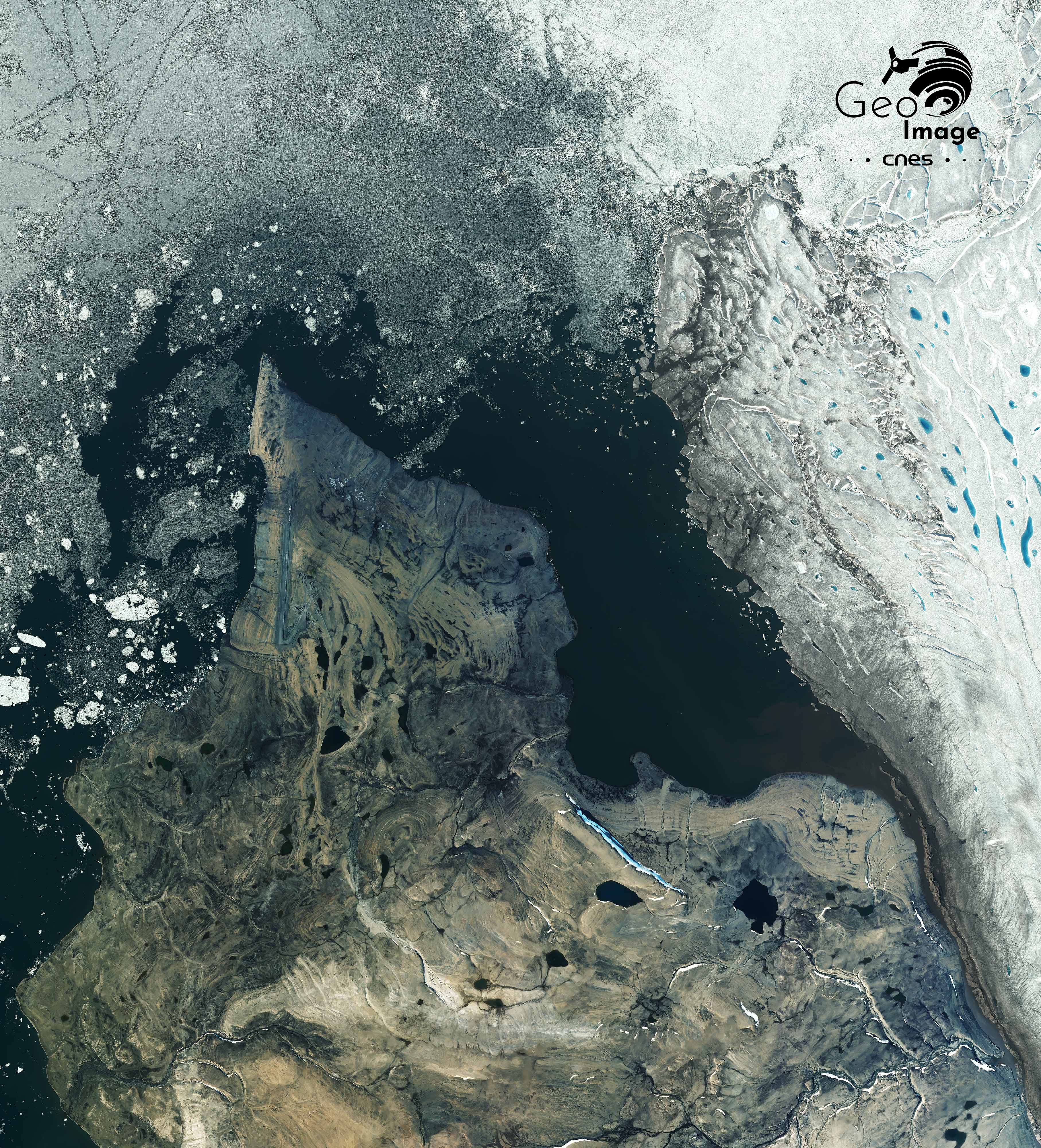 Prise fin juillet, en plein été boréal donc, cette image (doc. 1) est globalement coupée en deux. Située en position d’abri à 82 m d’altitude, la Station-Nord est posée sur la terminaison septentrionale de la petite péninsule de la Princesse Ingeborg.