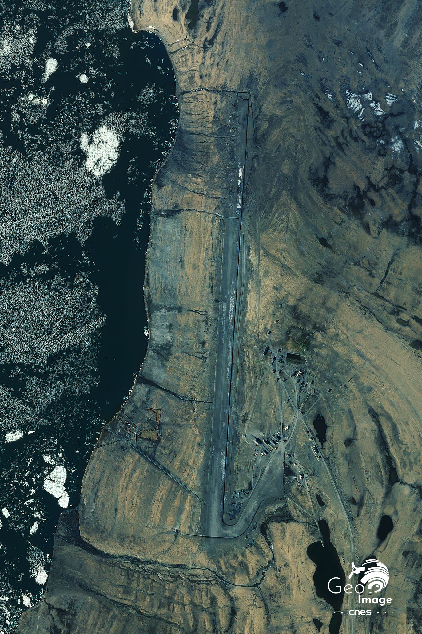 Cette image témoigne de la qualité du site choisi pour installer la piste de l’aérodrome et la station qui en dépend. Elle est en position d’abri et protégée à l’est par des hauteurs rocheuses de 100 à 133 m d’altitude, tandis que la toundra rase et les plaques de neige résiduelle marquent le paysage estival de cet isolat arctique.. La piste, orientée nord/sud, valorise un des rares lieux à peu près plats remodelés par les bulldozers. En cette fin juillet, au cœur de l’été donc, la mer porte toujours des blocs de glace et les hauteurs à droite restent enneigées. On doit relever l’absence de formations arbustives et la présence d’une toundra très rase. Au sud-est de la piste d’avion, la station comporte une quarantaine de bâtiments relativement dispersés. Vers le sud part une piste qui longe des lacs de surcreusement glaciaire.