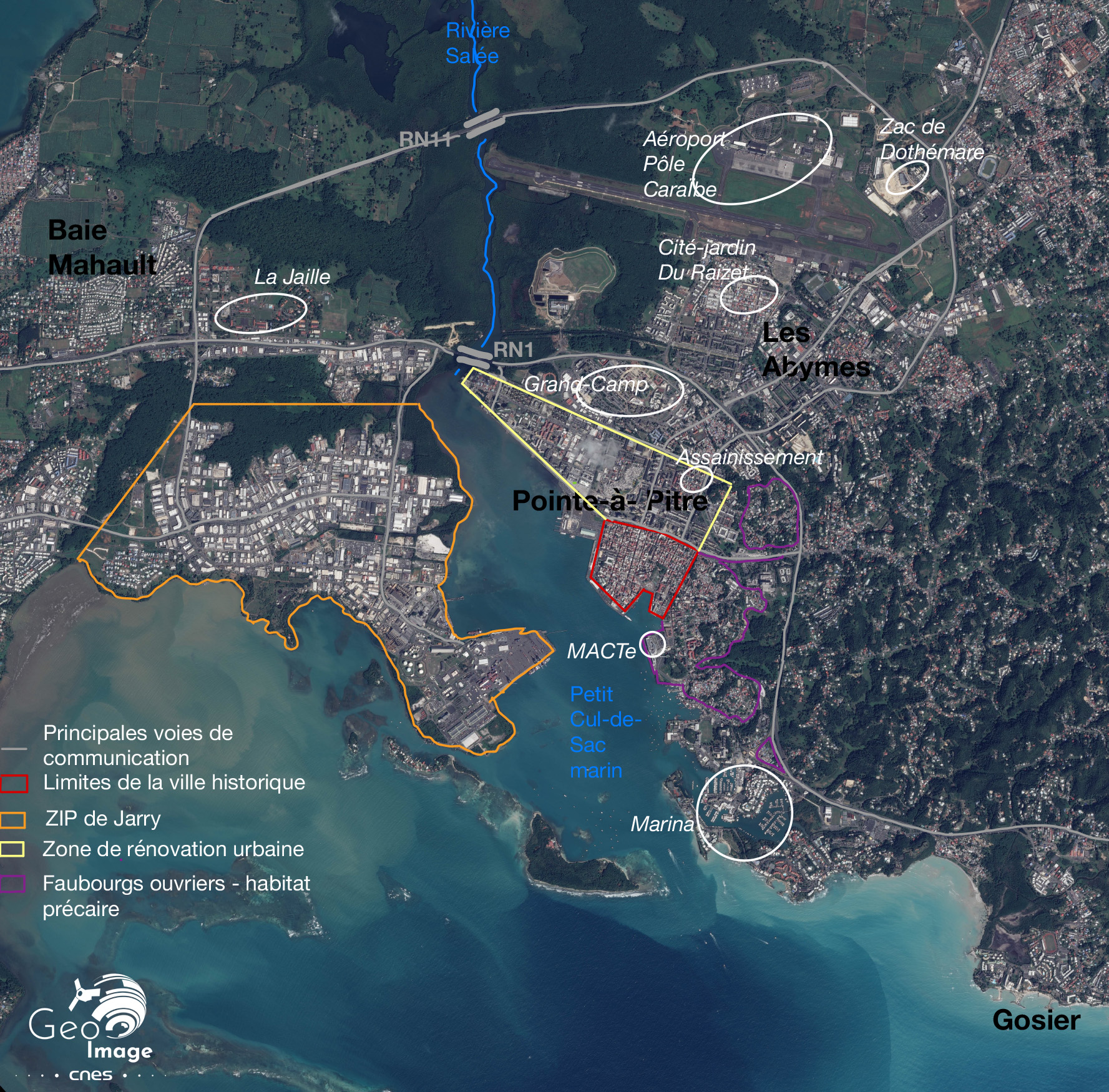 Au nord de Pointe à Pitre et du pont de la Gabarre (1), dans une zone de mangrove située au bord de la Rivière Salée (2) et sur des plaines de champs de cannes à sucre (terres fertiles de l’Habitation Malmaison à l’ouest du bourg des Abymes), s’est développée dans les années 1950 la construction du premier aérodrome, qui devient par la suite l’Aéroport Pôle Caraïbes (3), et le développement depuis une vingtaine d’années d’une ZAC tertiaire en plein essor.