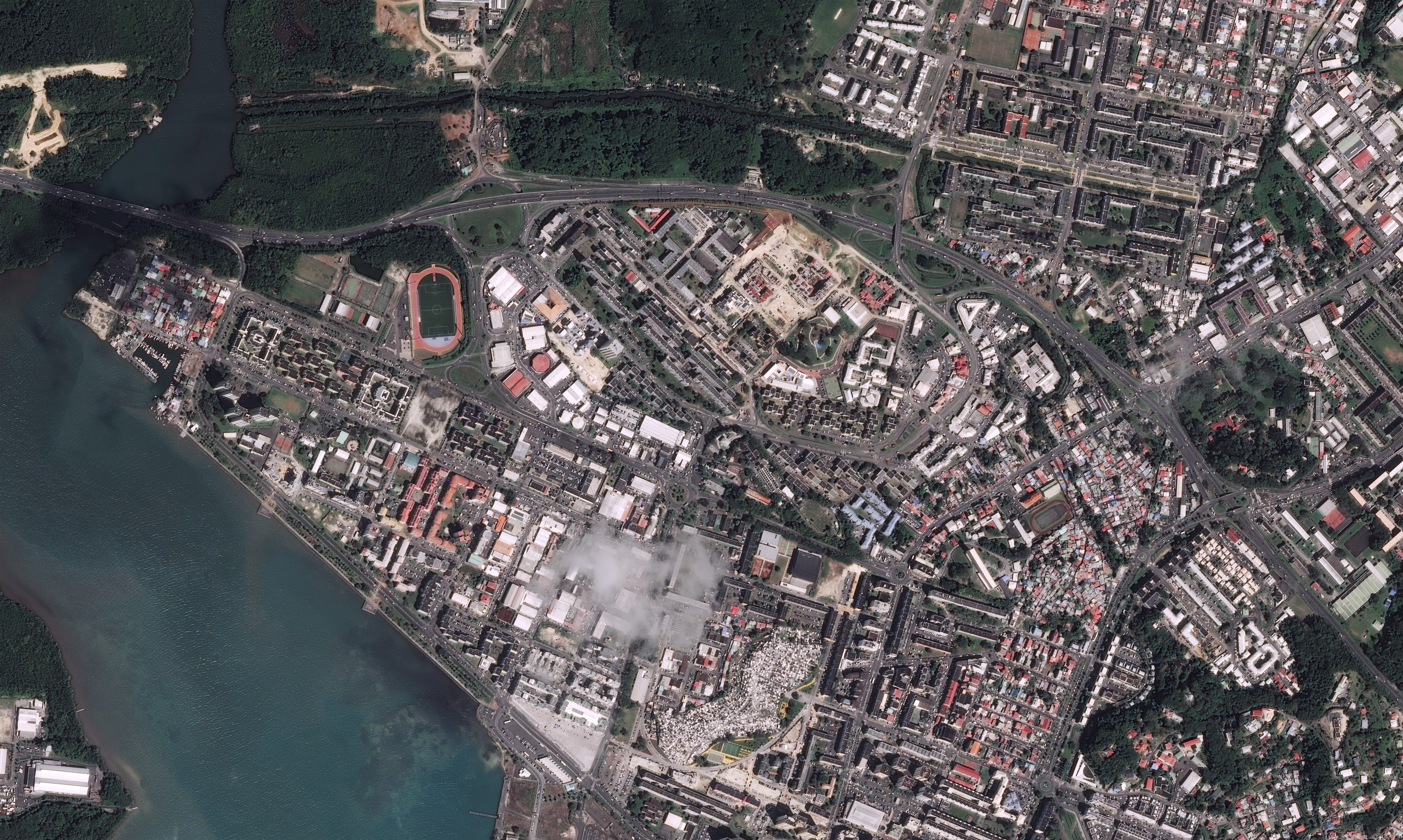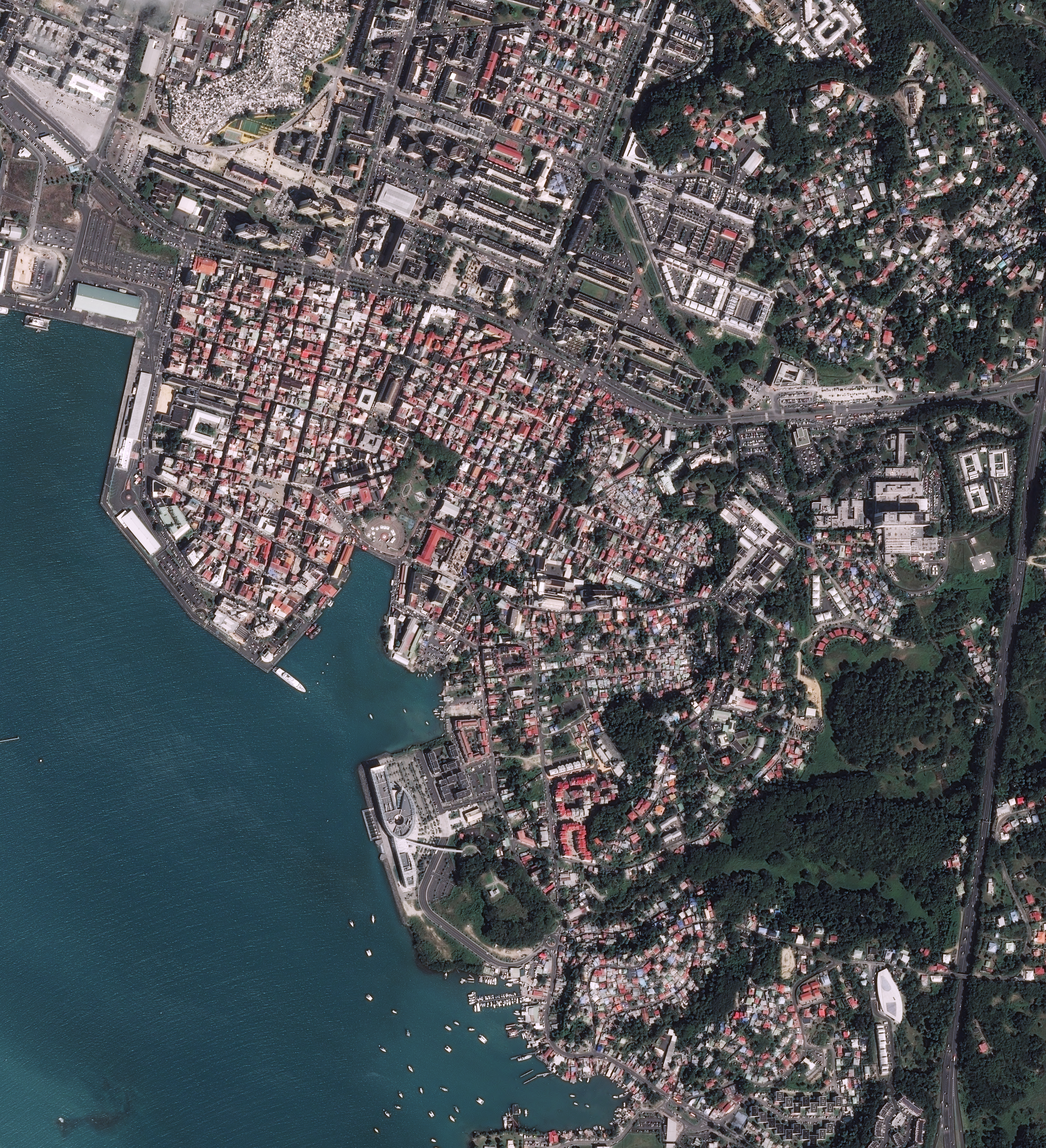 Ces zones d’habitat précaire se multiplient à partir du cyclone de 1928 en dépit du fait que de vastes rénovations urbaines aient été menées, entre 1958 et 1982, au nord des boulevards (4), puis dans la zone de Boissard (5) de 1982 à 2000. Certaines d’entre elles sont toujours visibles sur l’image à l’est (Fonds Laugier) et au sud-est (Cours Zamia, Forbin, Violet) de la ville (2).