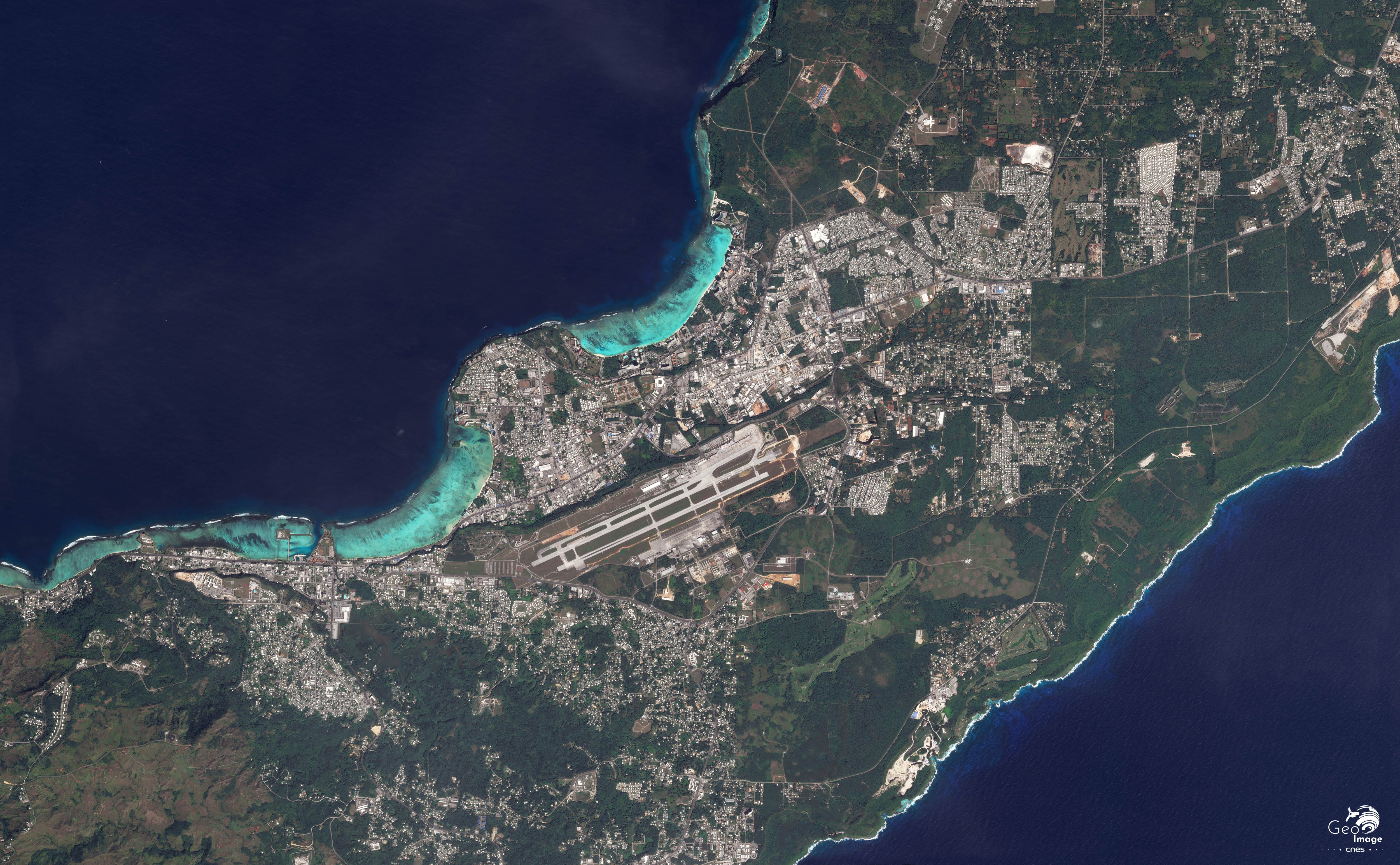 A l’est se déploie, bien visible sur l’image, l’immense base Andersen, du nom du général Roy Andersen (1904/1945), de l’US Air Force. Couvrant une superficie considérable, ce vaste complexe est constitué d’un grand aérodrome doté de deux très longues pistes et de ses nombreux annexes (maintenance et réparation, entrainement, stockage du carburant et des munitions, hôpitaux…). Au sud, cet ensemble intégré – véritable ville autonome - accueille aussi logements, garages, commissariat, magasins d’alimentations, station à essence, théâtre, cinéma…
