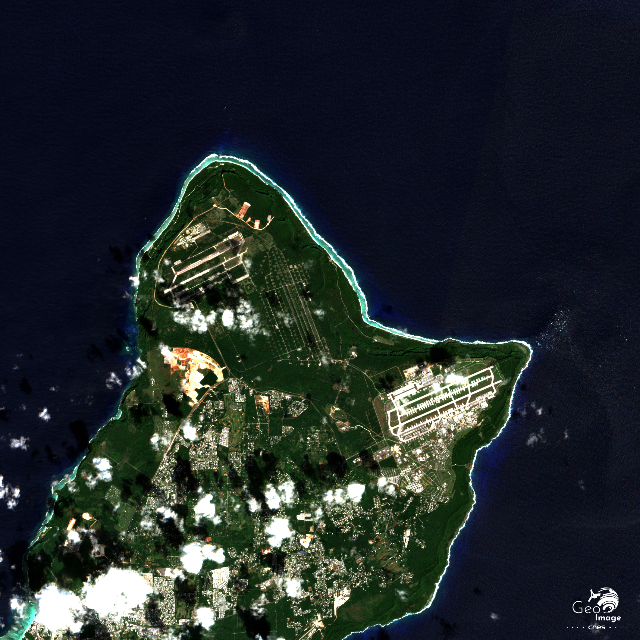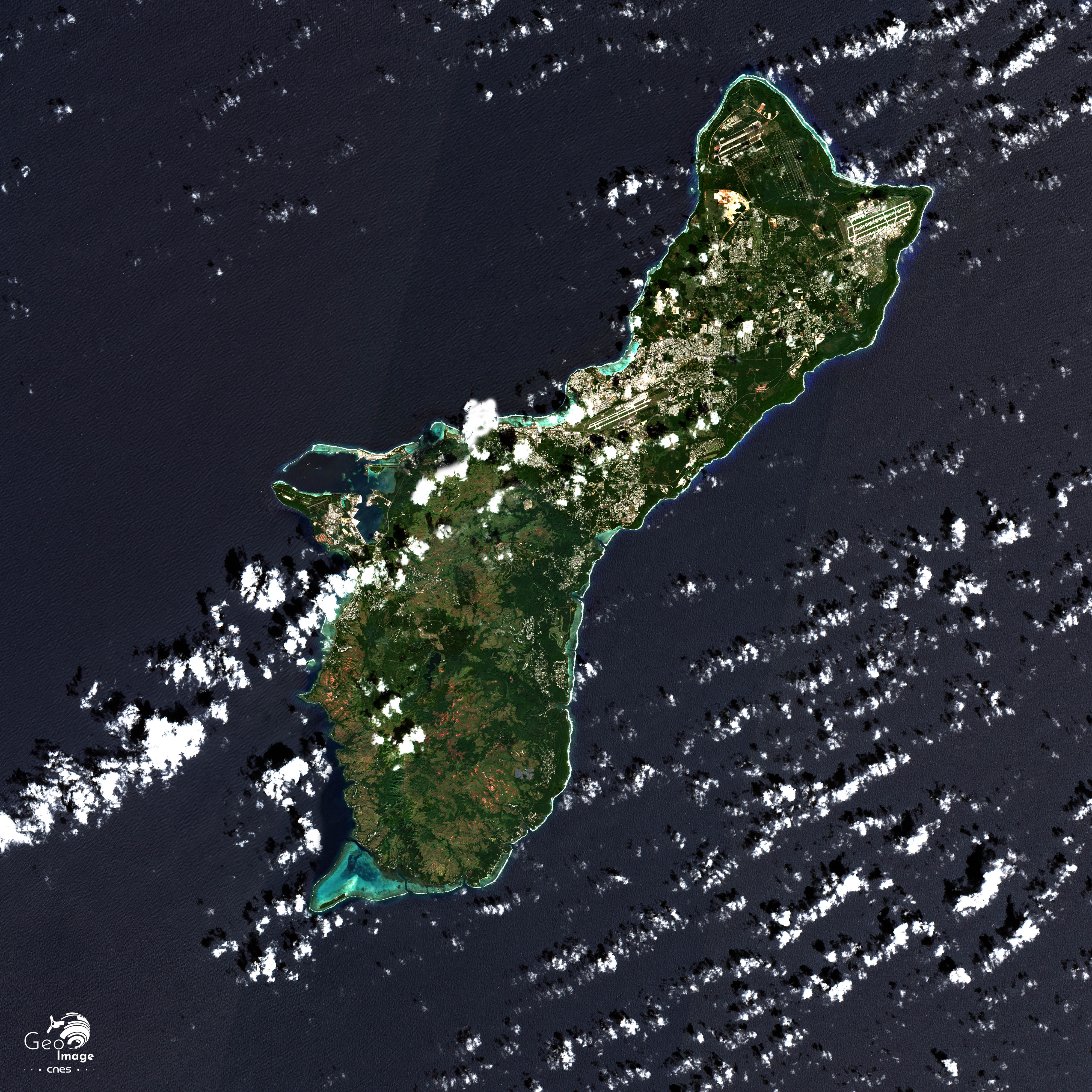 L’image couvre l’île de Guam, qui est longue et assez étroite. Elle est de petite taille puisqu’elle ne couvre que 549 km² et s’étend du nord au sud sur seulement 51 km et d’ouest en est de 6 km, dans sa partie la plus étroite, à 19 km au sud. L’importance des barrières coralliennes sur le littoral s’explique par son caractère tropical.