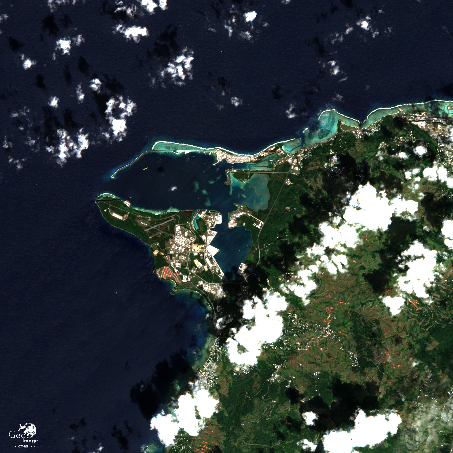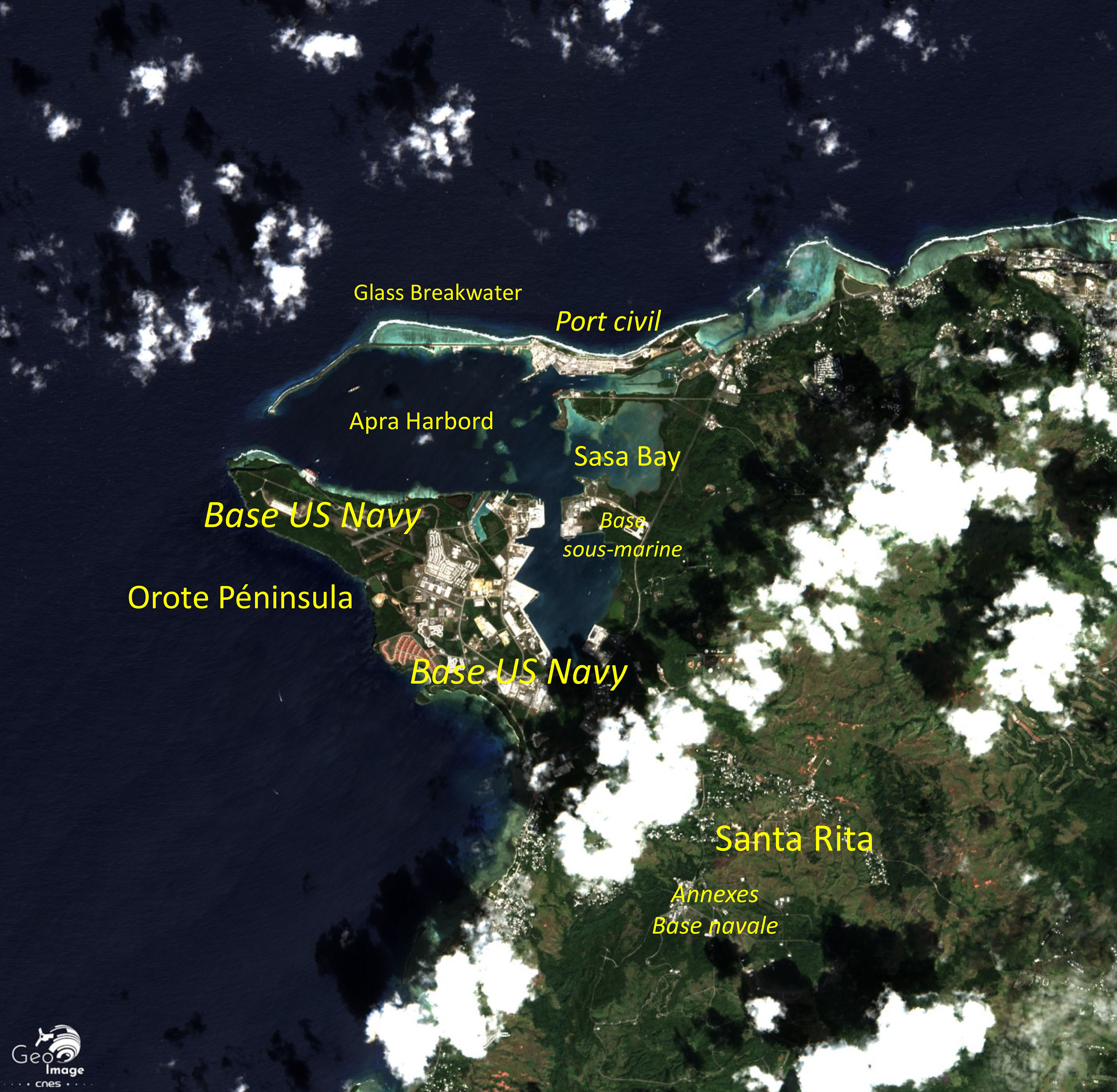 L’image se situe à l’est/sud-est de l’ile. Elle couvre un site exceptionnel : une vaste baie naturelle, plus ou moins profonde et bien aménagée par le surcreusement de bassins. Elle est protégée du large par les avancées de la presqu’île de la pointe d’Orote, au sud, et de la fine barrière de corail de Glass Breakwater au nord, elle-même consolidée par de nombreux terre-pleins.