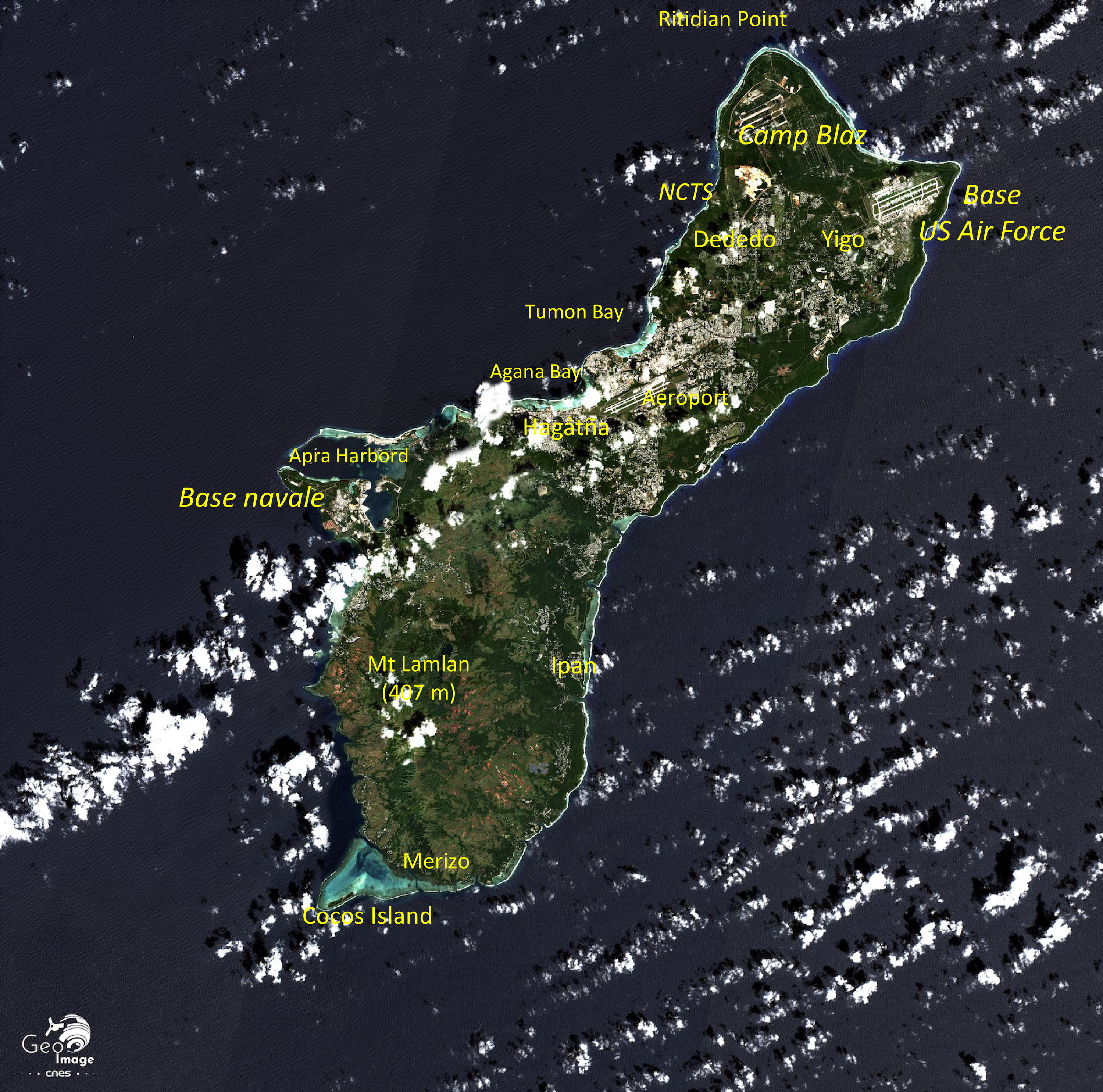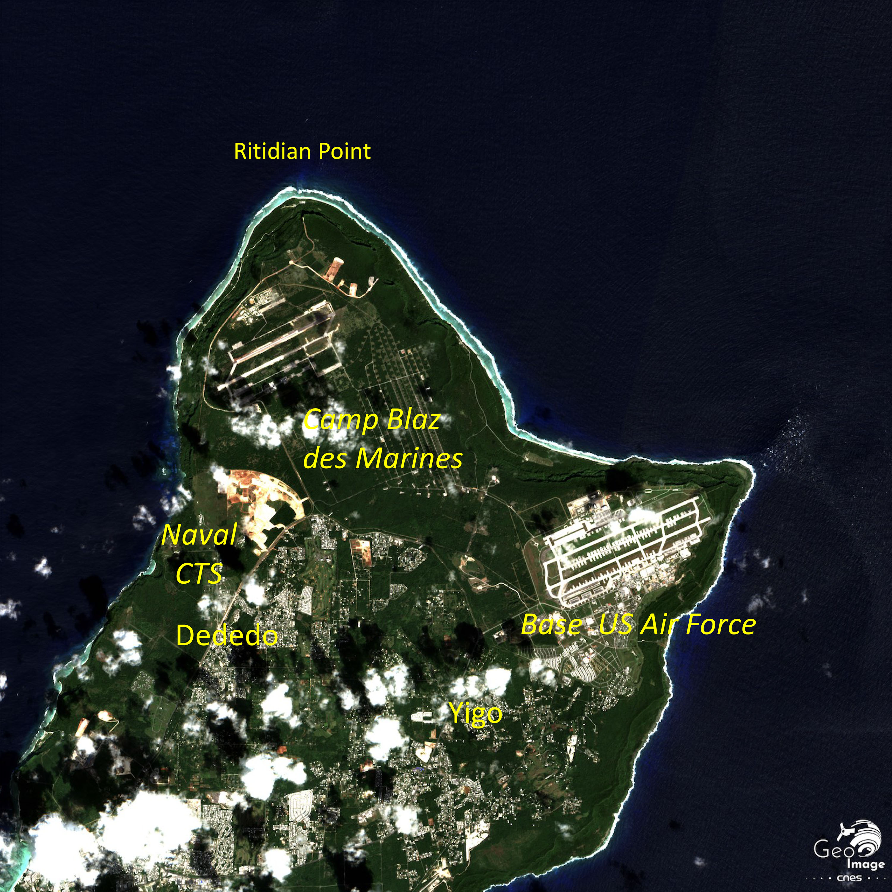 L’image couvre tout le nord de de l’île, qui appartient aux communes de Yigo à l’est et de Dededo à l’ouest. Deux ensembles militaires différents y sont présents.