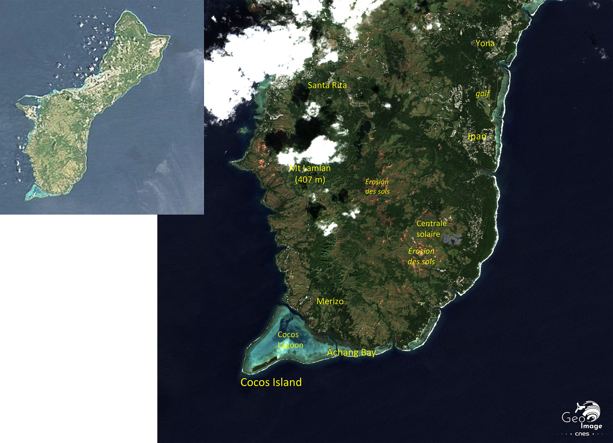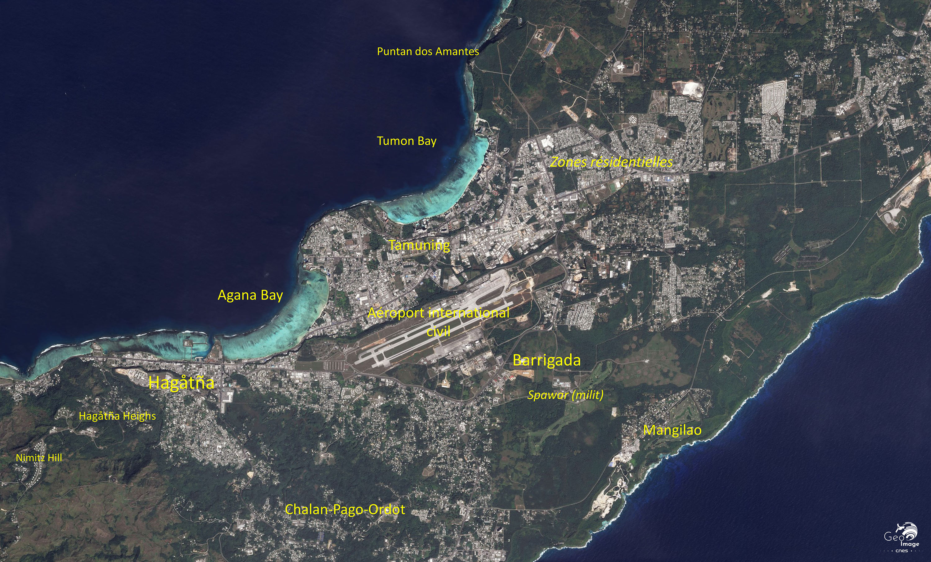 L’image témoigne de la forte urbanisation de la zone centrale de l’île qui est peuplée de 165 000 habitants (300 hab./km²). Liées à l’urbanisation, les densités y sont sur l’image de 400 à plus de 1000 habitants au km². Le centre historique du peuplement se situe en effet sur la côte ouest entre la capitale administrative d’Agana (Hagåtña), bien identifiable par le petit pointement triangulaire qui s’avance dans la mer, le promontoire littoral d’Oka (de forme ovale) et Tumuning dans la baie de Timon ourlée de plages de sables blancs au nord de l’aéroport international civil d’Agana.