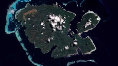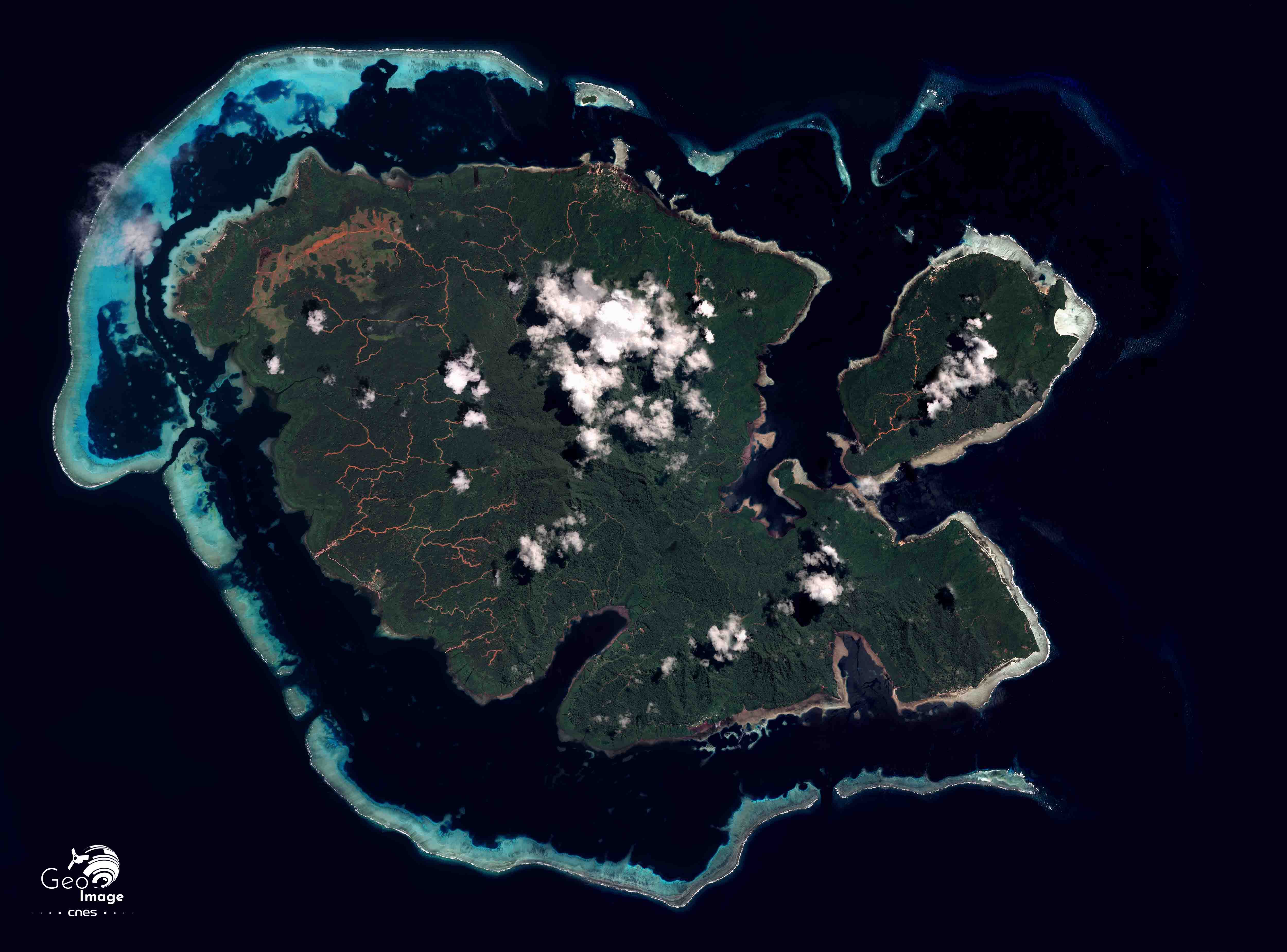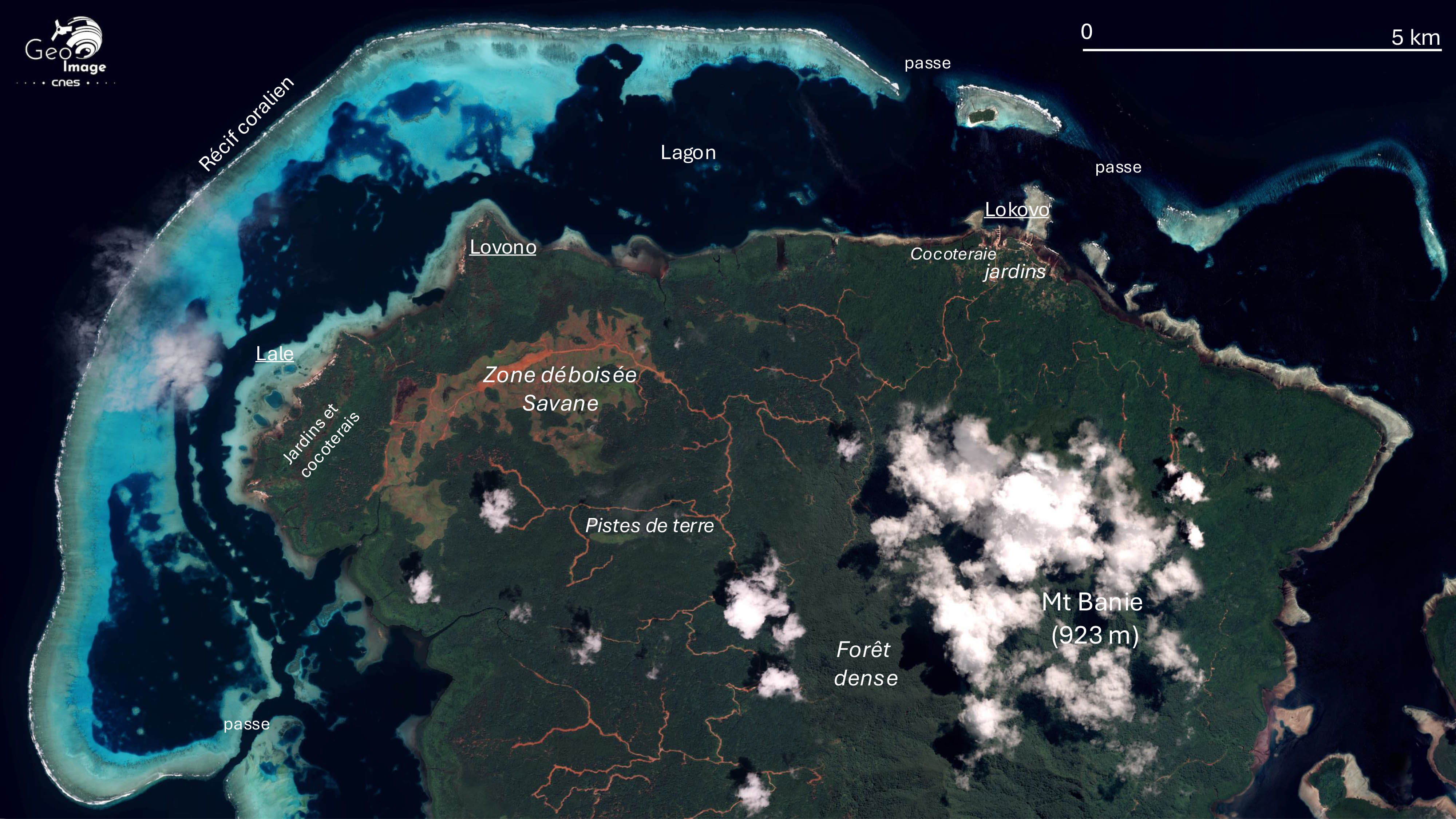 L’occupation de l’espace est limitée puisqu’on ne compte que 800 habitants pour toute l’île, soit une densité de seulement 4,6 hab./km². On est frappé sur l’image par la modestie de la présence humaine. Dans la partie centrale couverte par la forêt dense, seules les pistes, de couleur rouge ou ocre, sont bien visibles, surtout dans la partie occidentale. On doit relever qu’aucune piste ne fait le tour de l’île, le système viaire très segmenté souligne le fort cloisonnement de l’espace insulaire. Du fait des fortes contraintes topographiques, les villages littoraux sont connectés entre eux par la mer, malgré des installations maritimes particulièrement rudimentaires (absence de véritable site portuaire, de jetée, etc.). Ce système annulaire littoral est donc contraint, incomplet et fragile.