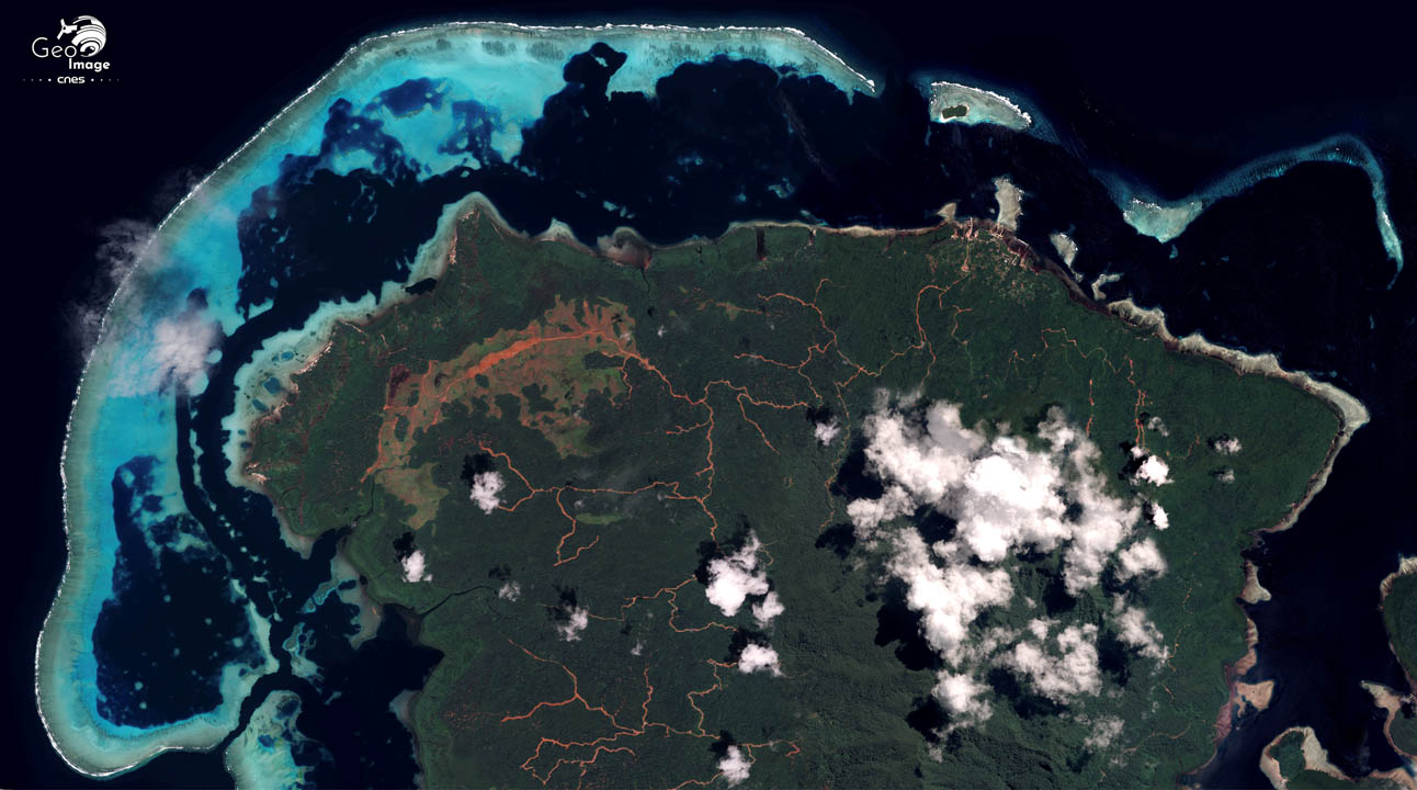 L’image couvre l’île de Vanikoro, constituée en fait des îles de Banie et Teanu. L’ensemble est de petite taille puisqu’il ne couvre que 173 km² et fait 25 km sur 20 km. Ancien volcan relativement récent (5 millions d’années), le mont Banie au centre culmine à 923 m, ce qui engendre de fortes pentes.