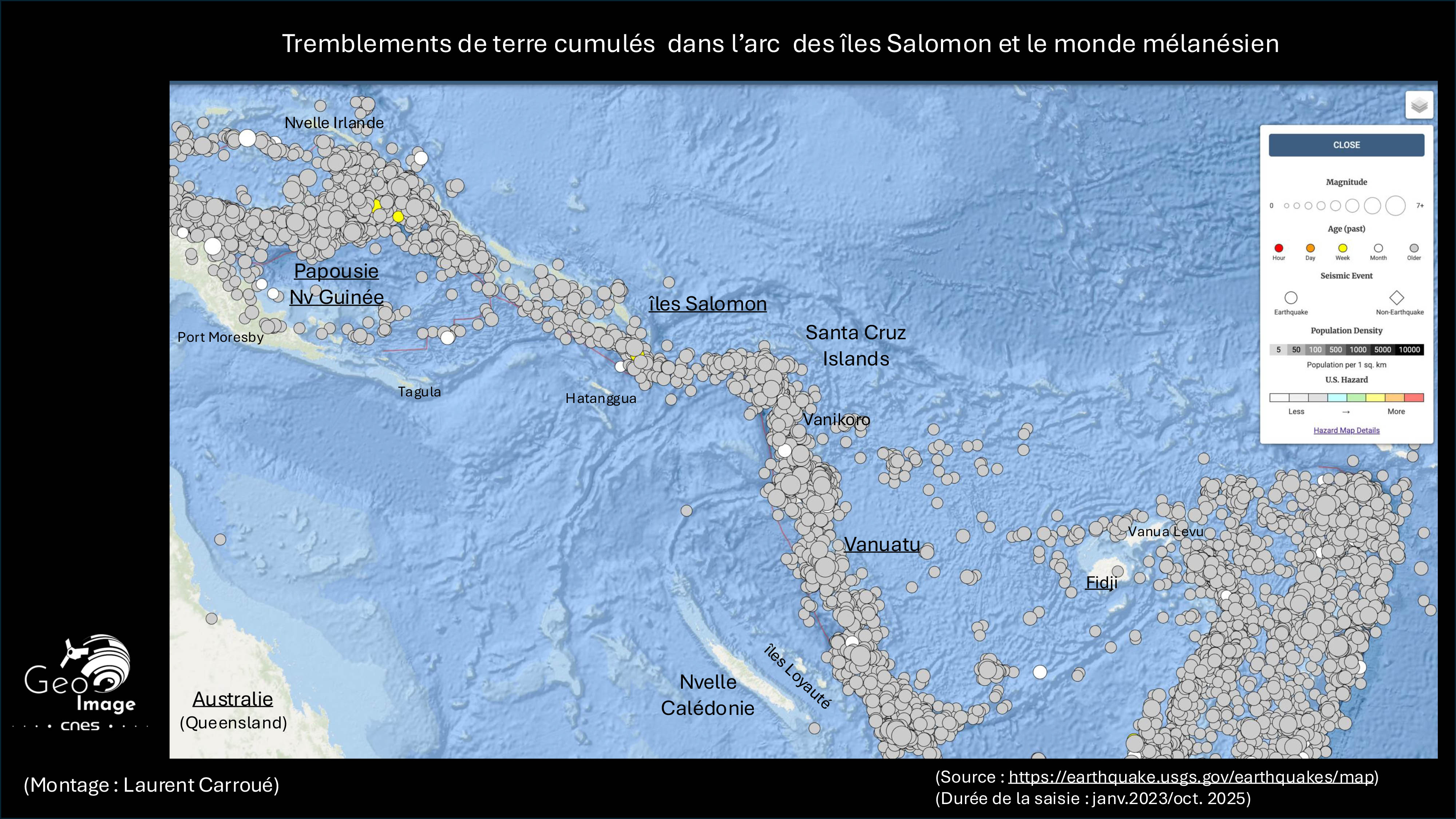 Au plan tectonique, l’arc des Salomon appartient à un segment complexe de la ceinture de feu du Pacifique. Il est encadré par des fosses actives : à l’ouest, la fosse de Nouvelle-Bretagne ; au sud, la fosse de San Cristóbal (souvent appelée « South Solomon Trench »), front actuel où la plaque indo-australienne (et ses micro-plaques adjacentes) plonge vers le N-NE sous l’arc à des vitesses pouvant approcher ~9–10 cm/an. La région juxtapose et cisaillent de nombreuses micro-plaques (Solomon Sea, Woodlark, South Bismarck, voire Trobriand), séparées par des failles coulissantes et des zones en extension / compression qui segmentent l’arc. L’histoire récente de l’arc est marquée par la collision avec l’immense plateau océanique d’Ontong Java : ce « choc » a bloqué l’ancienne subduction au nord (North Solomon Trench) et provoqué une inversion de polarité avec l’installation du front actuel au sud (San Cristóbal). Le résultat est un archipel à très forte activité sismo-volcanique. Les séismes de subduction majeurs ont généré des tsunamis destructeurs, par ex. le Mw 8,1 du 2 avril 2007 (arc central) et le Mw 8,0 du 6 février 2013 (Santa Cruz), chacun suivi d’un tsunami localement important. Côté volcanisme, la chaîne aligne des édifices émergés (Savo, Simbo, Tinakula) et sous-marins (Kavachi). Ce dernier très actif, édifie périodiquement des îlots éphémères et colore fréquemment les eaux de panaches hydrothermaux observés par satellite. Enfin, un exemple récent : en octobre 2017, l’éruption du Tinakula (VEI 3, 21–26 octobre) a produit un panache de cendres de plusieurs kilomètres d’altitude et perturbé le trafic aérien de l’archipel des Santa Cruz.