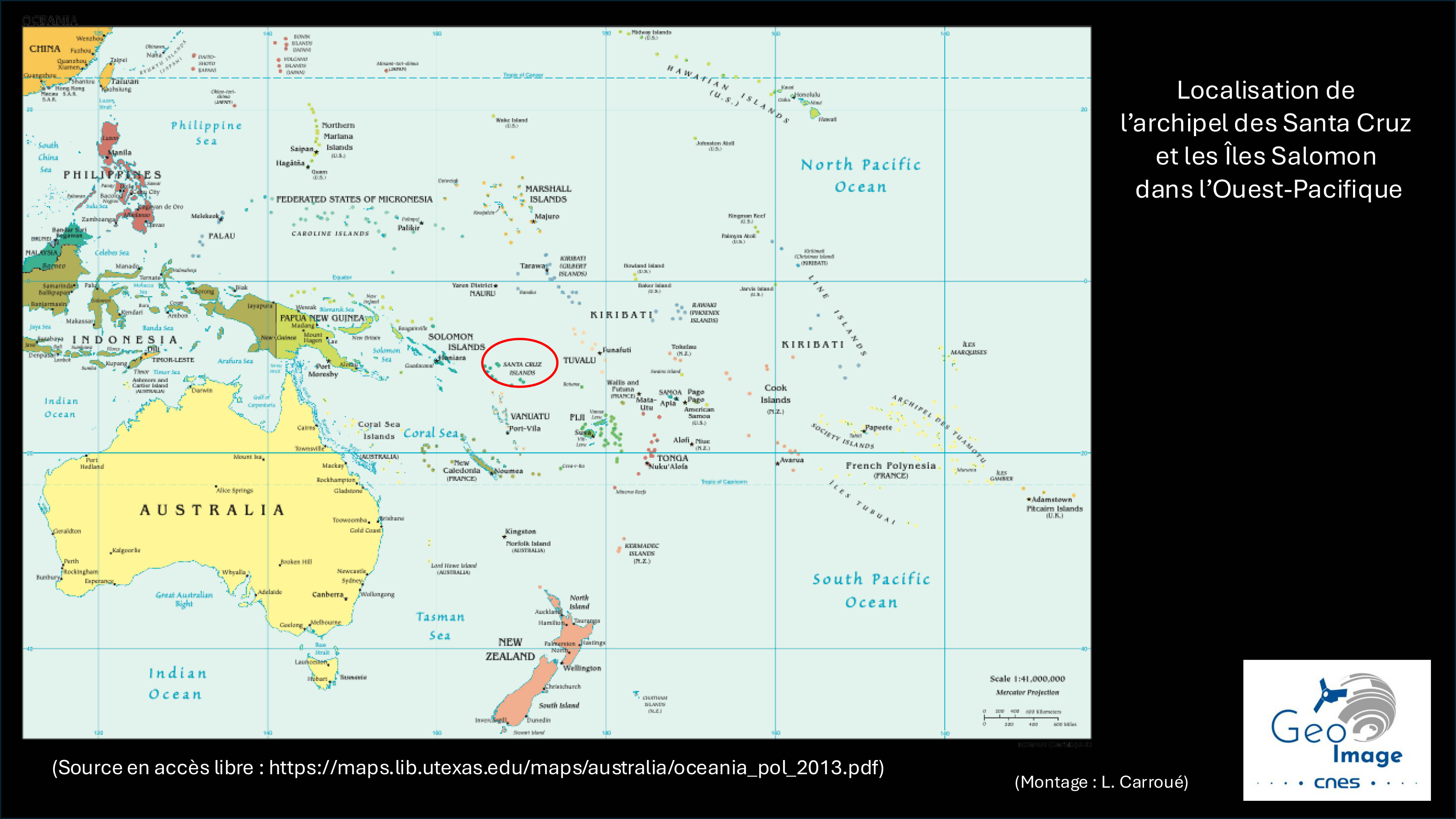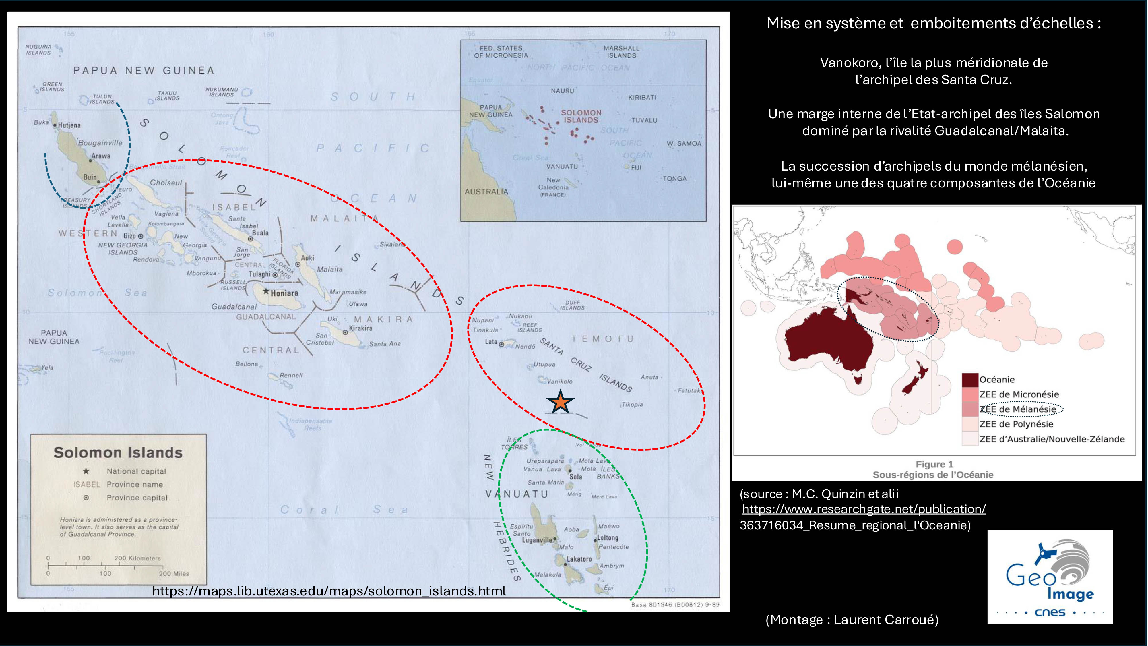 Pour analyser les structures et les dynamiques de l’île de Vanikoro, il est nécessaire, comme méthode d’analyse, de bien emboîter les différentes échelles spatiales et territoriales. Dans l’immensité de l’océan Pacifique, plus particulièrement dans sa partie océanienne, quatre grandes composantes sont en effet bien identifiables : la Micronésie, la Mélanésie, la Polynésie et l’Australie/Nouvelle-Zélande. L’État-archipel des îles Salomon est lui-même une des principales entités constitutives de la Mélanésie avec la Papouasie-Nouvelle-Guinée à l’ouest, le Vanuatu au sud-est, la Nouvelle-Calédonie au sud et les Fidji à l’est.