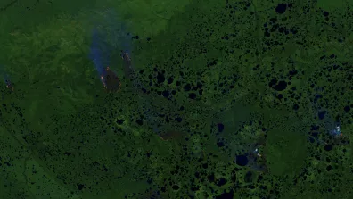 Image Sentinel-2 du 9 juillet 2020 prise en Russie à la frontière de la république de Sakha et de Krasnoiarsk. Cette image comme la première est en fausse couleur. Les nuages qui se forment au-dessus des sources de chaleur apparaissent en bleu. Ces pyrocumulonimbus bien visibles sur l'image se forment lors des incendies de grande ampleur. Ils sont caractérisés par une température élevée et une surabondance de particules fines. Les pyrocumulonimbus génèrent peu de précipitations mais peuvent provoquer des orages secs susceptibles de déclencher d'autres incendies.