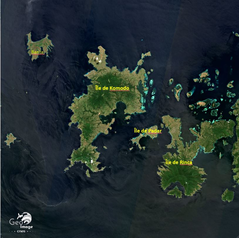 Estamos aquí en las Pequeñas Islas de la Sonde, que se sitúan entre las islas de Sumbawa y Flores. La isla de Komodo se extiende por unos 30 km norte/sur y 16 km oeste/este en su anchura máxima y cubre 390 km2 para culminar en el Monte Satalibo (735 m). Tiene una población de 2 000 habitantes, es decir una densidad de solamente 5 hab/ km². También muy recortada, la isla de Rinca cubre 196 km² y culmina en el Monte Dora Ora con 667 m. de altura. Finalmente, la pequeña isla de Padar cubre 20 km².