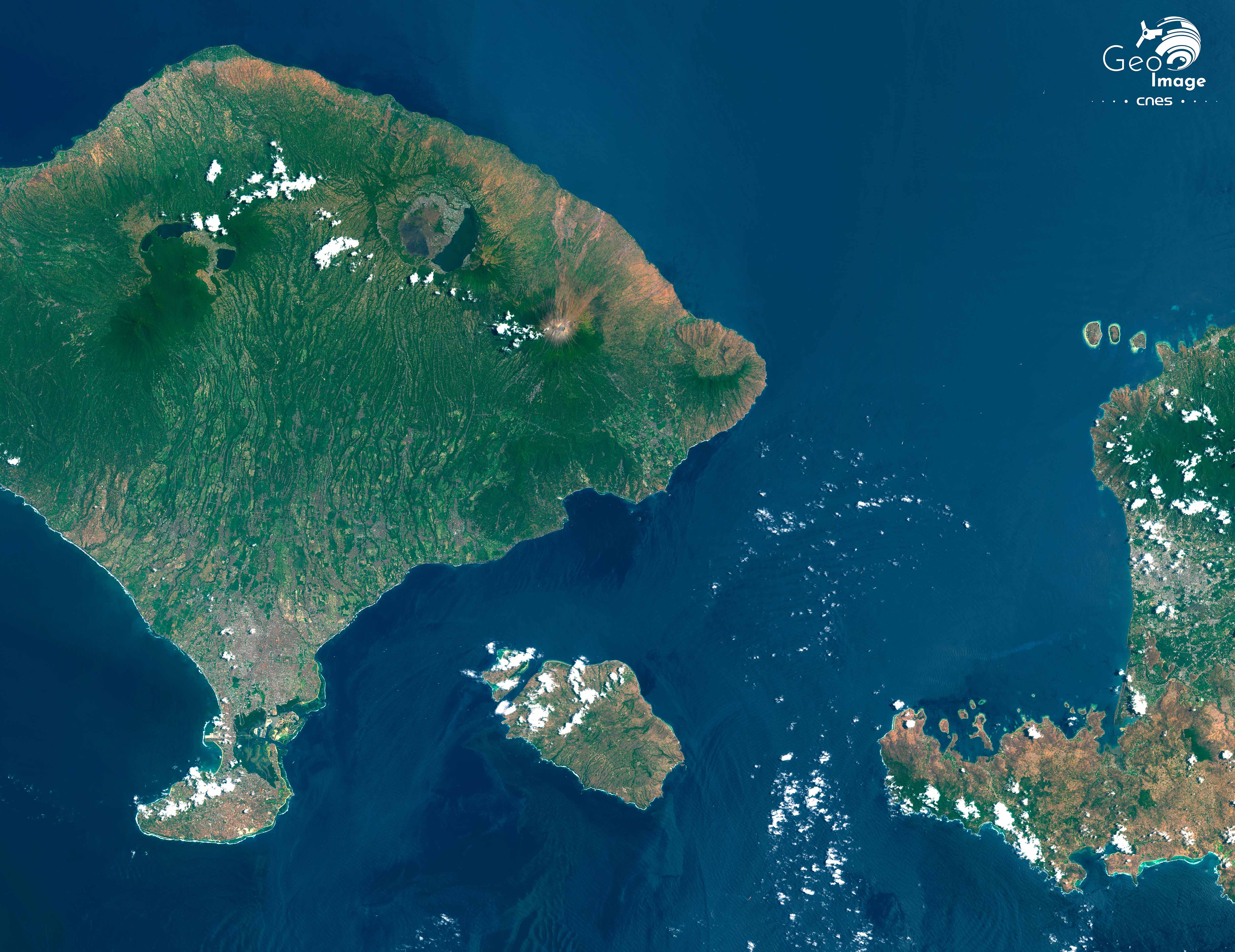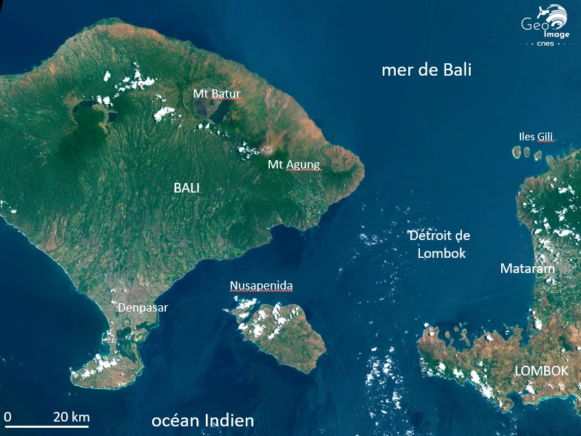 En approche terrestre, le détroit est le point de la plus grande proximité entre deux terres, ici deux îles – l’île de Lombok à l’est et l’île de Bali à l’ouest – séparées par les eaux. L’île de Bali couvre 5 590 km² est peuplée de 4,4 millions d’habitants (790 hab./km²) et culmine à 3 031 m au Mont Agung, un volcan très actif. Bien visible sur l’image, Denpasar est une agglomération de 2,3 millions d’habitants, et Mataram une agglomération de 400 000 habitants. L’île de Lombok s’étend sur 4 600 km², culmine à 3 727 m et est peuplée de 3,9 millions d’habitants, soit des densités élevées de 860 hab./km². Comme nous le verrons par la suite, sa largeur permet des flux transversaux Ouest/Est très denses : navettes de ferries, navires de pêche... L'entrée septentrionale se fait par les trois îles de Gili (Trawangan, Meno et Ayer) densément mises en valeur (749 hab./km²) et l'entrée méridionale par l'île de Nusa Penida (203 km², 315 hab./km²).