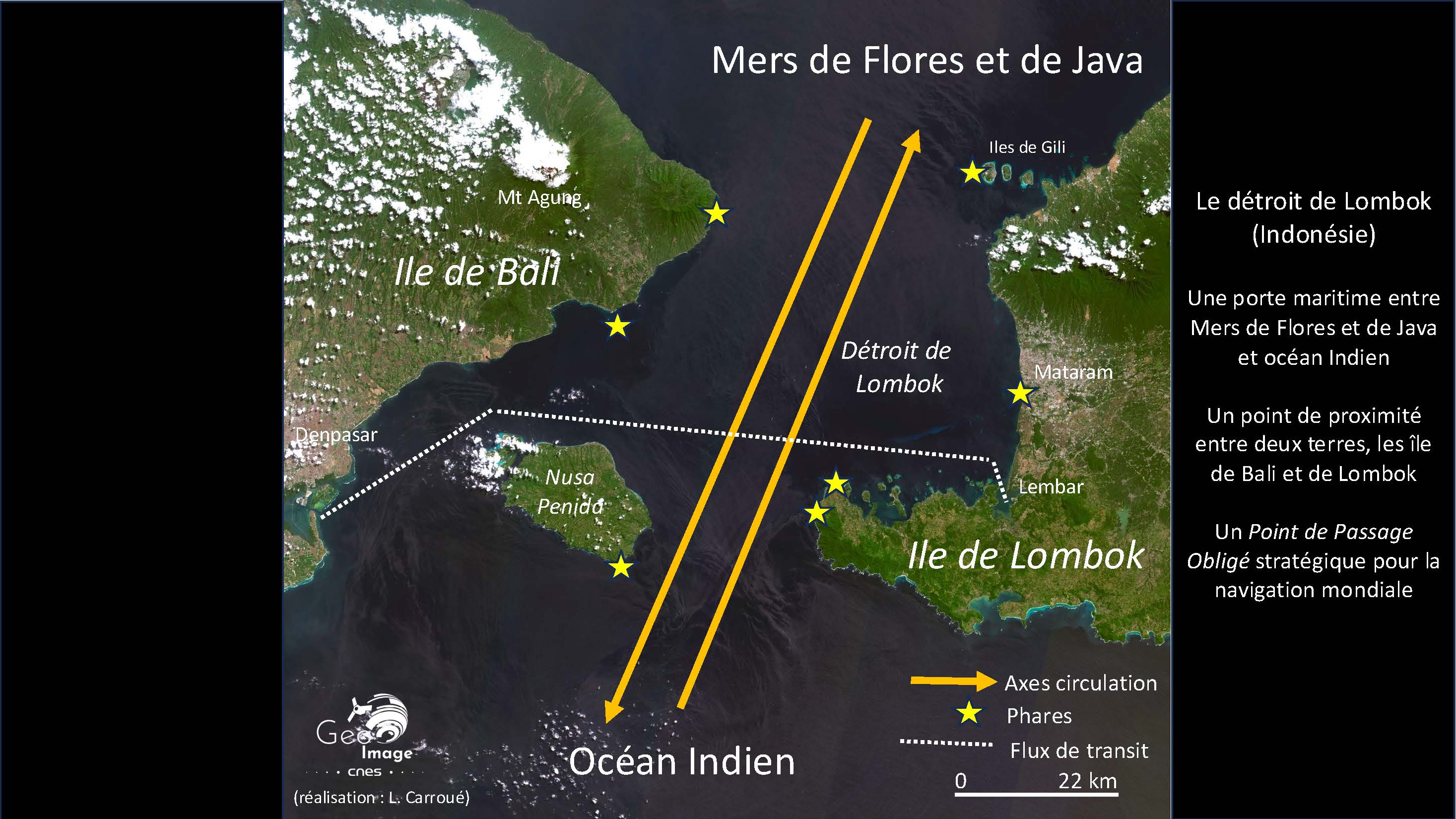 Dans l’immense archipel indonésien, le détroit de Lombok joue un rôle maritime considérable, mais trop méconnu, de par sa taille (56 km de long, 18 à 35 km de large) et surtout sa profondeur (seuil de 350 m). Pour la navigation internationale, c’est un point de passage obligé (PPO) pour les plus imposants pétroliers et minéraliers reliant le golfe Persique ou l’Australie à l’Asie de l’Est (Chine, Japon, Corée du Sud), car ceux-ci ne peuvent emprunter les détroits trop peu profonds de Malacca (25 m) ou de la Sonde (20 m). Lombok fait donc partie des 15 points de passage obligés qui polarisent 80 % de la valeur du trafic maritime mondial. De plus, c’est en hydrographie l’un des principaux passages du courant maritime indonésien (ITF) qui bascule d’immenses quantités d’eau chaude de l’océan Pacifique vers l’océan Indien, jouant ainsi un rôle considérable dans les dynamiques maritimes et atmosphériques du système-Terre. En biogéographie (flore, faune) y passe la ligne « Wallace » qui sépare deux des huit grandes écozones pavant le globe : le monde indomalais ou indo-himalayen à l’Ouest et le monde australasien à l’Est. Enfin, il sert d’exutoire au fameux courant de transit indonésien (ITF), l’Insulinde servant de seuil entre l’océan Pacifique et l’océan Indien.