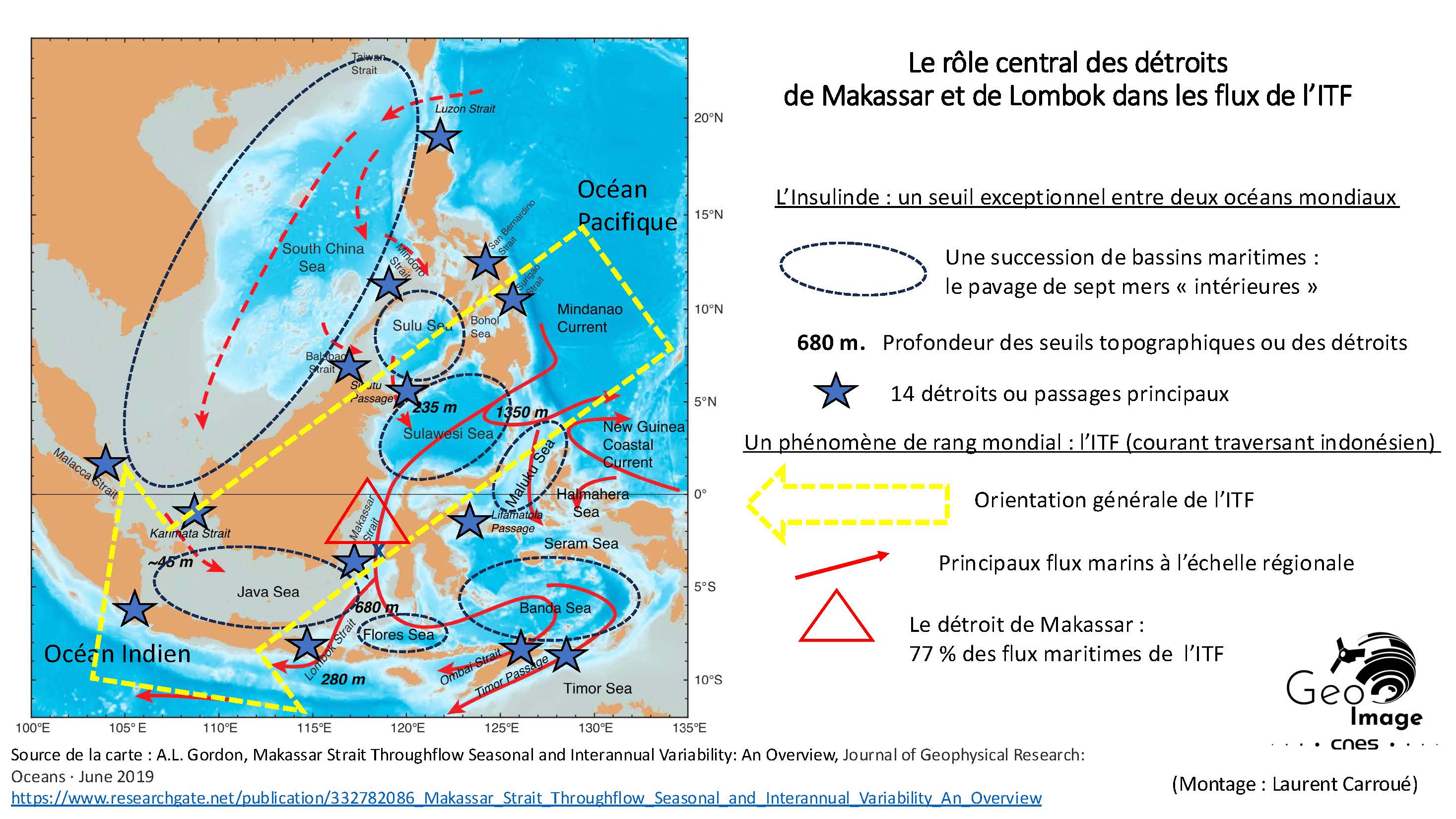Pour comprendre l’importance de cette région dans la circulation maritime mondiale, il faut changer impérativement d’échelle et passer à celle du globe : se trouve ici un vaste seuil topographique et maritime qui constitue la seule voie d’échange interocéanique de l’océan mondial dans la zone tropicale. Décrit pour la première fois en 1961 seulement, mais depuis largement étudié par les océanographes, le Courant Océanique Indonésien (ITF, Indonesian Throughflow) est un très puissant courant marin entraîné par le fort différentiel de gradient de pression entre l’Océan Pacifique et l’Océan Indien, qui débouche sur une différence de 30 cm du niveau moyen des mers. L’ITF déverse donc les eaux plus chaudes, moins salées et topographiquement plus élevées de l'Ouest de l’Océan Pacifique vers les eaux plus froides, plus salées et plus basses de l’Océan Indien, en traversant les archipels philippin et indonésien. L’ITF explique que les eaux de ces archipels se caractérisent par de fortes turbulences et une importante dissipation de chaleur.