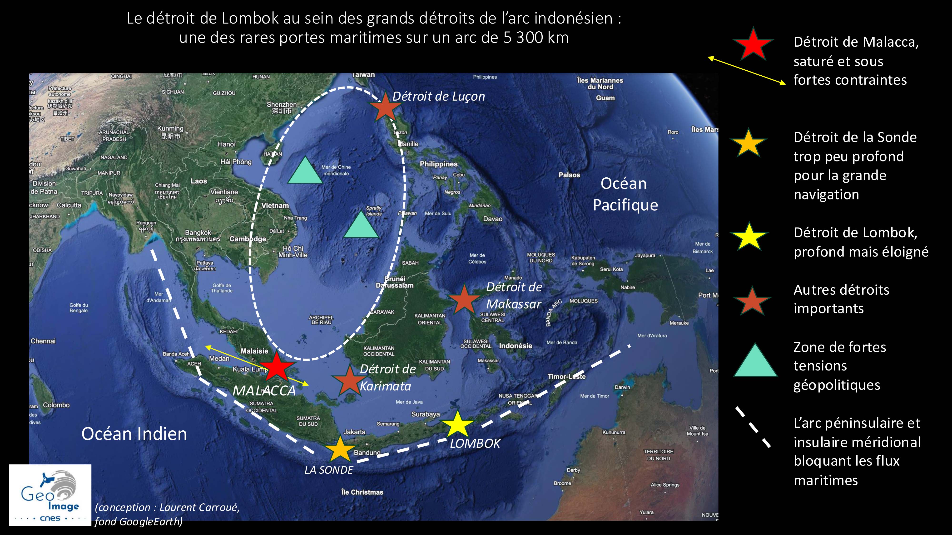 Surtout, l’archipel indonésien constitue avec l’arc de la Sonde dans sa partie méridionale une barrière insulaire ouest/est de 5 300 km. Mais malgré sa longueur, cet arc est doté de rares portes maritimes en permettant le franchissement Nord/Sud. On compte en effet seulement huit détroits, dont d’Ouest en Est : Malacca, La Sonde, Bali, Lombok, Alas, Sape, Alor et Timor (avec Ombeï et Wetar). Dans cet ensemble, seuls les détroits de Malacca, Lombok et Timor disposent de voies de navigation de haute mer ; les autres étant trop étroits ou trop peu profonds. Mais le détroit de Malacca est lui-même saturé et trop étroit pour accueillir les navires les plus importants qui doivent donc impérativement passer par le détroit de Lombok.