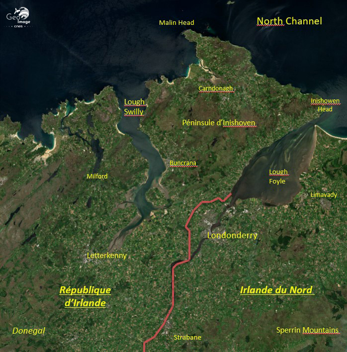 Londonderry dans son cadre régional : une ville de fond d’estuaire, en position d’abri littoral au fond d’une baie aujourd’hui aux limites de la frontière entre l’Irlande et l’Irlande du Nord.