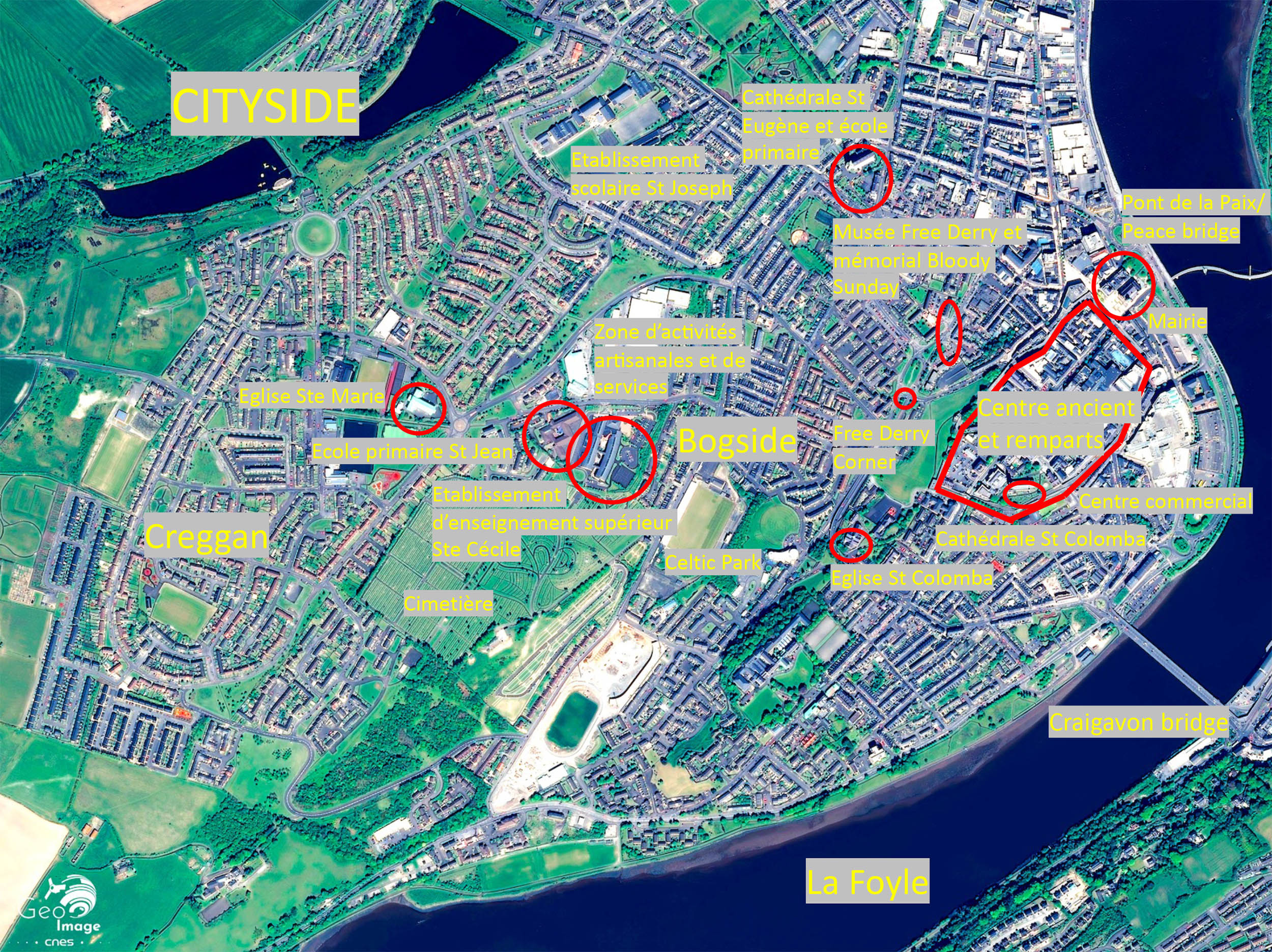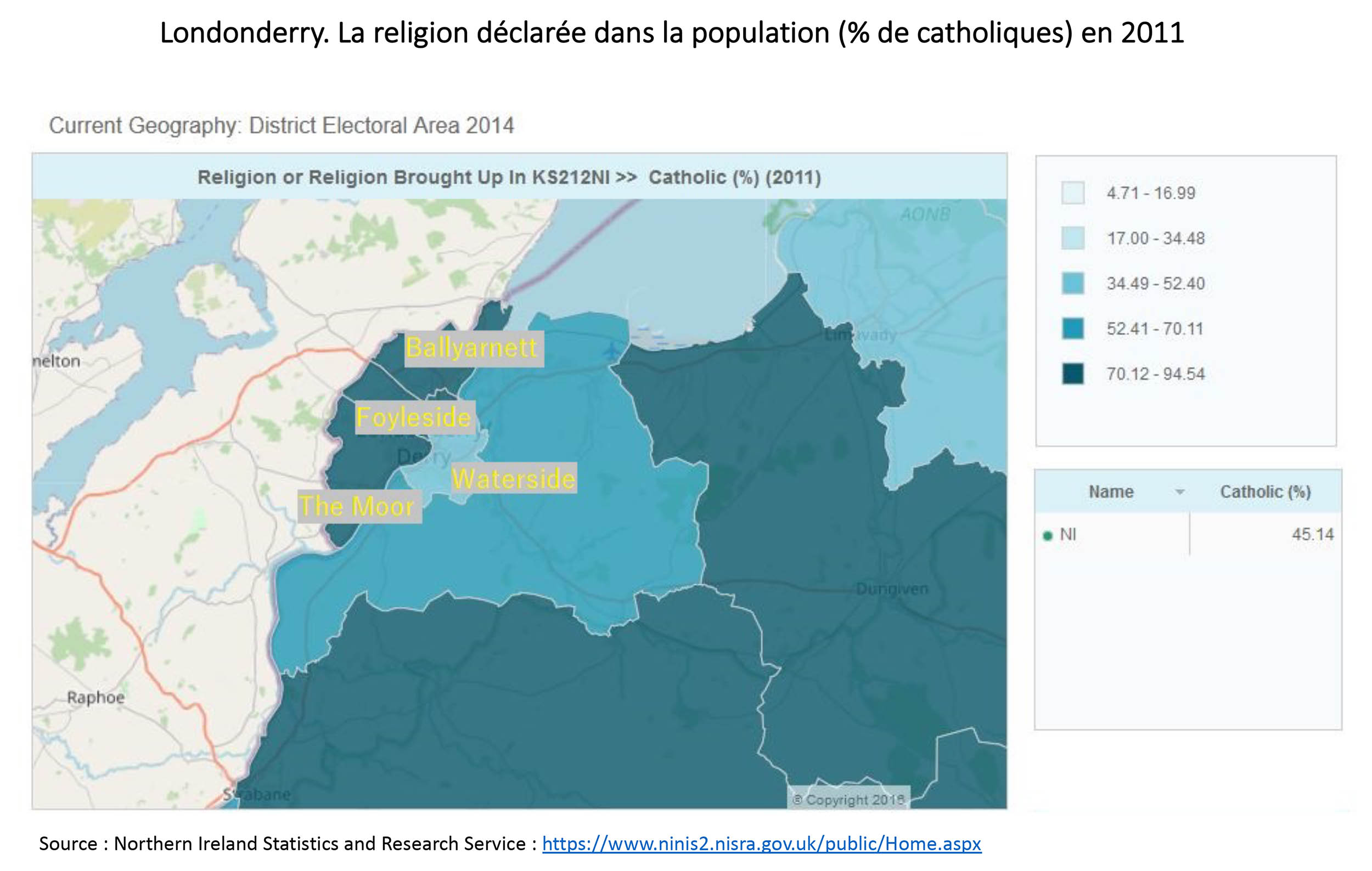 La partie de la ville couverte par cette image se situe plus précisément dans la circonscription électorale de Foyleside. Le découpage électoral validé pour les élections des conseillers dans les collectivités locales - « district councils » - de 2014 en effet Londonderry en quatre circonscriptions : The Moor, Foyleside, Ballyarnett et Waterside. Les trois premières se situent sur la rive gauche de la Foyle, du sud vers le nord, et sont quasiment exclusivement catholiques puisqu’elles concentrent une population catholique respectivement de 92,55 %, 90,75 % et 94,54 %. Par contre, de l’autre côté de la Foyle, la situation est bien différente : dans la circonscription de Waterside, la population n’est catholique qu’à 47,18 %.