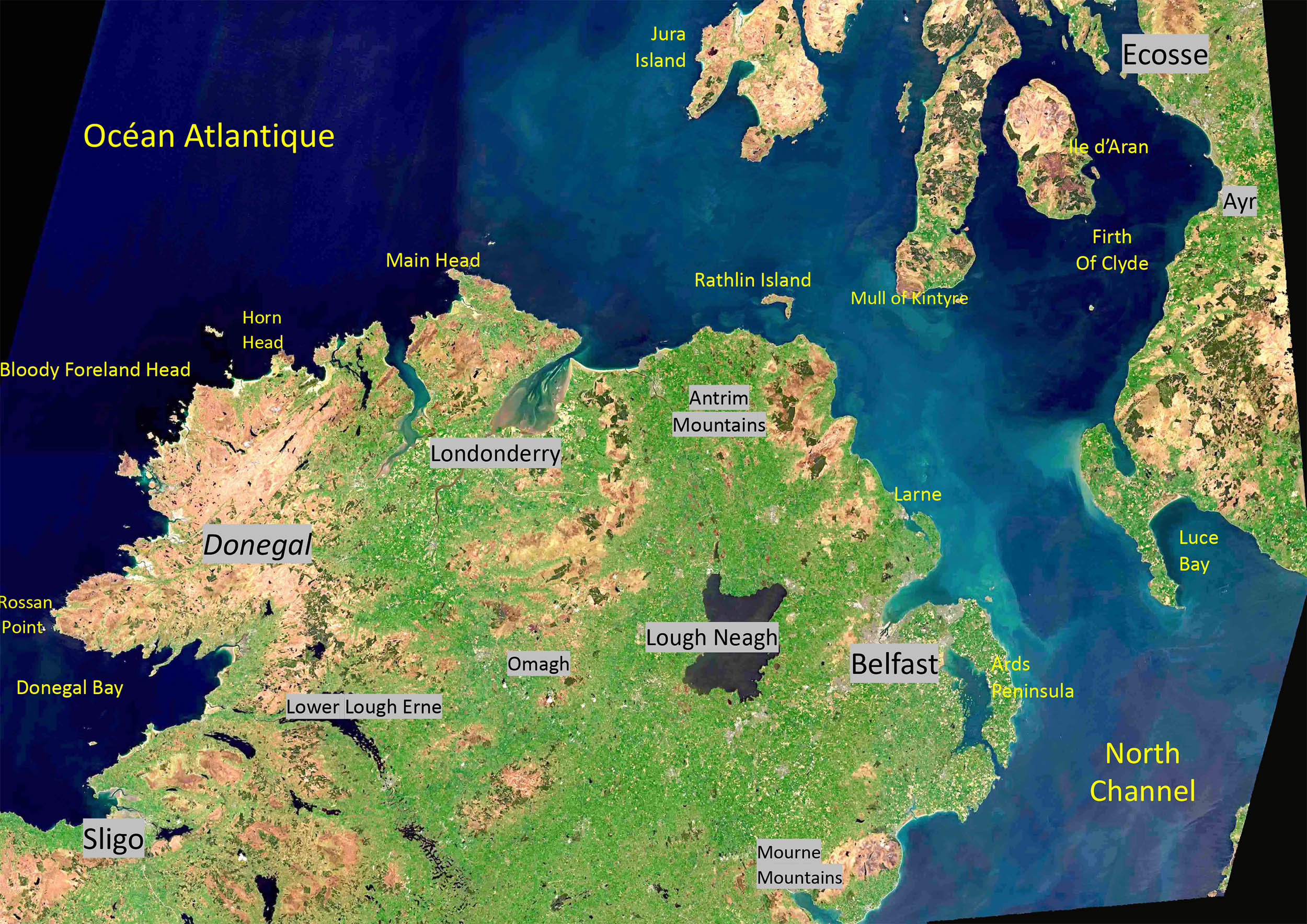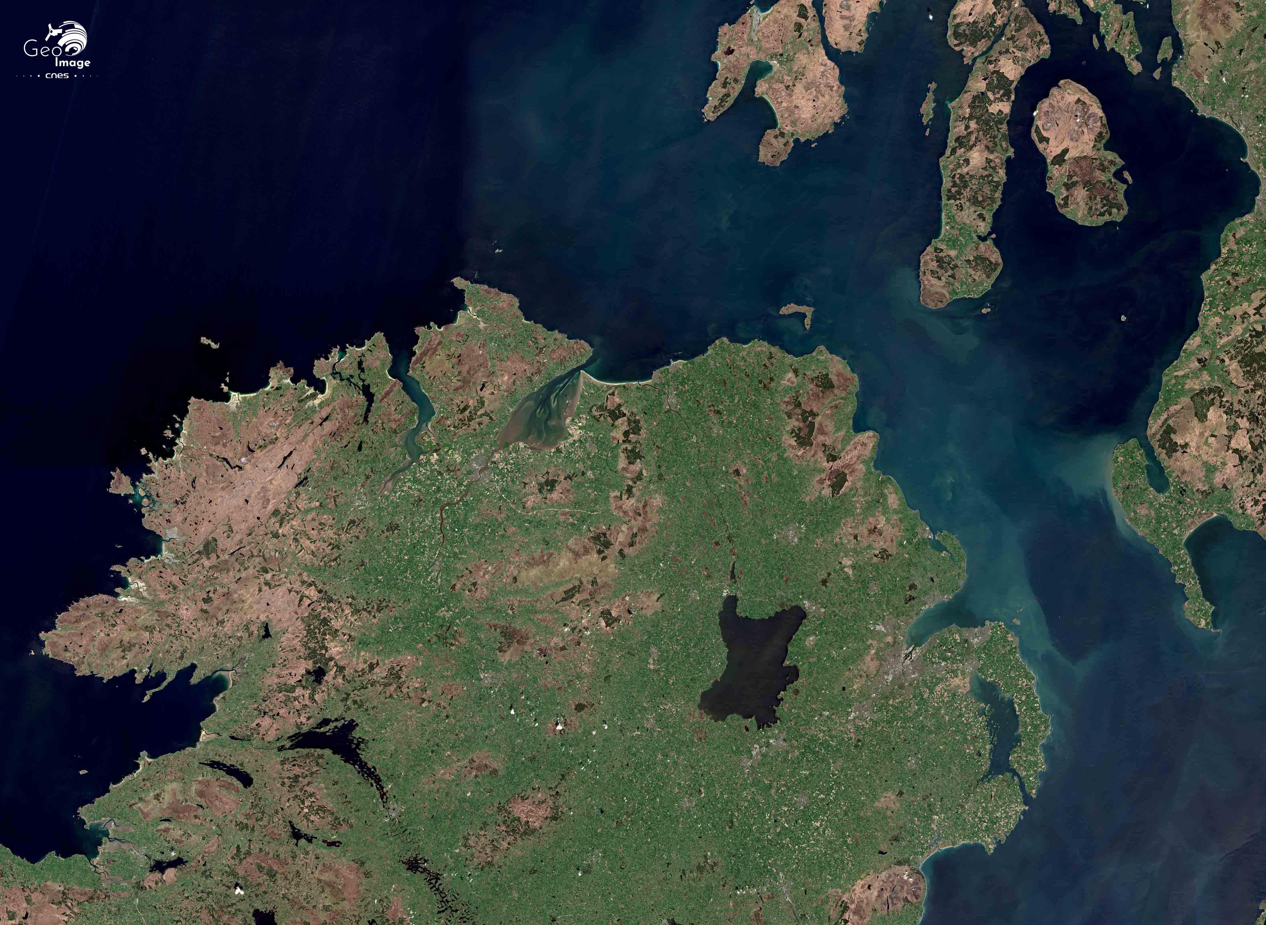 Plus au nord-est comme le montre l’image complémentaire, à l’entrée de l’estuaire de la Foyle, sur la rive droite se trouve le port de Londonderry, ou Foyle Port, qui est un port autonome qui ne dépend d’aucune structure ou agence de l’État britannique. Initialement situé au cœur de la ville de Londonderry, il a été déplacé en 1993 à l'emplacement actuel de Lisahally, où les eaux sont suffisamment profondes pour accueillir des navires d'une capacité allant jusqu'à 65 000 tonnes et mesurant 215m.