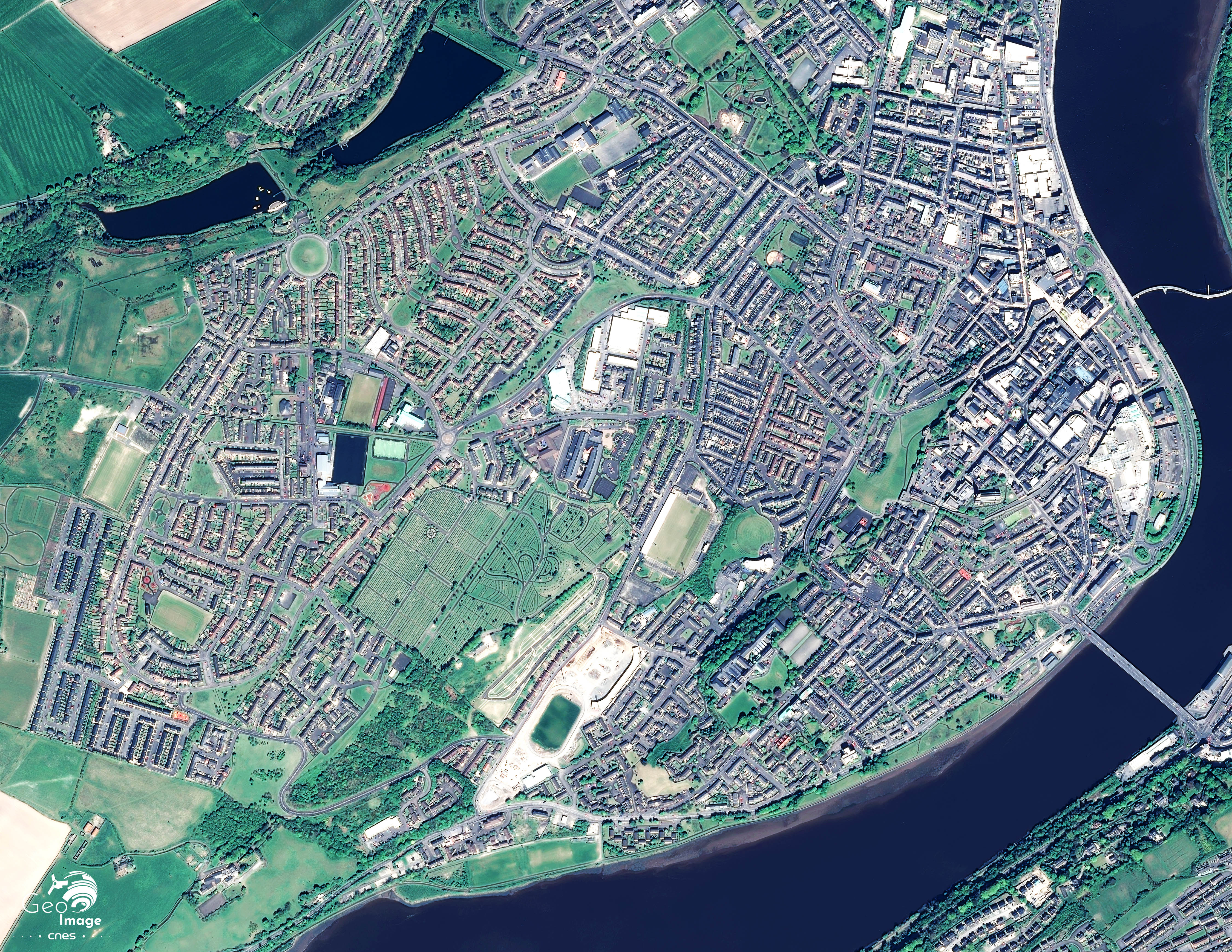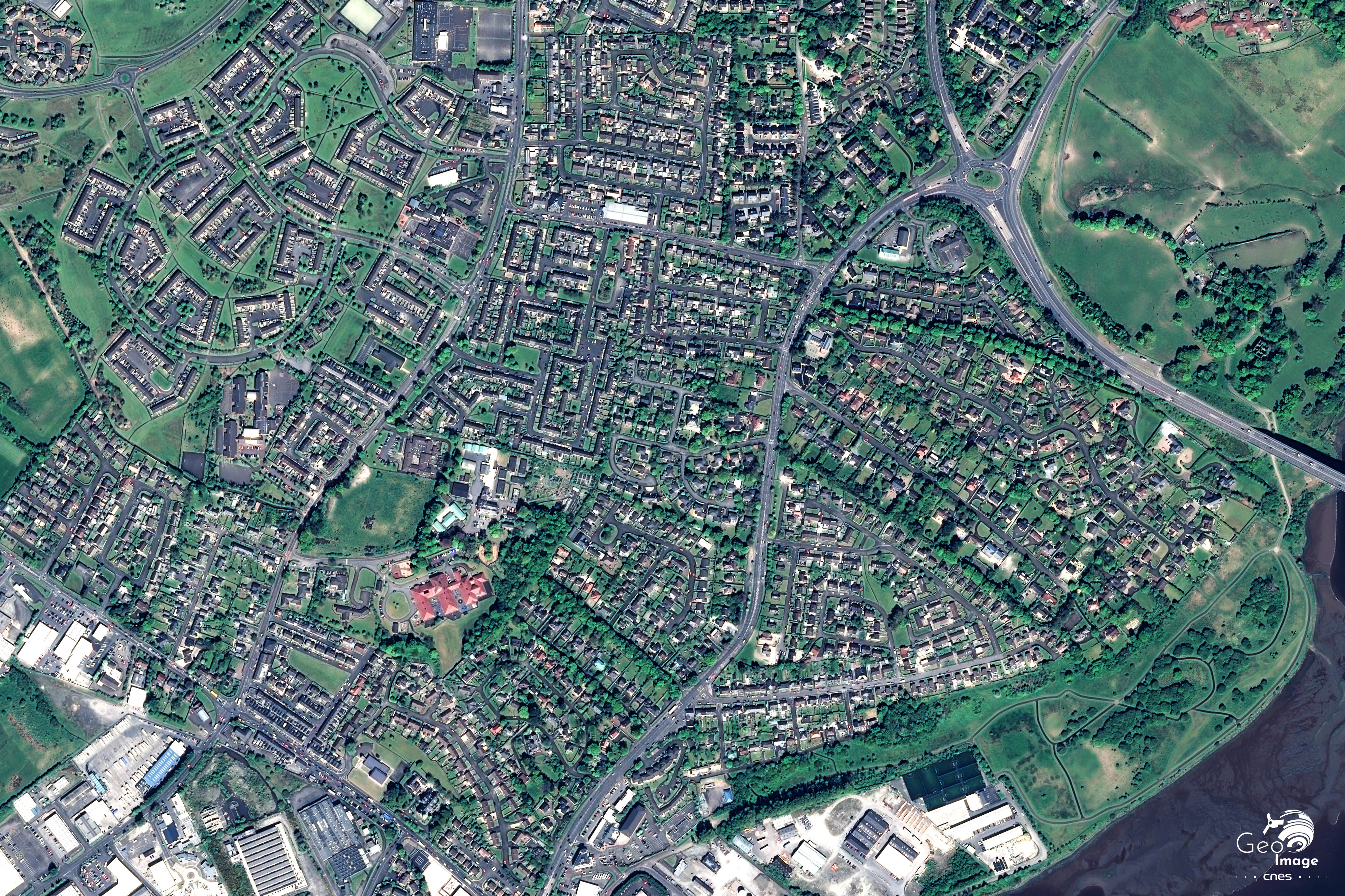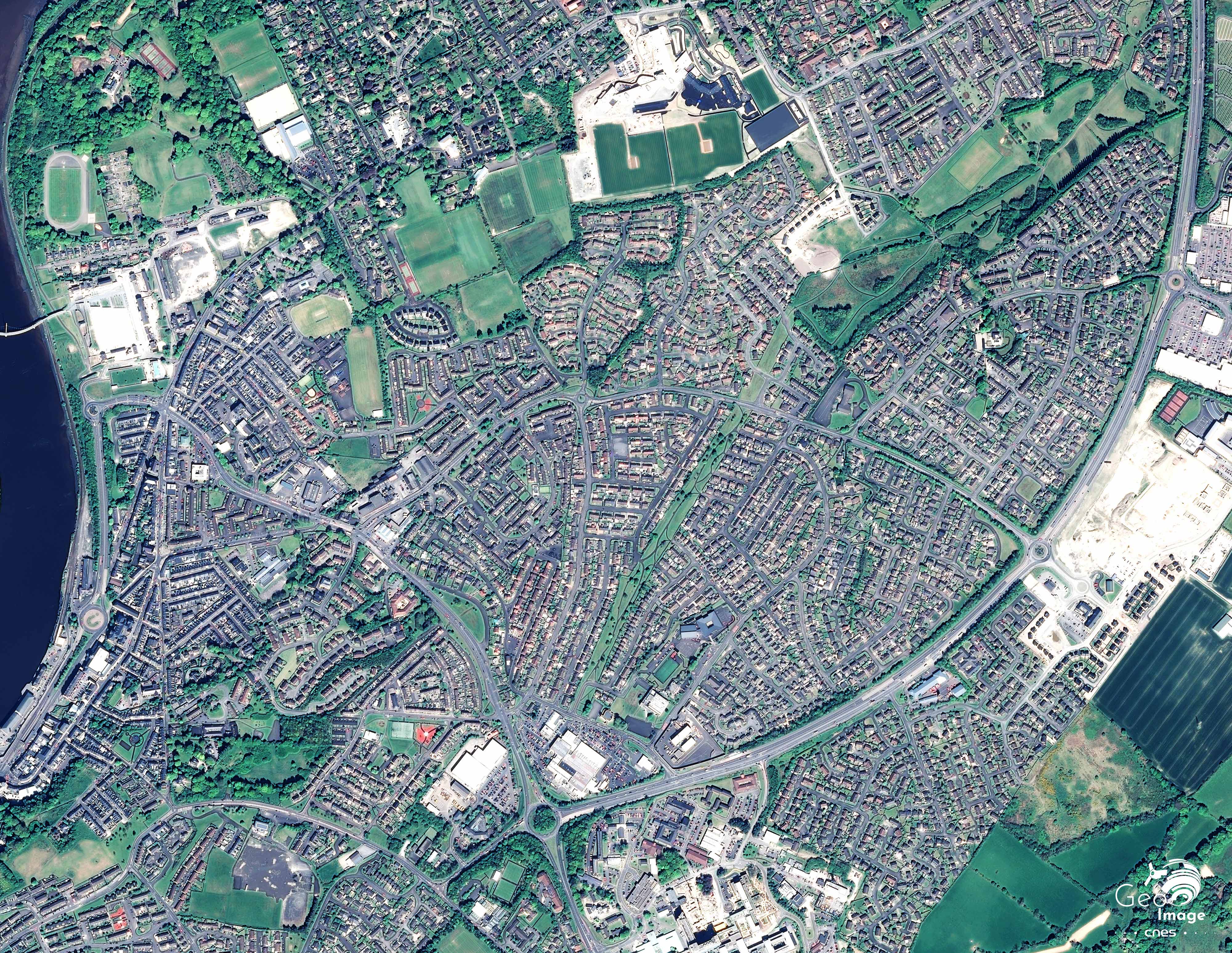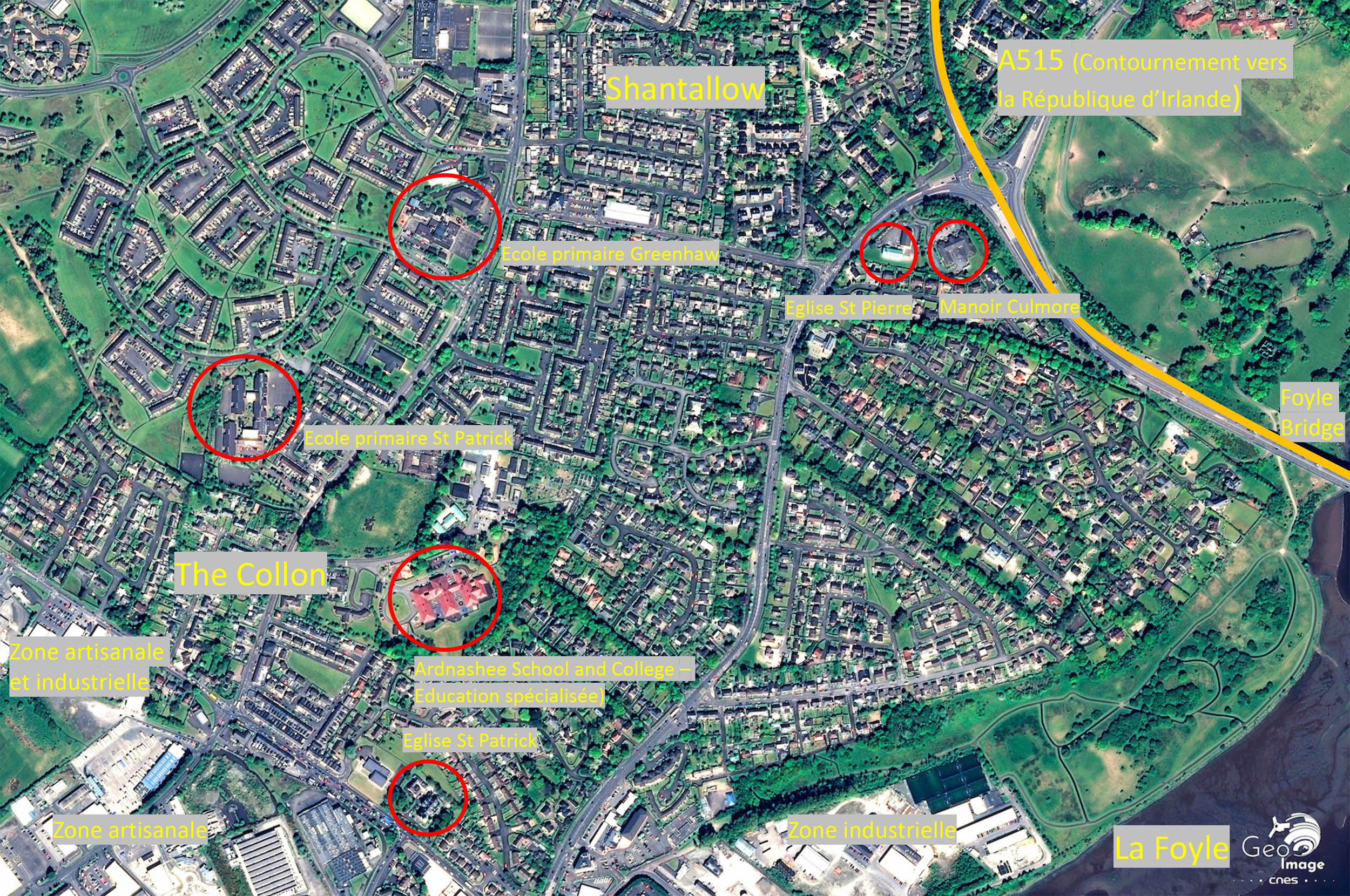 Cette image montre un ensemble de banlieues résidentielles et pavillonnaires installées entre la Foyle, l’axe autoroutier qui permet le contournement de Derry/ Londonderry en direction de la République d’Irlande, et deux vastes zones industrielles et artisanales. Ces dernières se trouvent à environ deux kilomètres au nord des remparts du centre ancien.