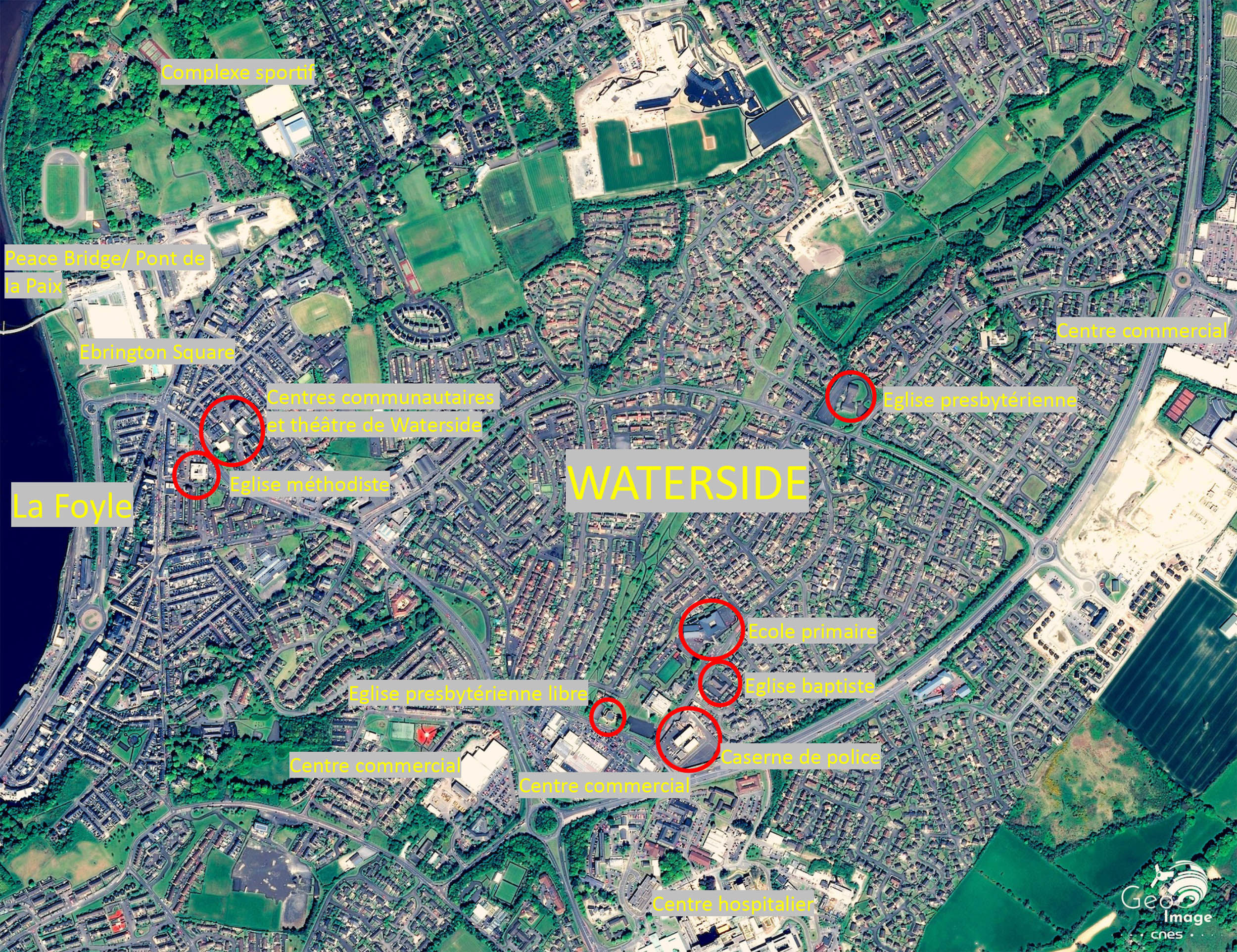 L’image couvre ici le quartier de Waterside, où, contrairement à Cityside, la proportion de catholiques et de protestants est beaucoup plus équilibrée puisque le recensement de 2011 indique que 48 % des habitants de Waterside sont protestants, contre 47 % de catholiques. La dénomination « protestants » regroupe toutes les obédiences chrétiennes autre que catholicisme, d’où la présence d’églises presbytérienne, presbytérienne libre, baptiste ou méthodiste.