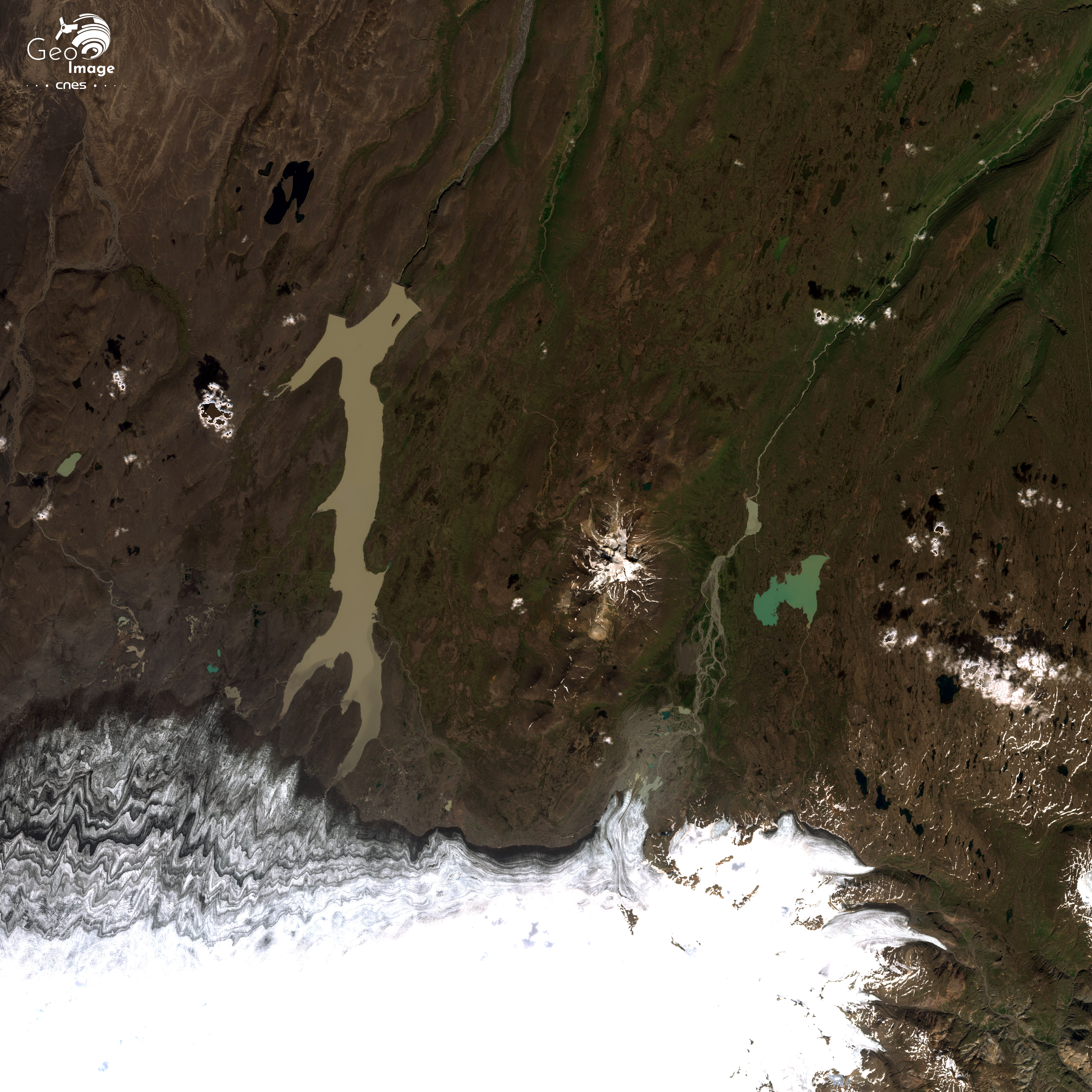 Au contact direct de la glace, les éruptions génèrent des crues brutales, dénommées les jökulhlaupar. S’échappant de l’une ou l’autre des 30 langues glaciaires émanant de la calotte, celles-ci contribuent à façonner le paysage des vastes plaines proglaciaires, dénommés les sandur, qui sont bien visibles sur l’image.