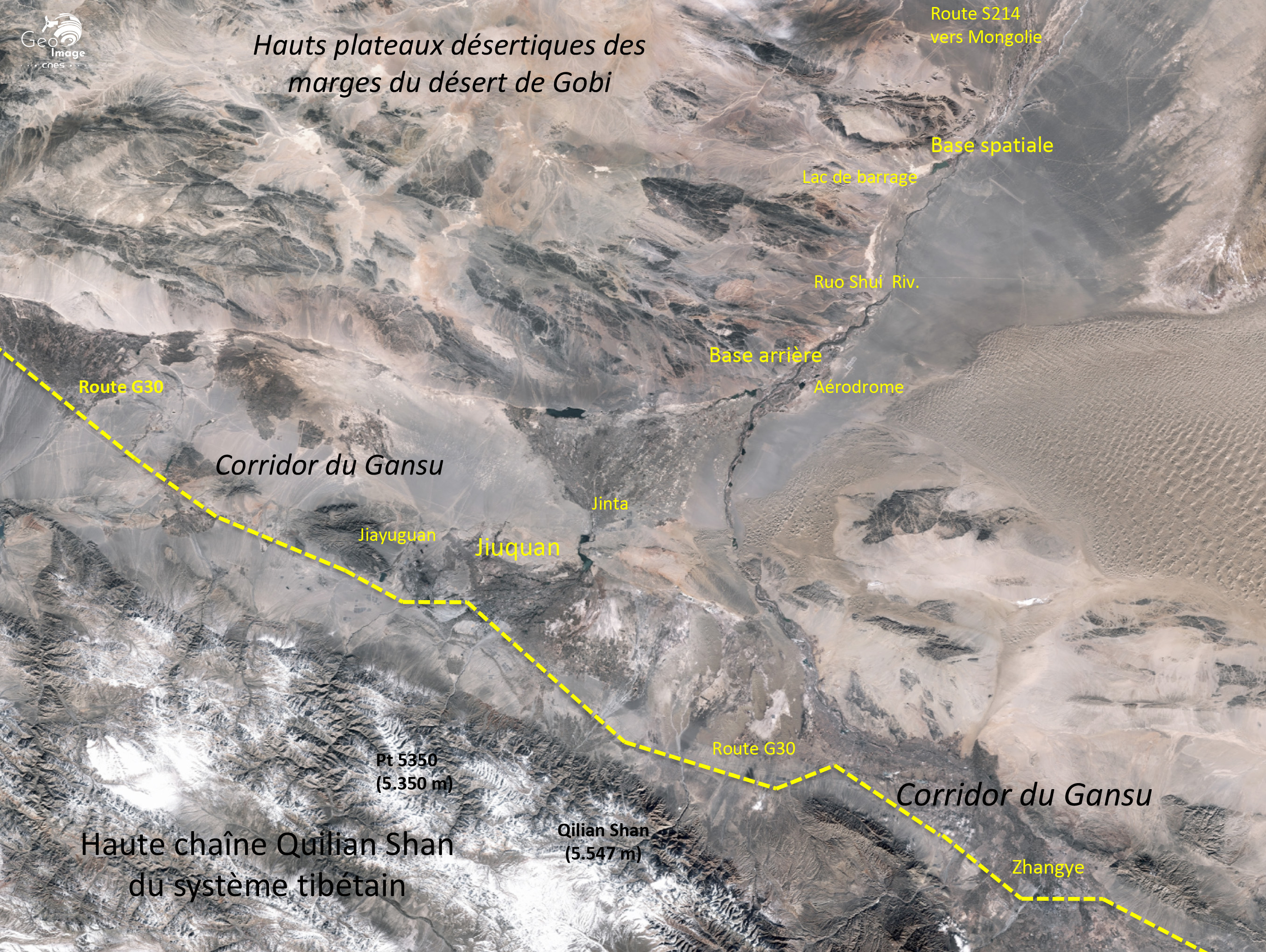 Tout en haut de celle-ci se distinguent un petit lac de barrage et des installations : c’est la principale base de lancement de satellites de la Chine populaire. Quelques dizaines de kilomètres plus au sud, on distingue les pistes d’un aérodrome militaire et une petite agglomération qui sert de point d’appui à la base spatiale.