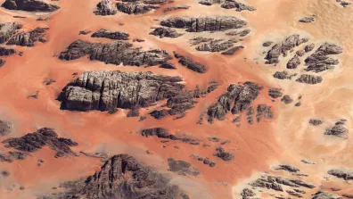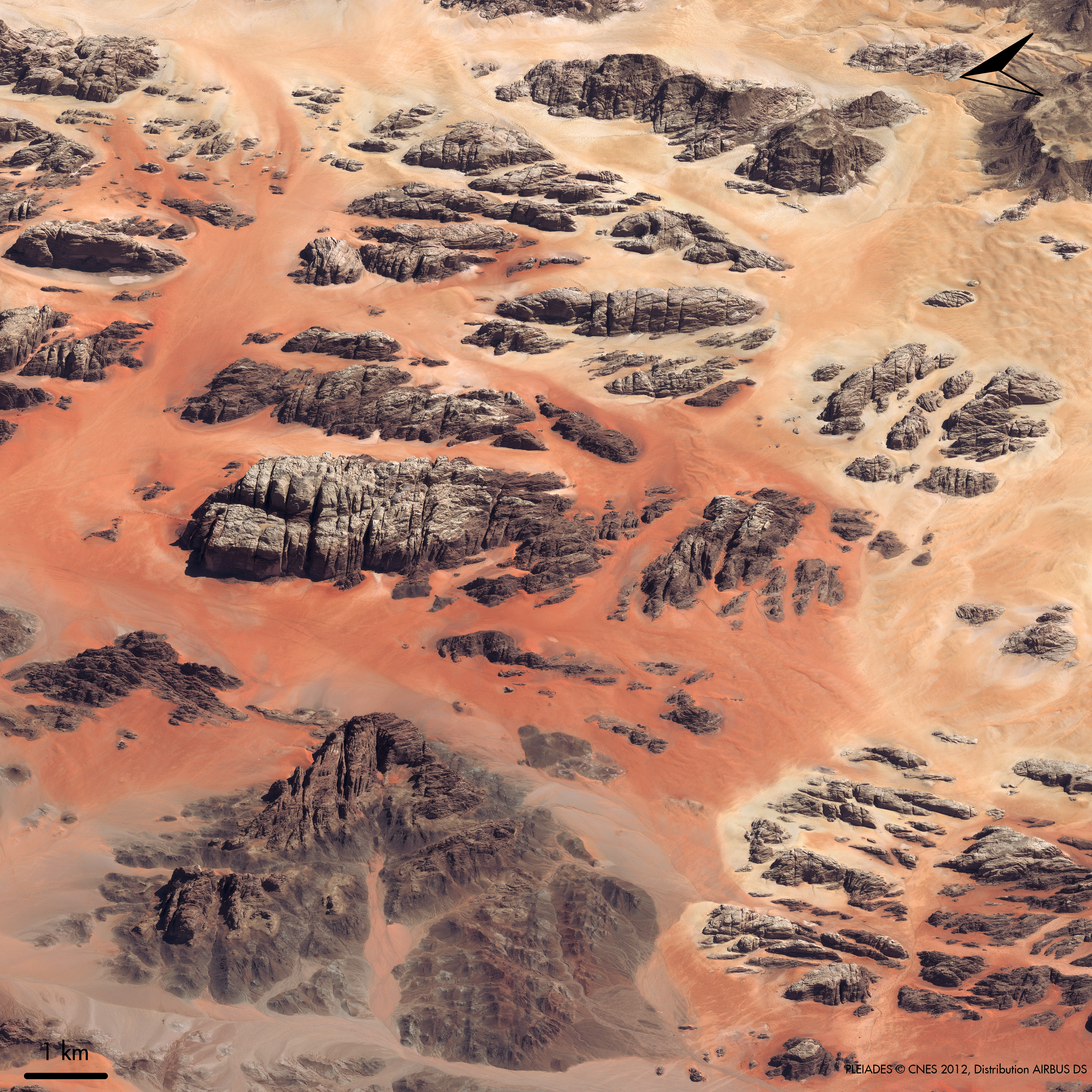 Cette image du désert fait alterner des massifs rocheux très escarpés, souvent taillés à la serpe, semblant posés sur un fond plat de sables jaunes et de dunes orangées ou ocres. Situé dans l’extrême sud-ouest de la Jordanie, le Wadi Rum culmine à 1 854 mètres au Djebel Umm ad Dami, point le plus élevé du pays.