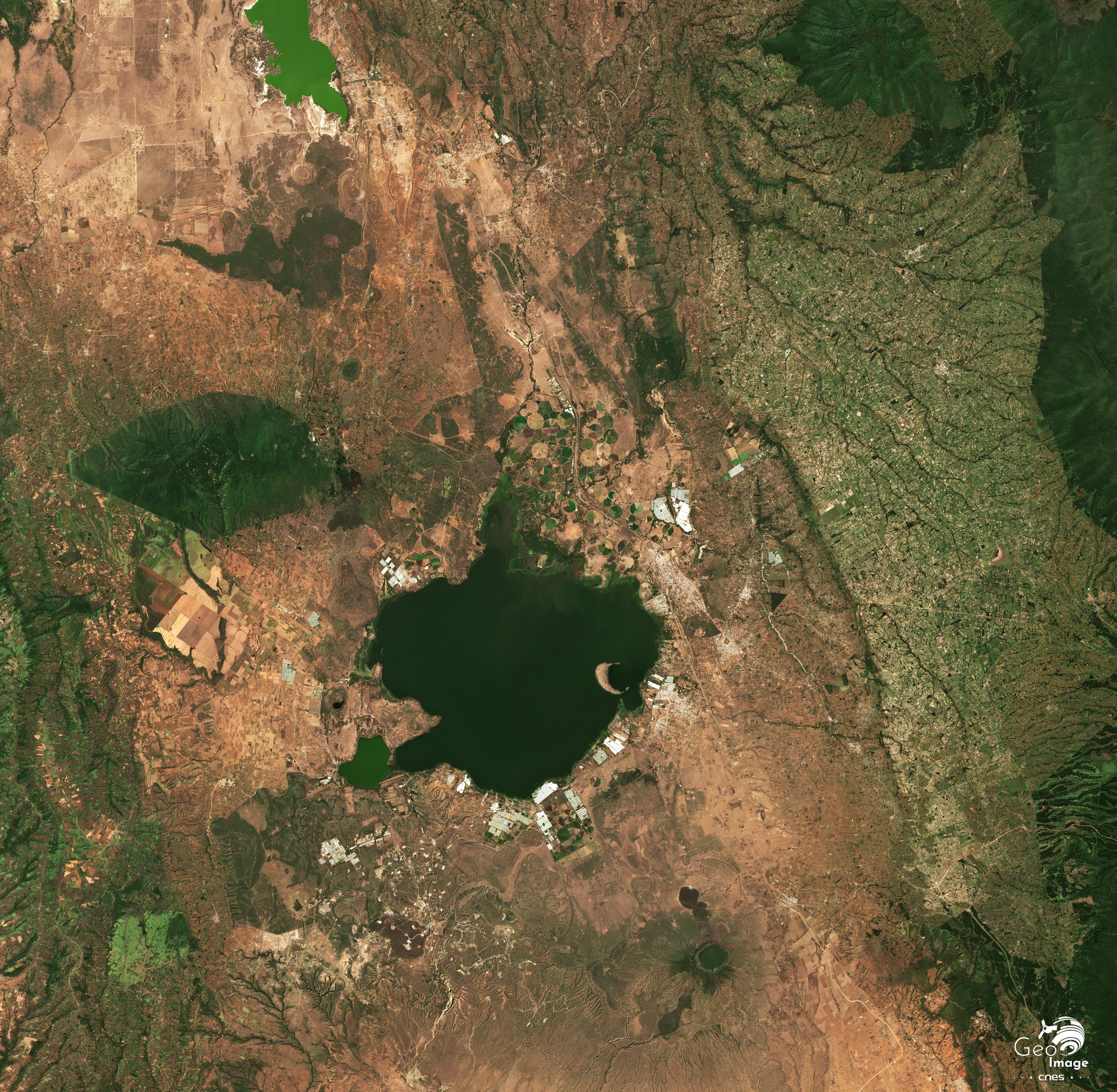 Centrée sur le lac Naivasha qui fait 139 km2, l’image présente une section de la Rift Valley kenyane - également appelé Rift Gregory, orientée Nord-Sud. Le fond de la vallée à 1.880 m. d’altitude au lac Naivasha et à 1.790 m. au lac Eleimentaita est ici prise entre, à l’est le sud du massif des Aberdares, qui culmine à 4.000 m., et, à l’ouest le Mau Escarpement, qui culmine à 3.000 m..