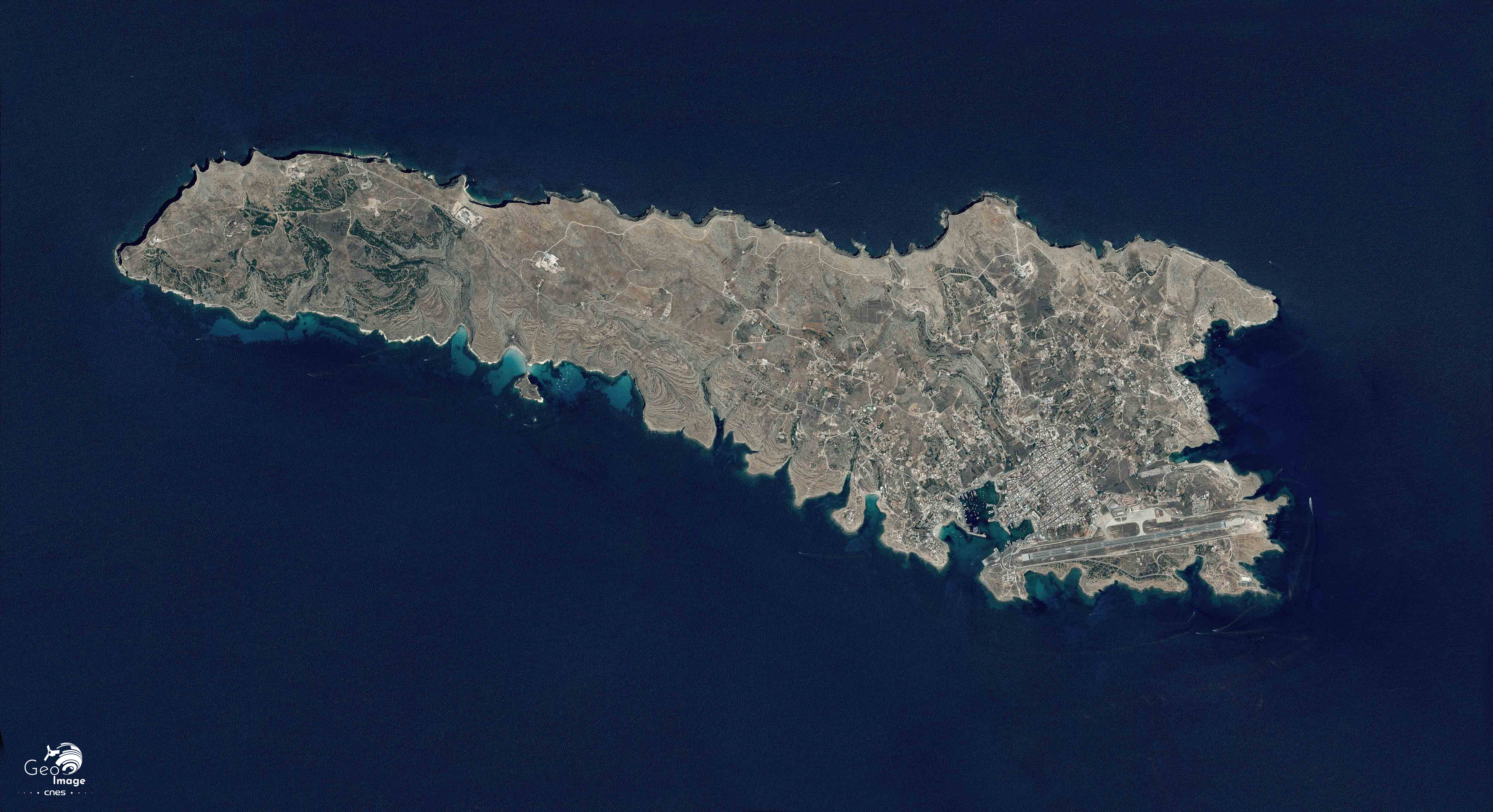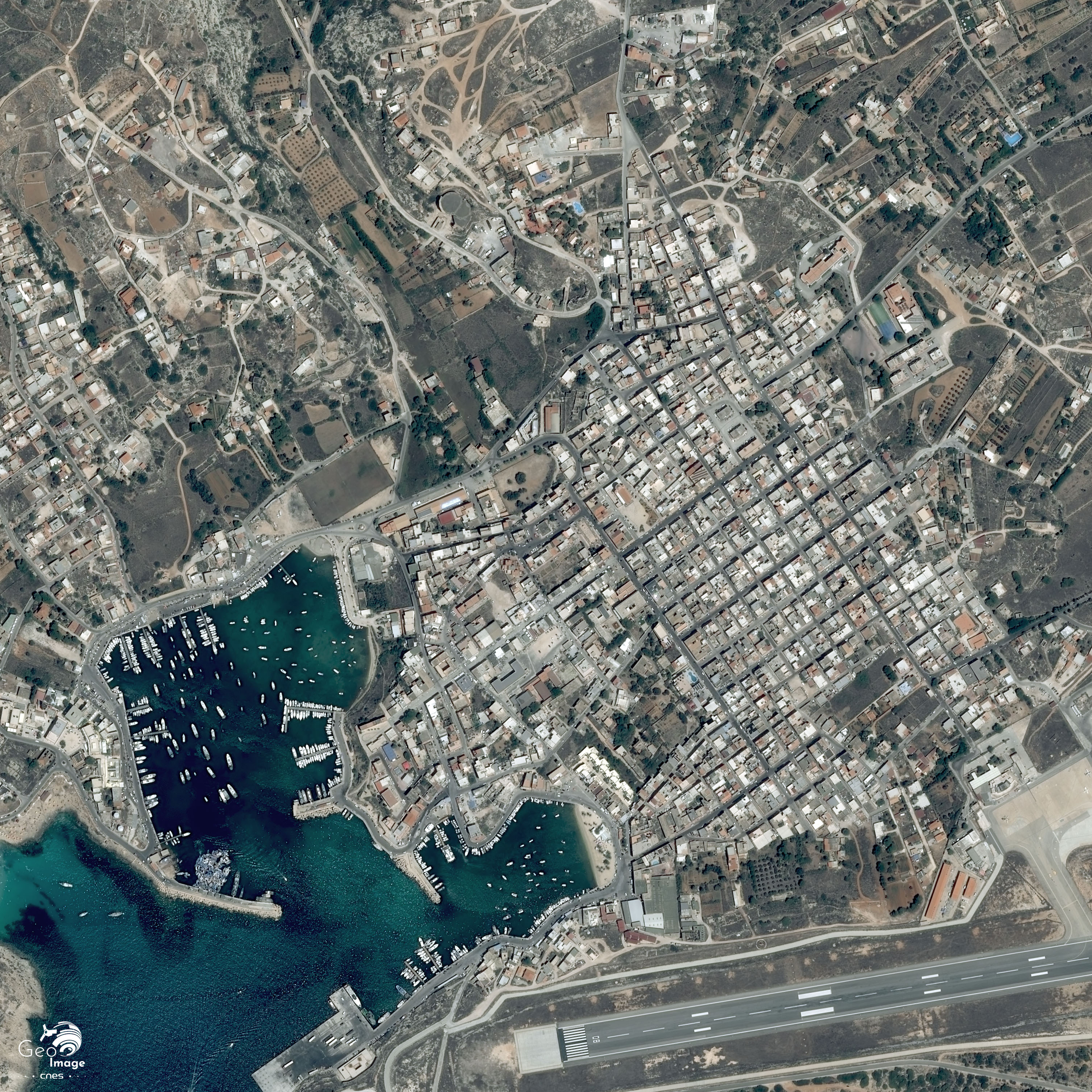 Image satellite de Lampedusa, petite île située au centre de la mer Méditerranée, d’une superficie d’environ 20 km², Cette image a été prise le 11 août 2020 par un satellite Pleiades. Il s'agit d'une image satellite, vraie couleur, de résolution native à 0,70m, ré-échantillonnée à 0,5m.