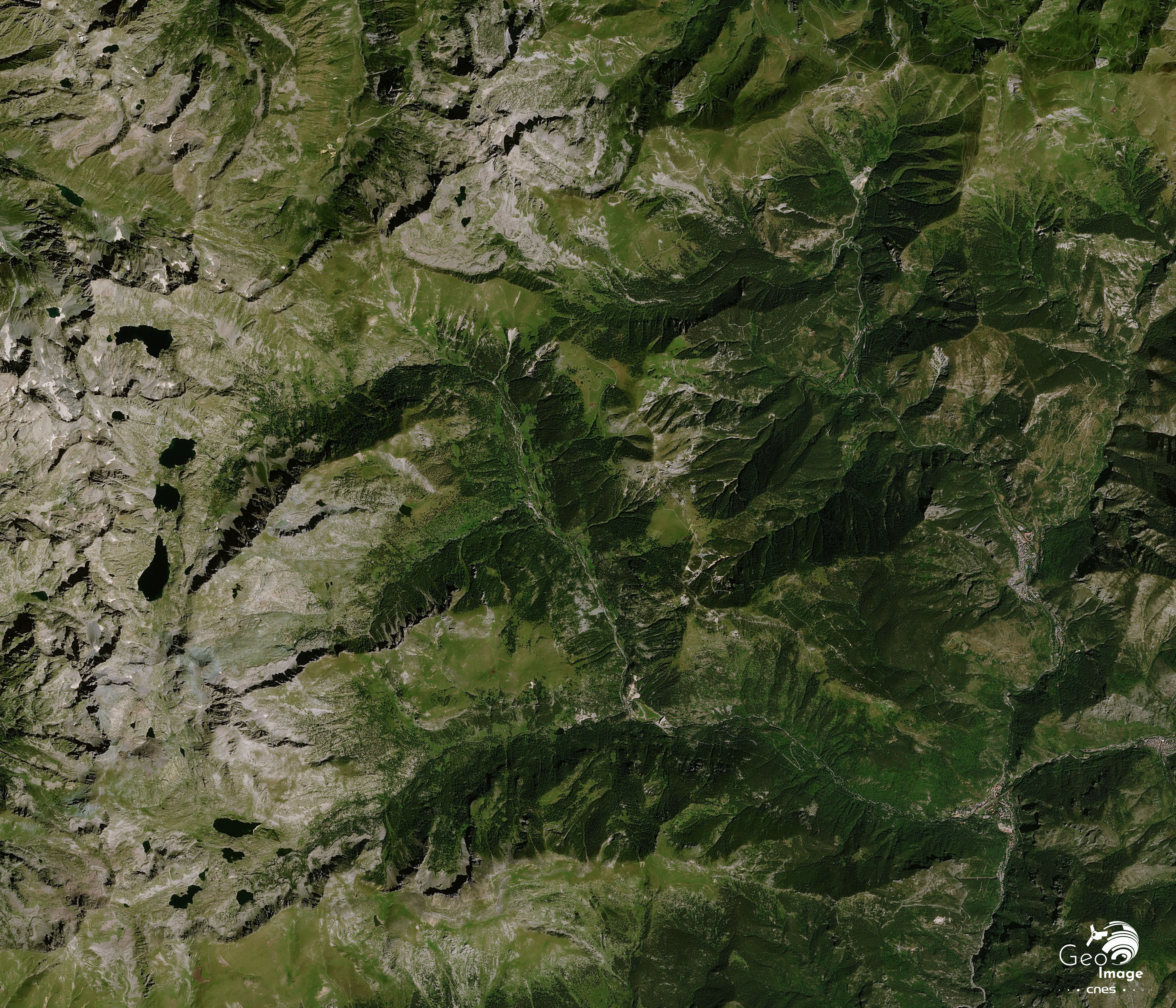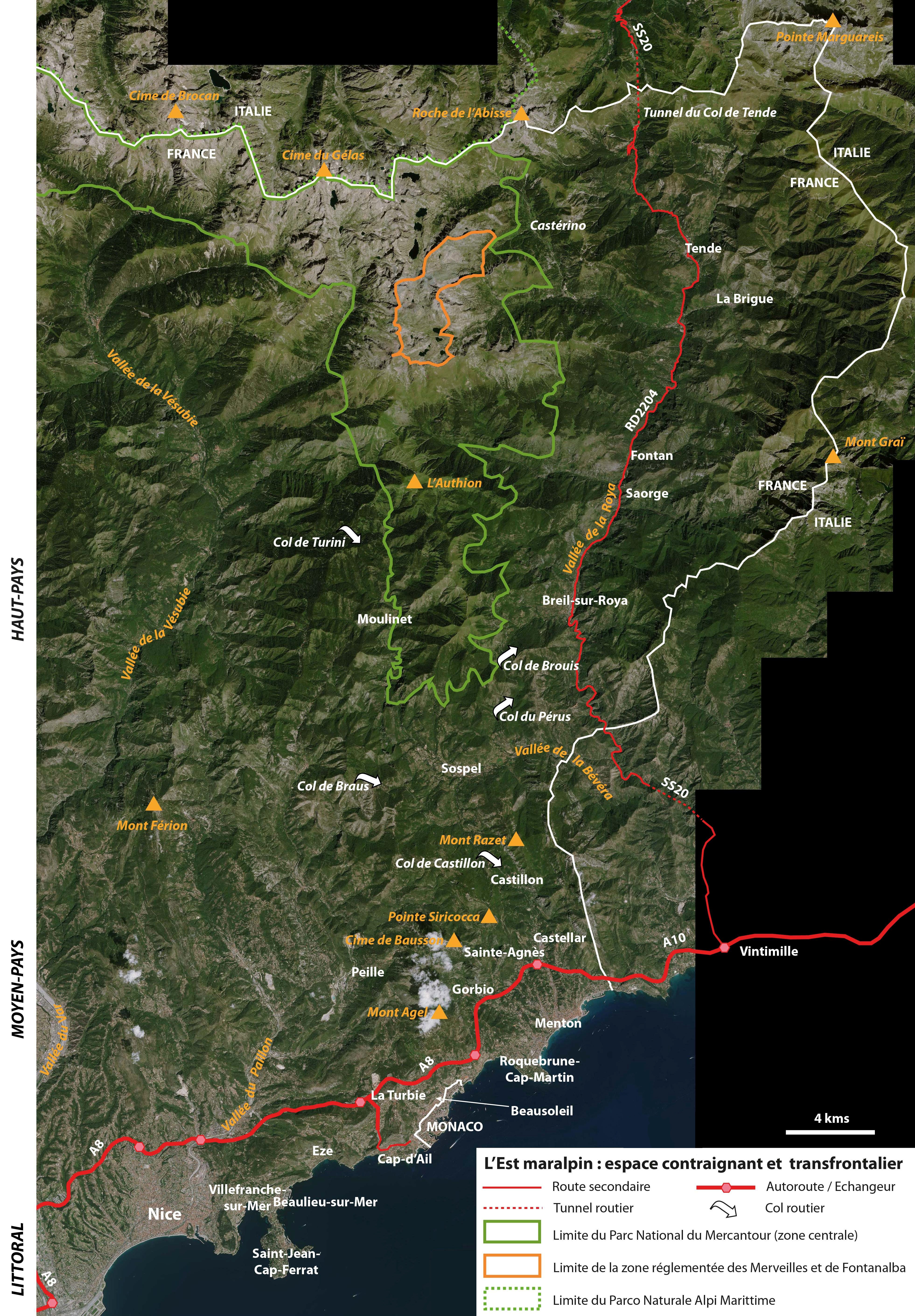Le Haut-Pays, quant à lui, constitue 75 % du territoire présent sur cette image. Il se caractérise par des hauts sommets, notamment vers les crêtes frontalières. On rentre alors dans le massif du Mercantour-Argentera, avec les vallées encaissées de la Roya et le secteur des Merveilles, et, plus à l’Ouest, accessible par le col de Turini, de la Vésubie, avec les vallons de la Gordolasque, du Fenestre et du Boréon. Ici, la Cime du Gelas culmine à 3143 m. Nous ne sommes pourtant qu’à 50 km de la Méditerranée. La quasi-totalité de ce Haut-Pays est inclus dans le cœur du Parc national du Mercantour.