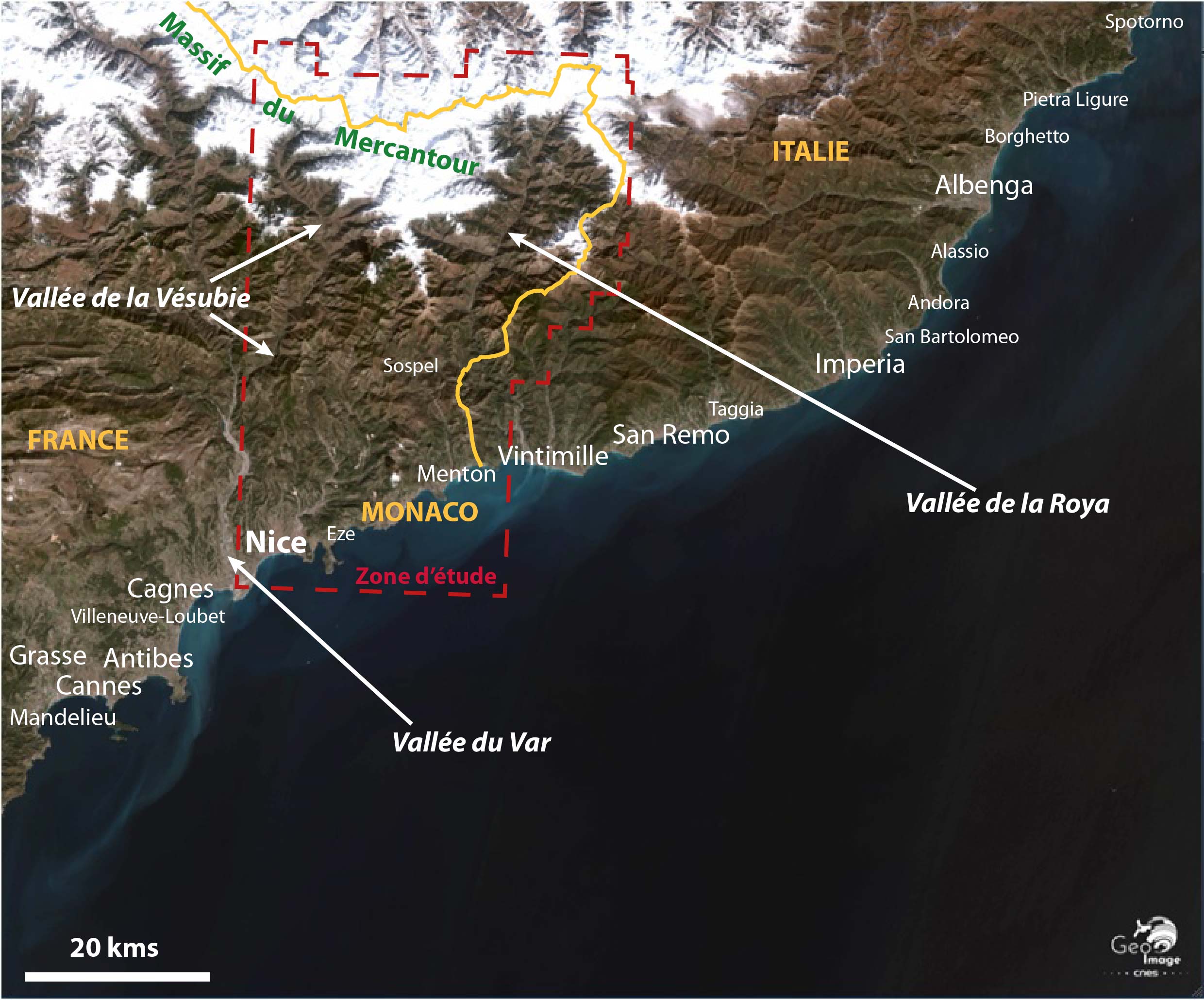 Sur l’image, la première frontière est une évidence : c’est la frontière italienne. L’ensemble urbain Nice-Menton se poursuit côté italien par les villes de Vintimille, Bordighera, San Remo et Imperia pour former une agglomération transfrontalière en filament, mais parfois discontinue : Menton est séparée de Vintimille par une arête alpine. Par ailleurs, l’arrière-pays transfrontalier est faiblement peuplé, enclavé : le relief constitue toujours une contrainte forte pour des relations avec l’Italie (Coni, Turin).