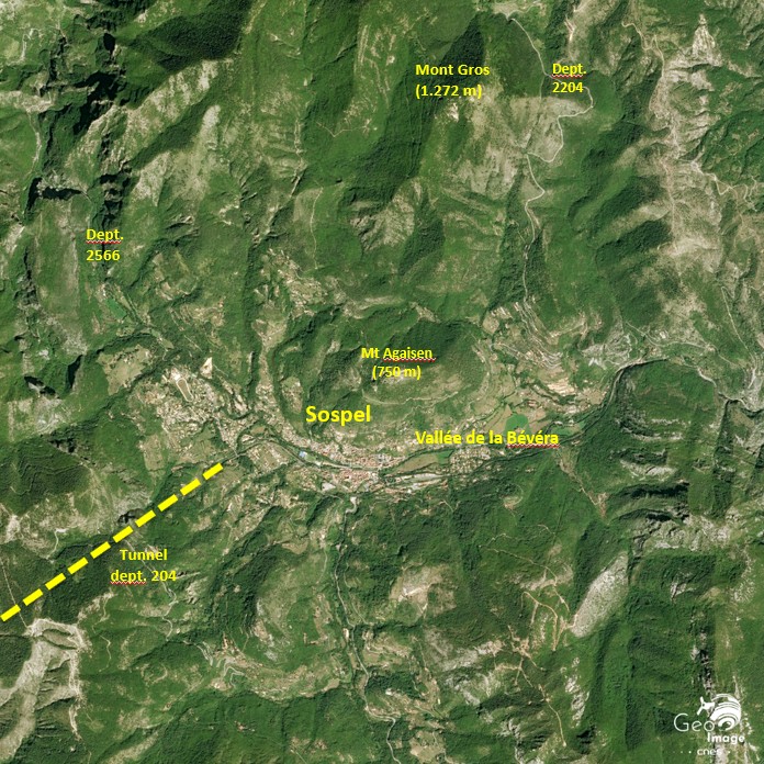 La vallée de la Bévéra se situe à 20 km, par la route, au Nord-Nord-Est de Menton. Elle sépare le littoral de la haute-vallée de la Roya, constituant ainsi l’espace du « Moyen-Pays ». Relativement encaissée, ceinturée par des sommets culminant à plus de 1.000 mètres, elle s’élargit en cuvette autour de la commune de Sospel, dont l’accès est pour le moins particulier : d’où que l’on vienne et où que l’on aille, il faut passer un col : le col de Castillon au Sud et de Turini au Nord (RD2566), le col de Braus à l’Ouest ou celui de Brouis à l’Est (RD2204).