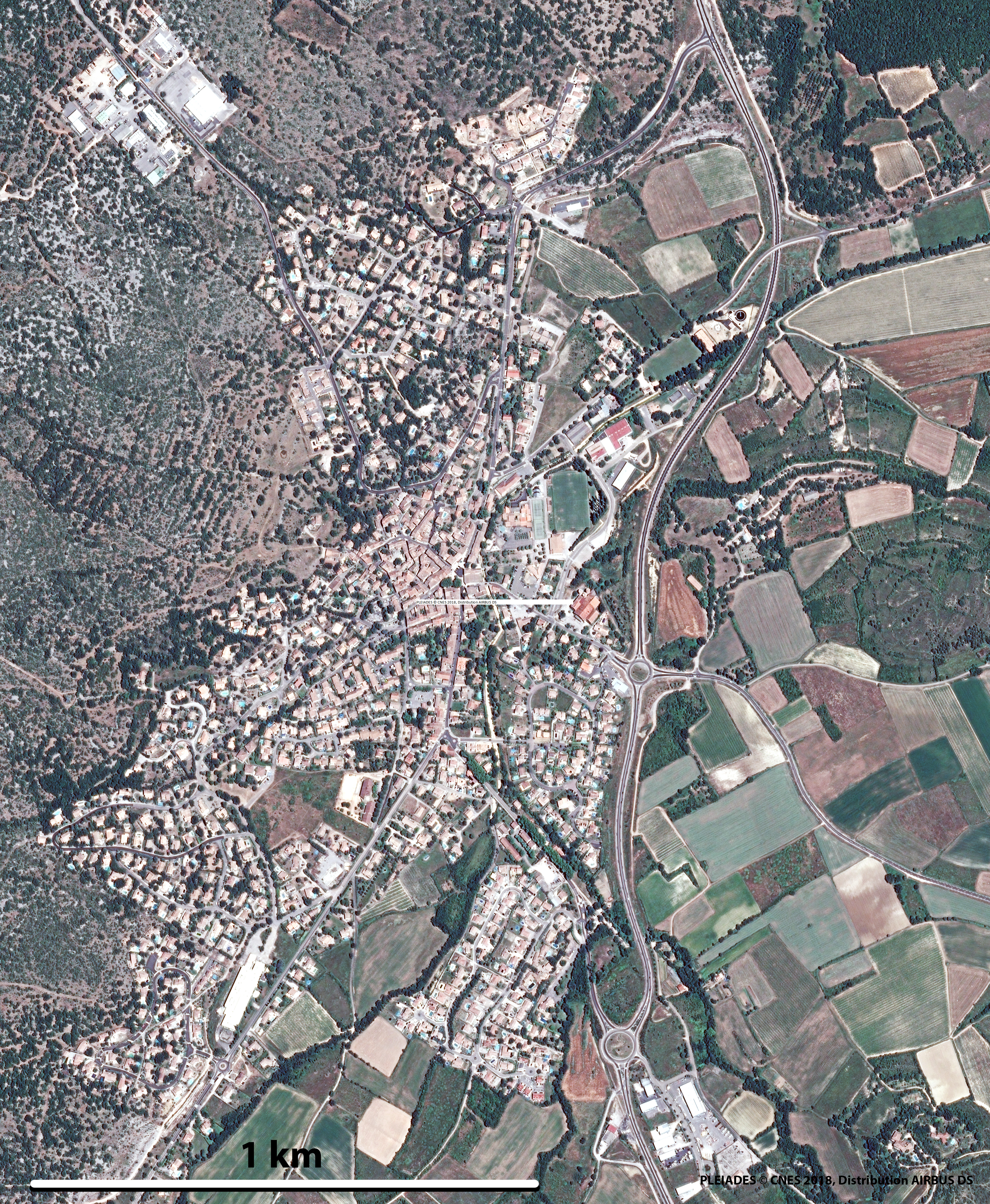 Image de Montpellier, ville du sud de la France située sur l'arc méditerranéen, entre Barcelone et Marseille. Cette image a été prise le 15 août 2018 par un satellite Sentinel-2. Il s’agit d’une image en couleurs naturelles, dont la résolution est de 20m.