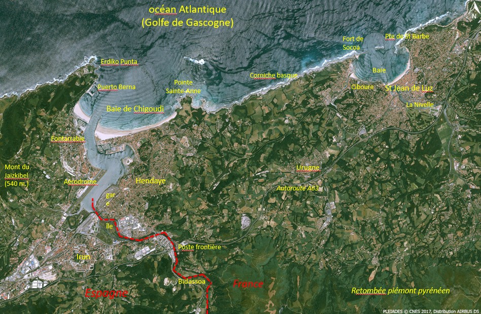 L’image est centrée sur la baie transfrontalière de Chigoundi (Txigundi en basque), embouchure de la Bidassoa qui sépare Hendaye-plage, ancienne zone dunaire transformé dès les années 1920 en quartier balnéaire, et Fontarrabie (Hondarribia en basque), dont le noyau ancien se distingue par la densité des bâtiments.