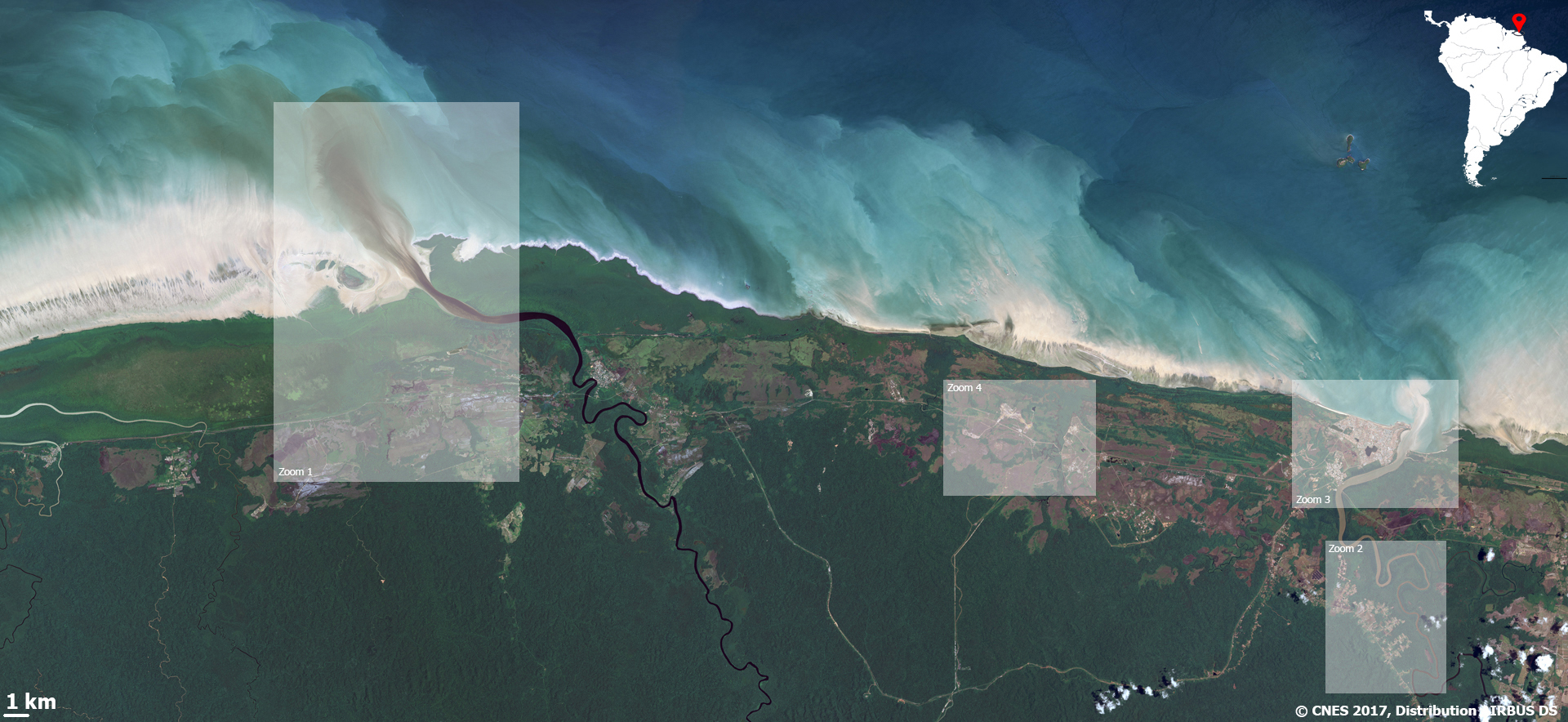 Cette image détaille encore davantage la mosaïque littorale guyanaise organisée en bandes paysagères parallèles au littoral, en raison de la configuration géomorphologique des sédiments. La confrontation des eaux fluviales du Sinnamary avec les eaux turbides littorales est spectaculaire, le panache des matières organiques déversées par le fleuve est bien visible car dissoutes, elles absorbent fortement la lumière d’où les teintes sombres. Le Sinnamary charrie aussi moins de sédiments que les autres fleuves guyanais car ils sont piégés en amont par le barrage de Petit Saut construit en 1994 pour fournir de l’électricité au CSG et à une population guyanaise en forte augmentation.