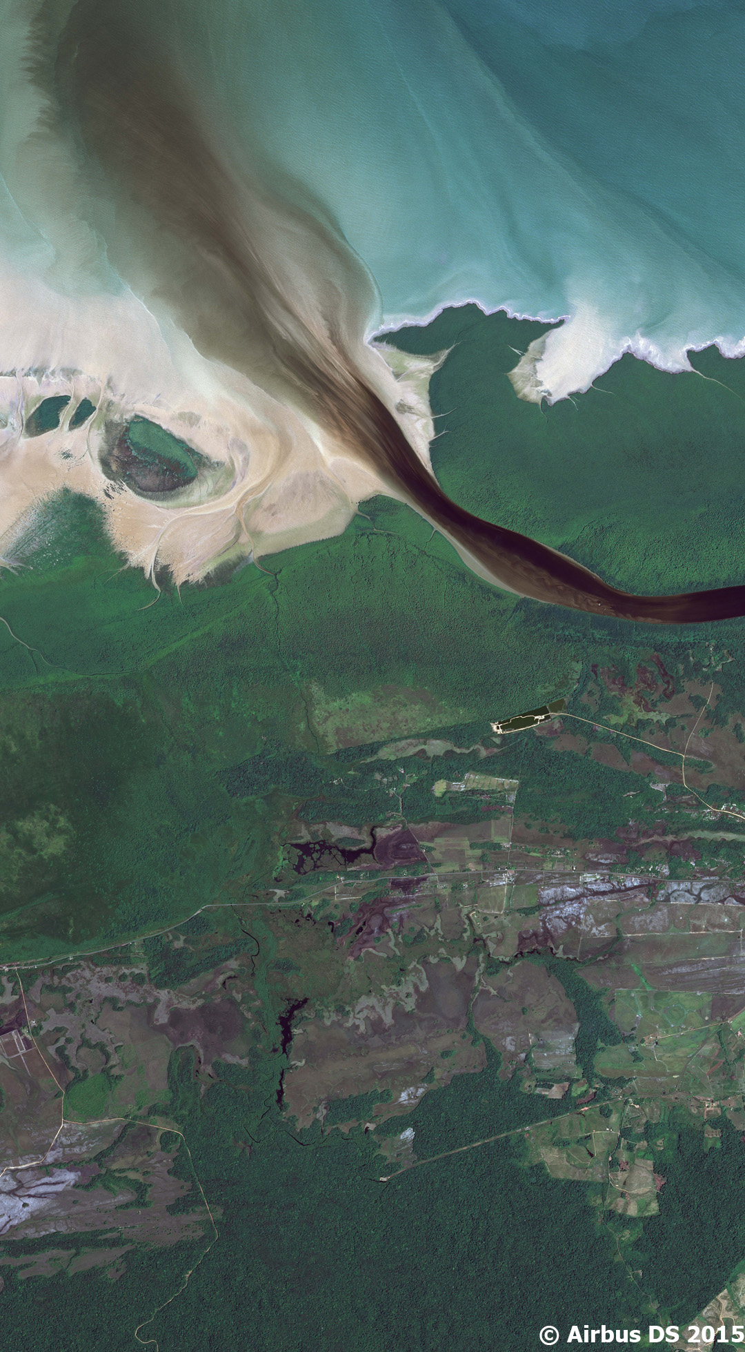 Le réseau hydrographique est ici représenté par le fleuve Sinnamary, au centre de l’image dans une teinte plus sombre, et par le fleuve Kourou situé à l’est de l’image. Les sédiments fluviaux se rajoutent à la palette de couleurs de la mer. A 14 km au large de Kourou, les îles du Salut, site emblématique du bagne de Guyane, sont aujourd’hui un lieu de mémoire et de tourisme.