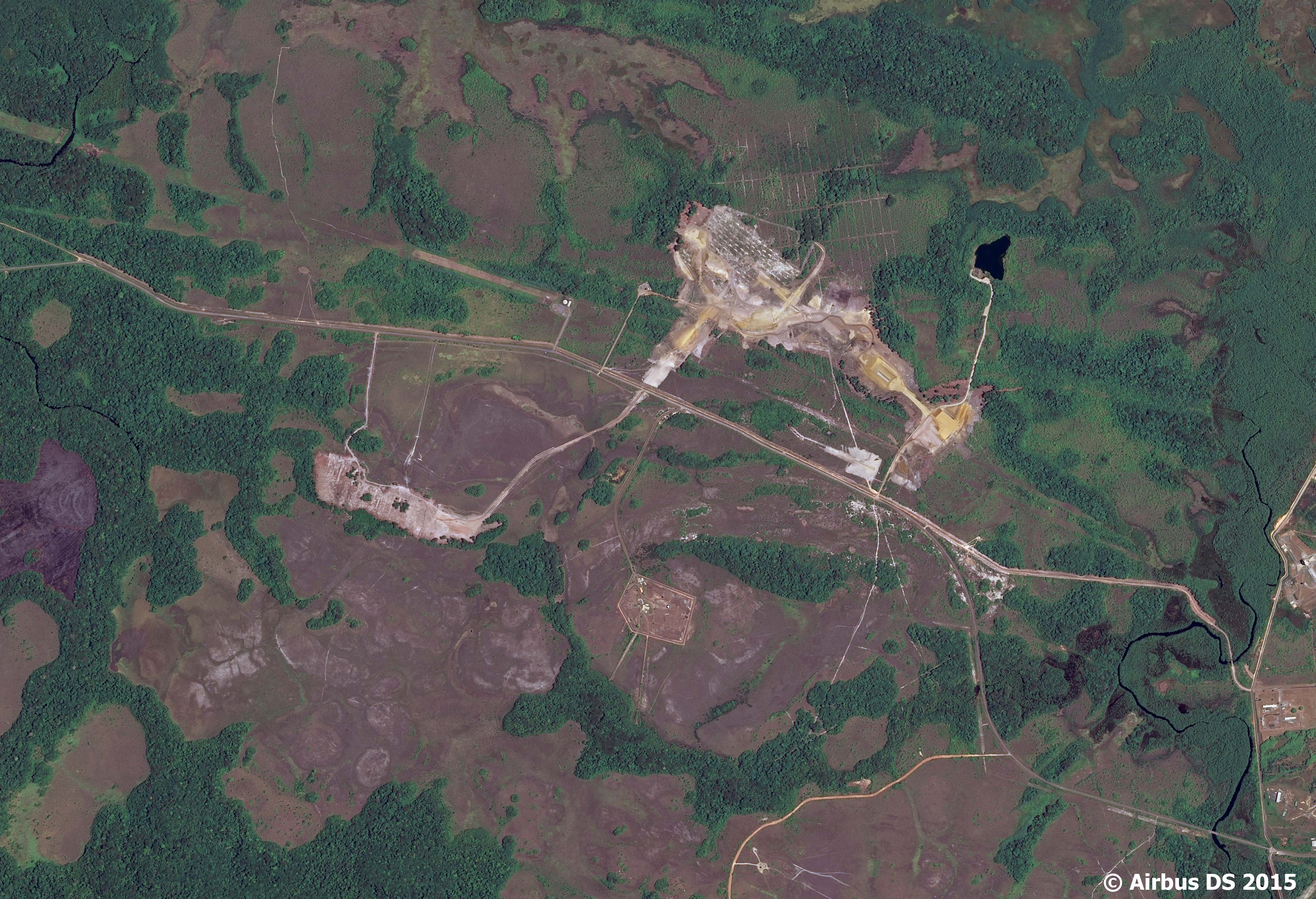 En suivant la « route de l’espace », bien visible ici, on aperçoit à droite de l’image, de l’autre côté de la crique Karouabo, une partie des installations d’Ariane 5 (ELA3) et de Vega (ELV), 6 km plus à l’ouest et en dehors de l’image, il y a les installations Soyouz (ELS).