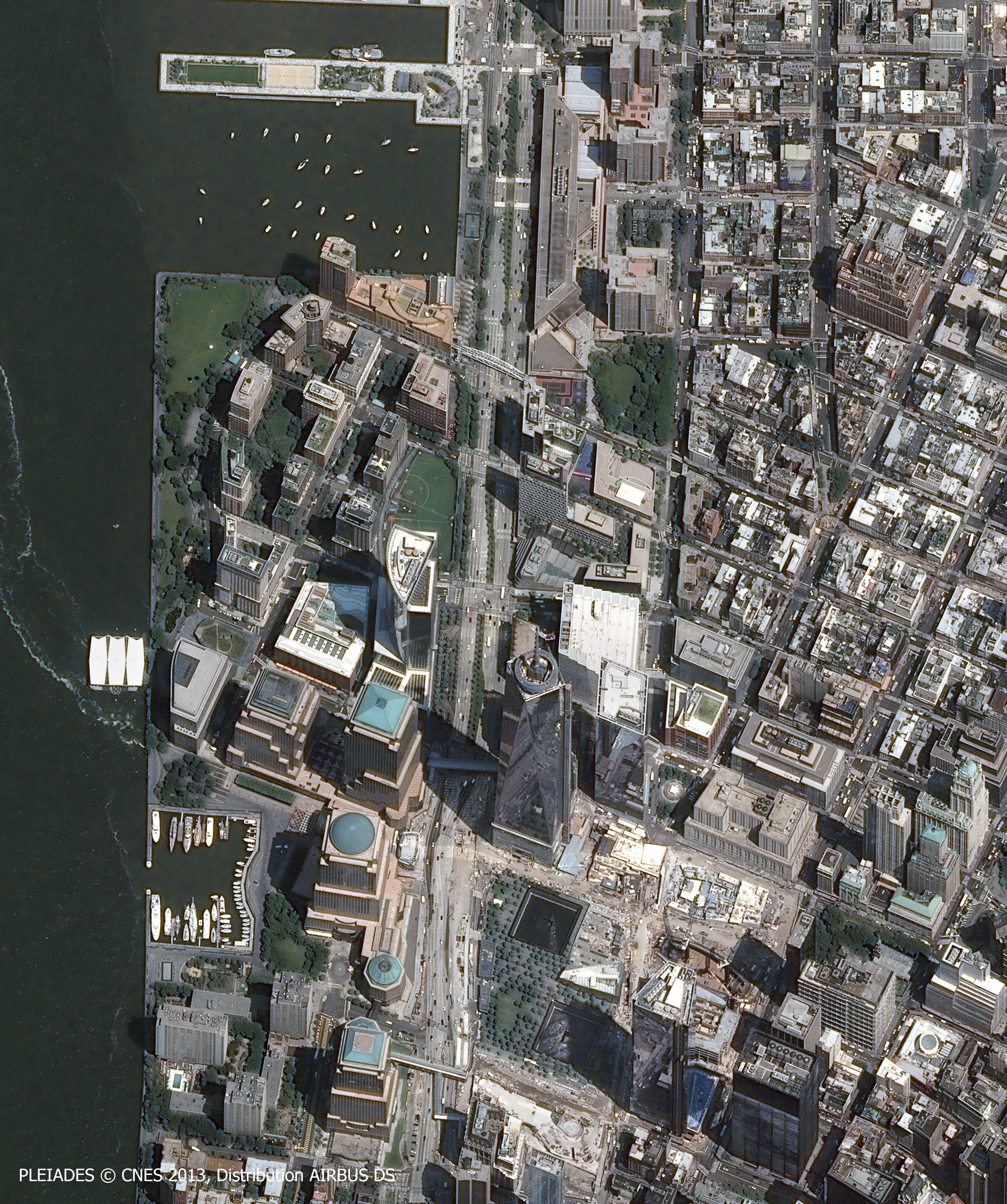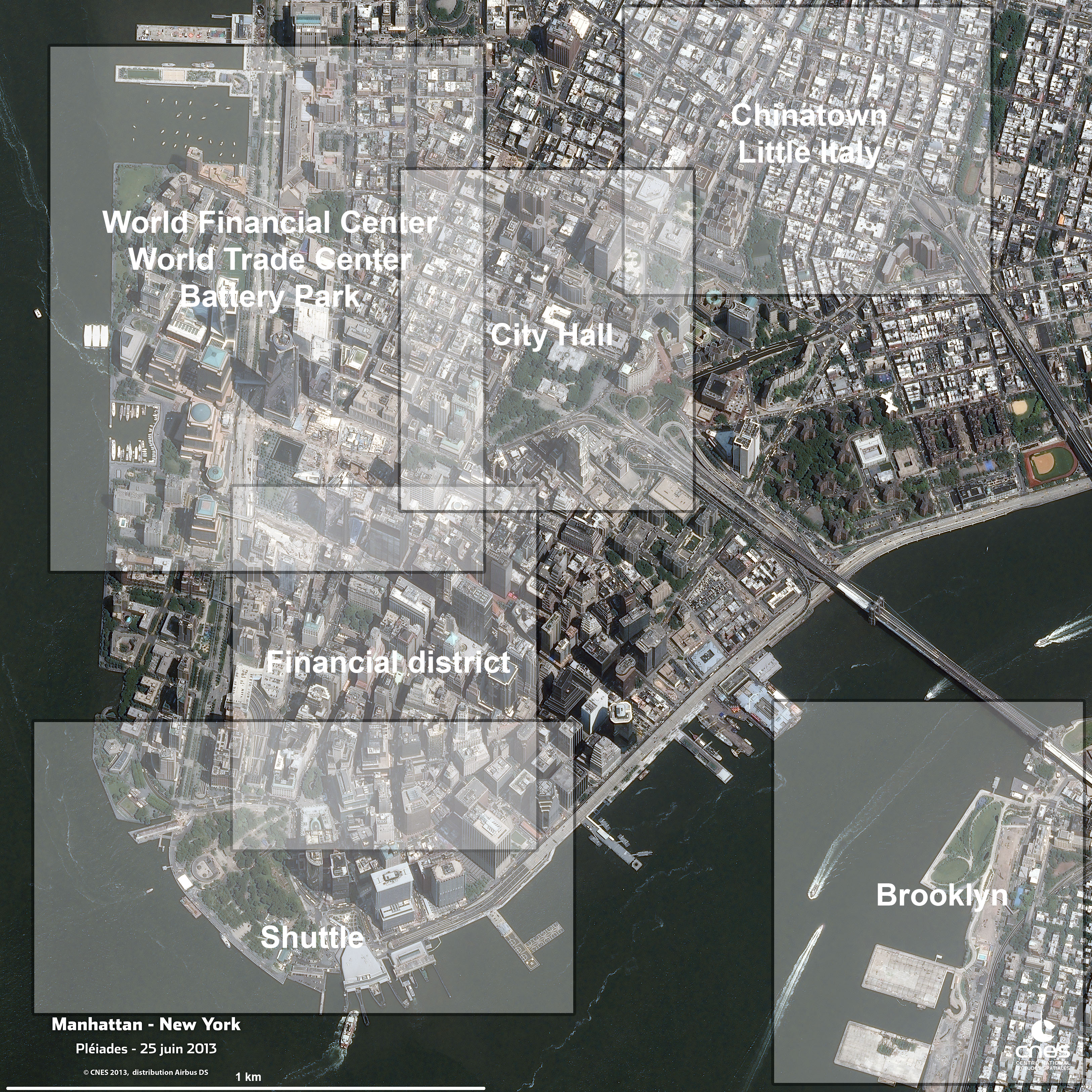 Lower Manhattan presentado aquí constituye un resumen, un precipitado de la ciudad mundial que es la metrópoli neoyorquina. Concentra una pluralidad de funciones de mando que interactúan tanto a escala local como mundial. La imagen satélite permite distinguir la NYSE (bolsa de Wall Street) que compone, en el núcleo del Distrito Financiero, la mayor plaza financiera, la que encamina el conjunto de las bolsas mundiales. Se adivina también en la orilla Sur, la famosa skyline, verdadero paisaje identitario de la ciudad, que refleja su potencia económica, albergando las sedes sociales de grandes empresas americanas (AIG, American Express…) presentes en el mundo entero.