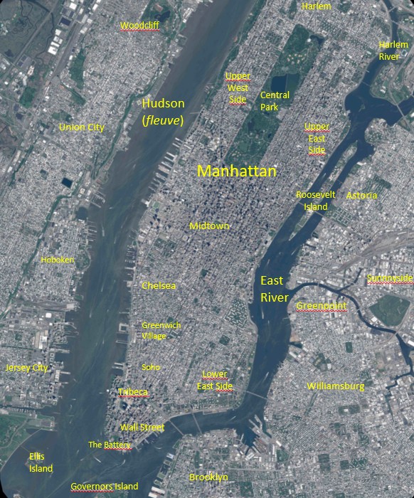 Se distinguen muy bien los cincos barrios : la isla de Manhattan en el centro, los barrios Brooklyn y Queens en la derecha, el Bronx arriba a la derecha y Staten Island abajo a la izquierda.