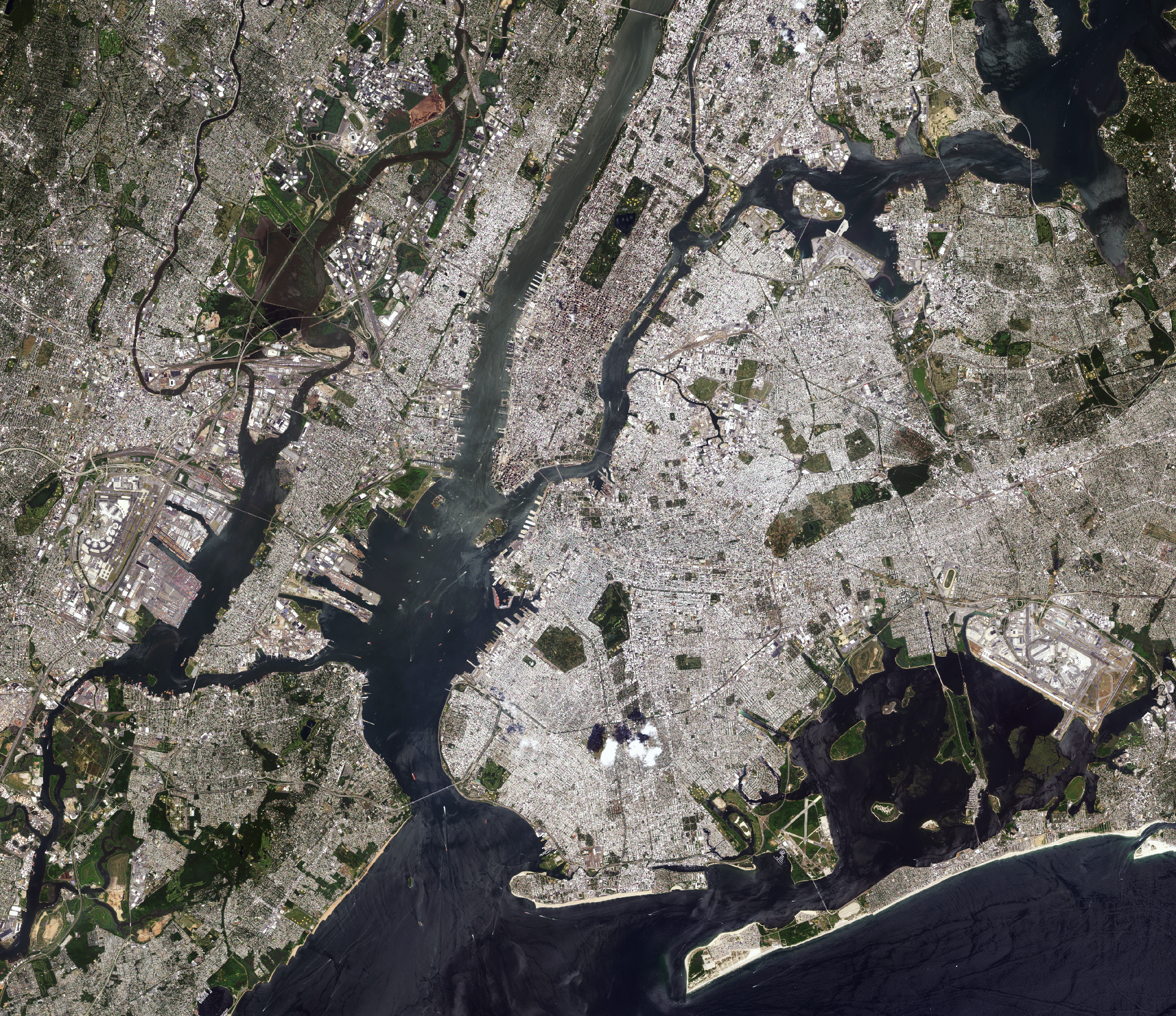 Nueva York, la ciudad más grande de Estaods-Unidos vista por el satélite Sentinel 2, el 17 de mayo de 2015. Esta imagen tiene un definición de 10 metros en el suelo.