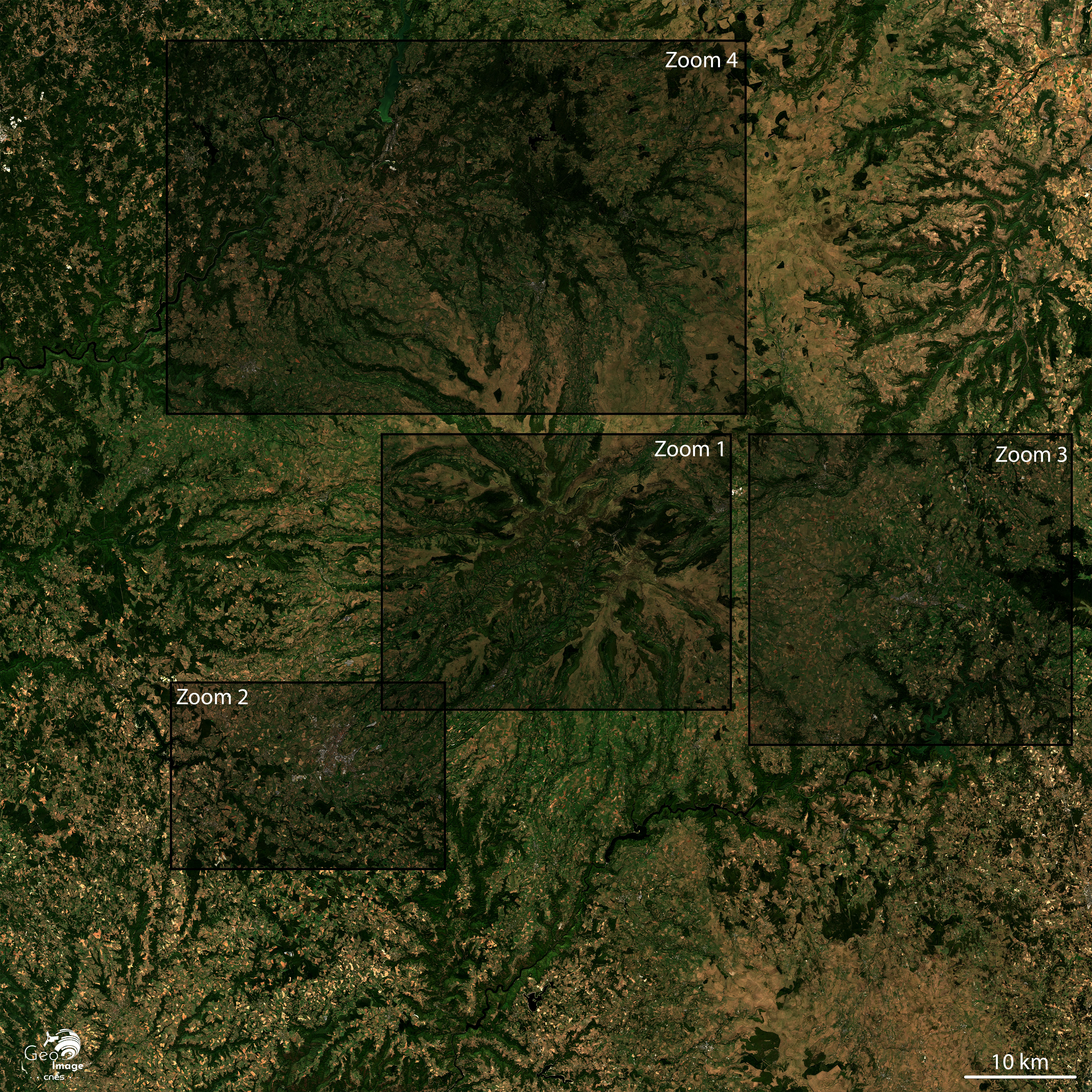 Cette région rurale, où les versants des vallées sont largement boisés, est fortement marquée par l’activité agricole. Les paysages bocagers sont bien ajustés à une économie herbagère (visibles au travers des parcelles de couleur verte sur l’image) où les prairies de fauche et les pâtures permanentes sont au service de logiques de productions animales qui visent la qualité. Vers le sud de l’image, à mesure que les altitudes s’élèvent sur les flancs du volcan cantalien, s’étendent de grandes pâtures d’estive où les bovins sont souvent associés à des troupeaux de brebis laitières ou à viande.