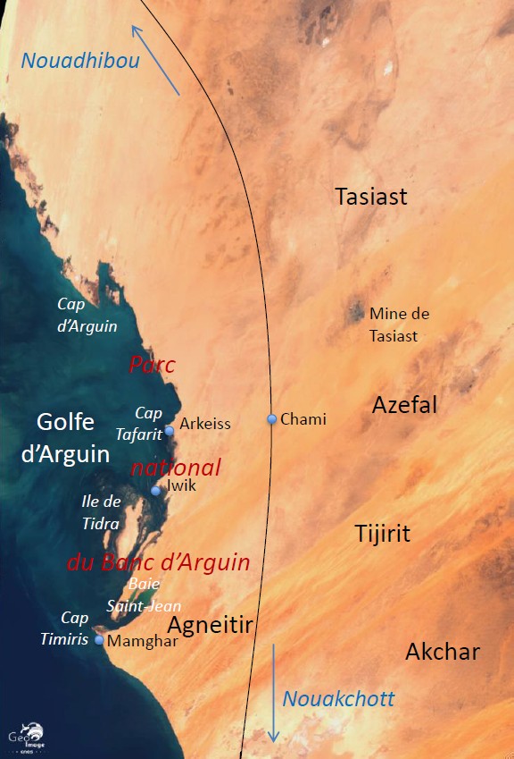 La côte septentrionale de la Mauritanie est bordée par le Golfe d’Arguin qui est bien visible sur l’image globale. Il constitue la partie marine du Parc national du Banc d’Arguin qui comprend aussi une bande continentale désertique d’une quarantaine de kilomètres de large.