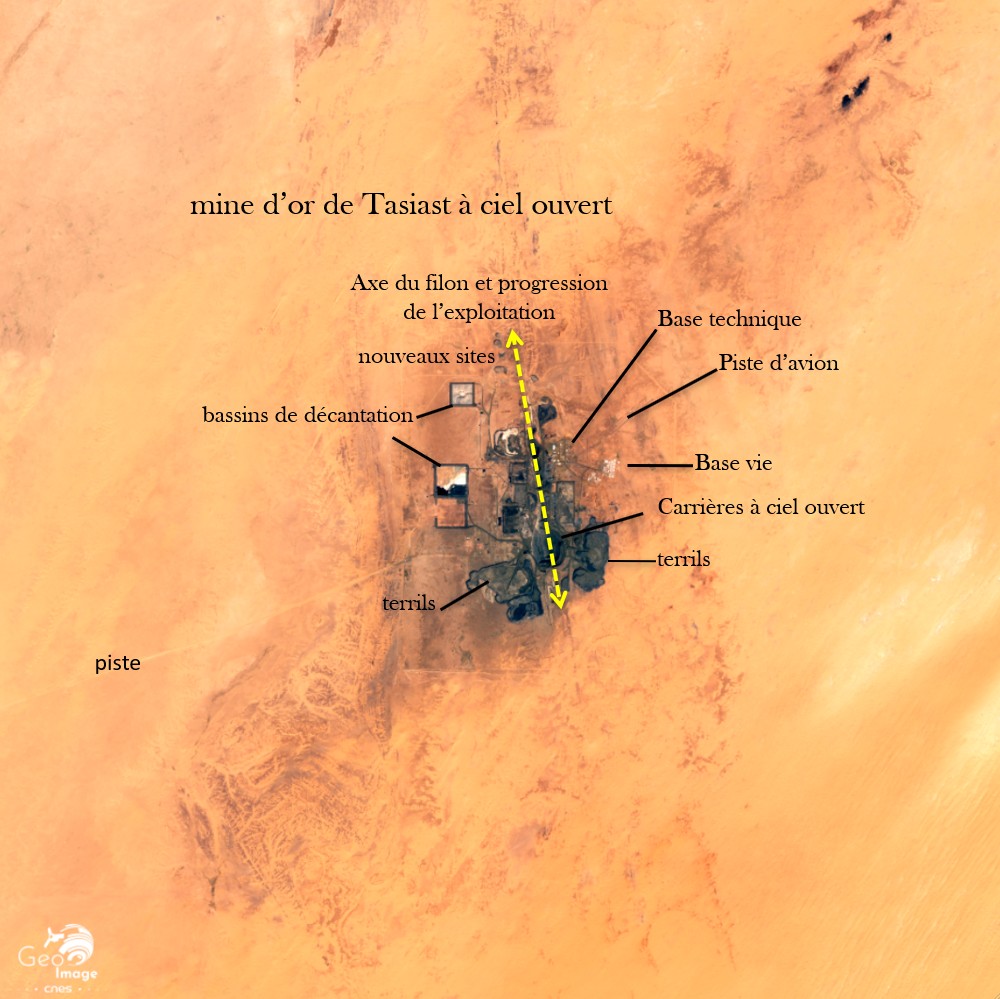 Il s’agit d’une mine à ciel ouvert ; les cavités correspondant aux carrières sont bien visibles sur l’image, de couleur sombre. Cette extraction produit aussi de nombreux débris stériles accumulés en terrils, eux aussi bien visibles. La mine emploie près de 4.000 personnes et son personnel est en cours de « mauritanisation ». Située à 300 kilomètres au nord-est de Nouakchott, le site ne se trouve qu’à une soixantaine de kilomètres de la limite du Parc national.