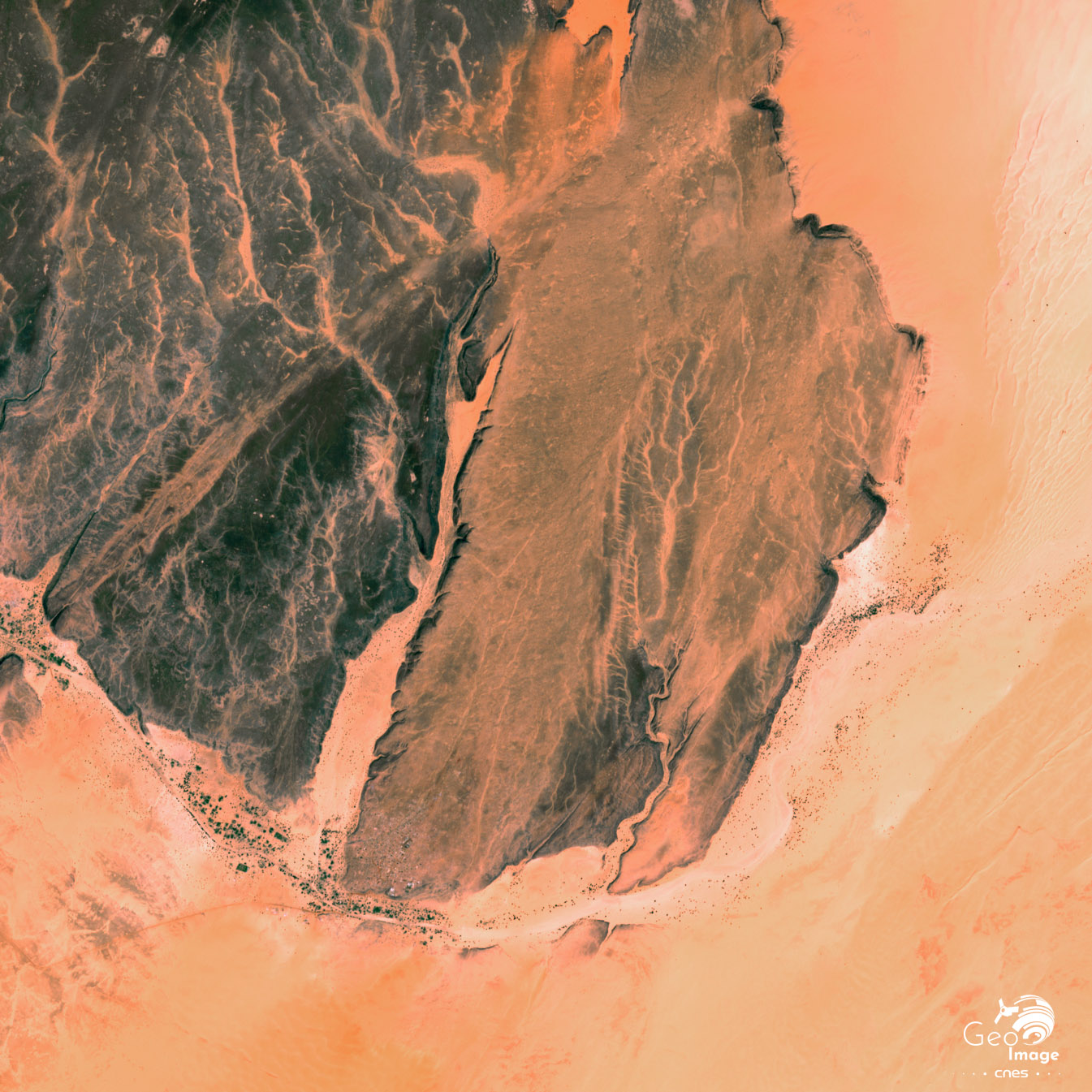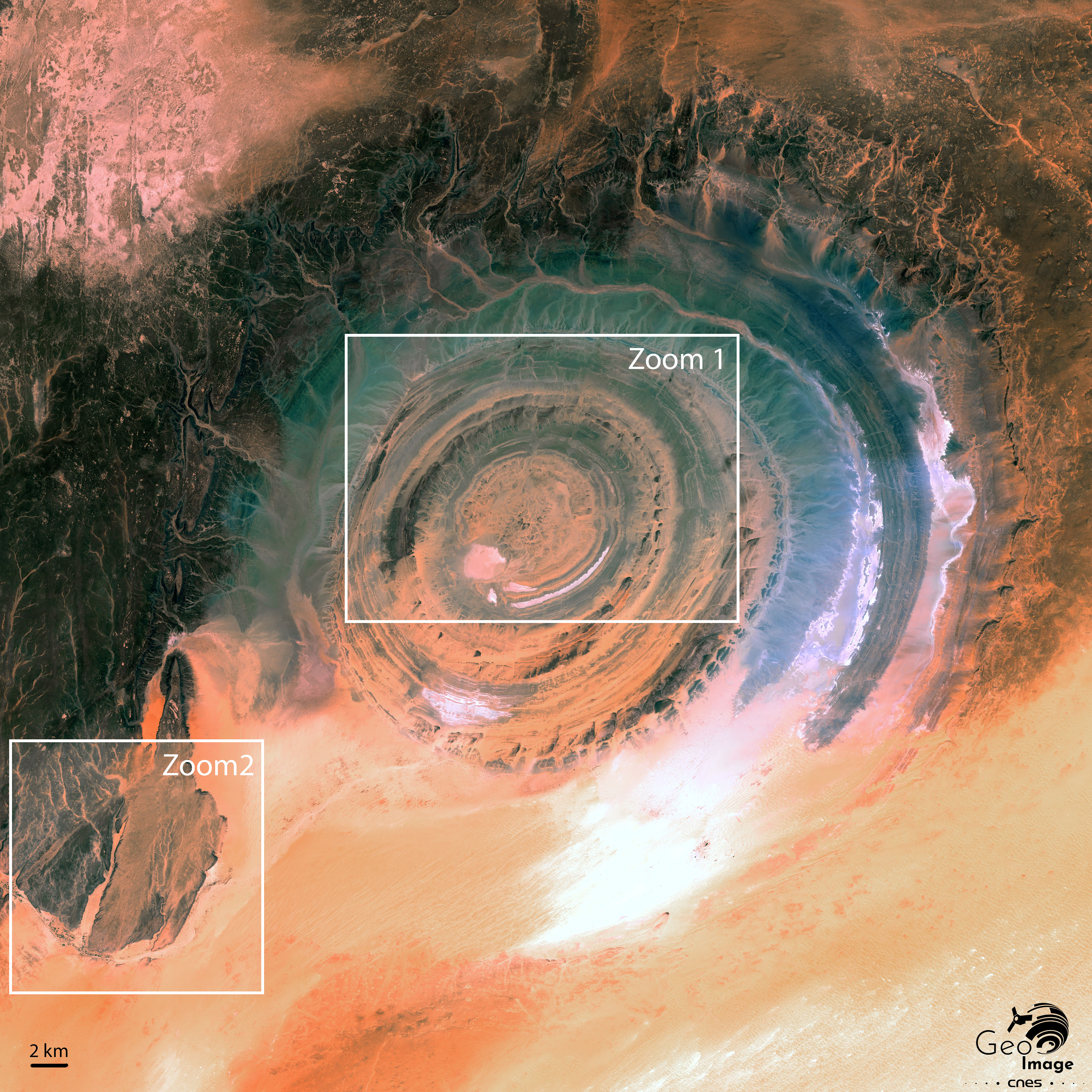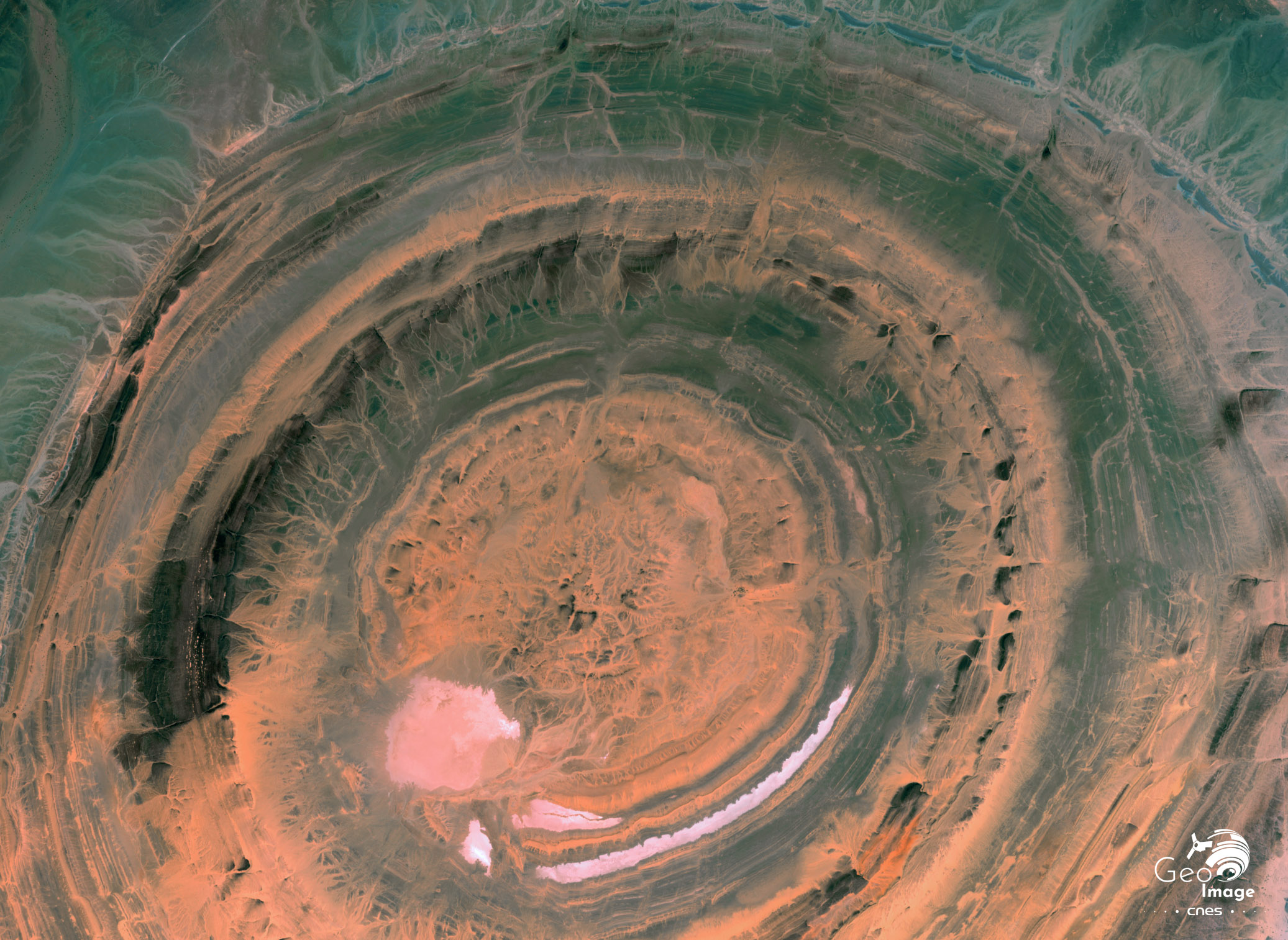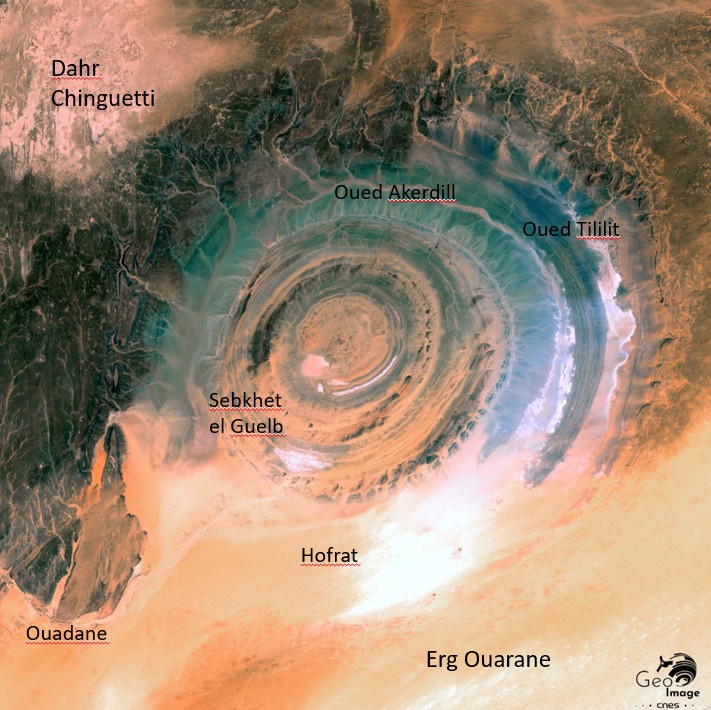 Comme le montre l’image, le Guelb er Richât est une formation géomorphologique très originale qui se trouve dans la partie orientale du massif de l’Adrar de Mauritanie et à proximité de l’oasis de Ouadane, qui est situé tout à fait dans le coin sud-ouest de l’image à l’extrémité sud de l’éperon rocheux qui ferme le cirque du Richât.