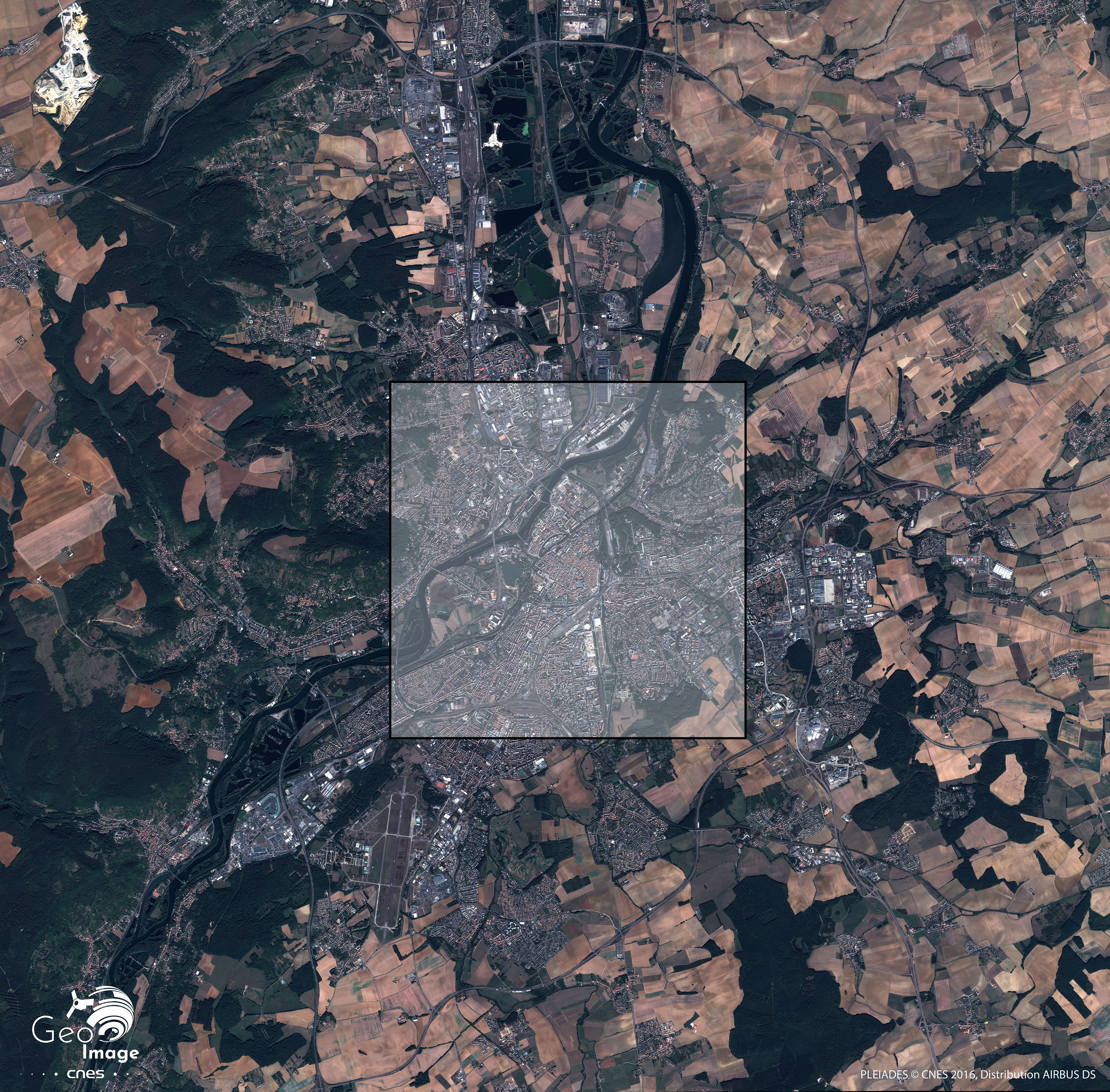 Comme nous le voyons sur l’image, l’aire urbaine de Metz (389 000 habitants) est organisée de manière bicéphale. Le pôle messin, cœur métropolitain d’une agglomération de 220 000 habitants qui se trouve au centre de l’image, déborde aujourd’hui largement vers le sud pour former le territoire de Metz Métropole. Depuis le 1er Janvier 2018, cet ensemble regroupe 44 communes au total et le pôle urbain d’Hagondange-Briey qui entre en conurbation avec elle plus au nord le long du sillon mosellan, dont on peut apercevoir les premières éléments en haut de l’image.
