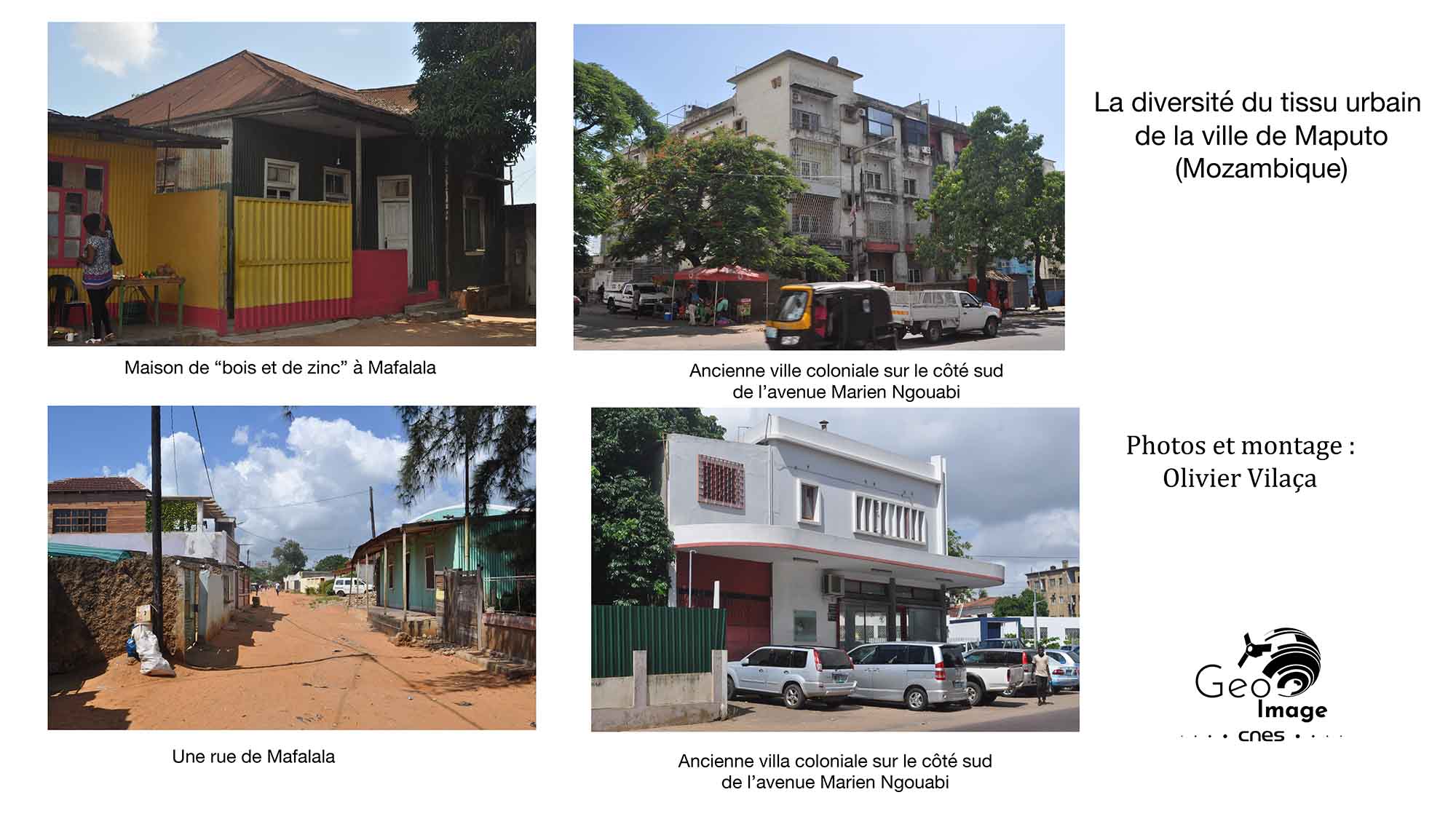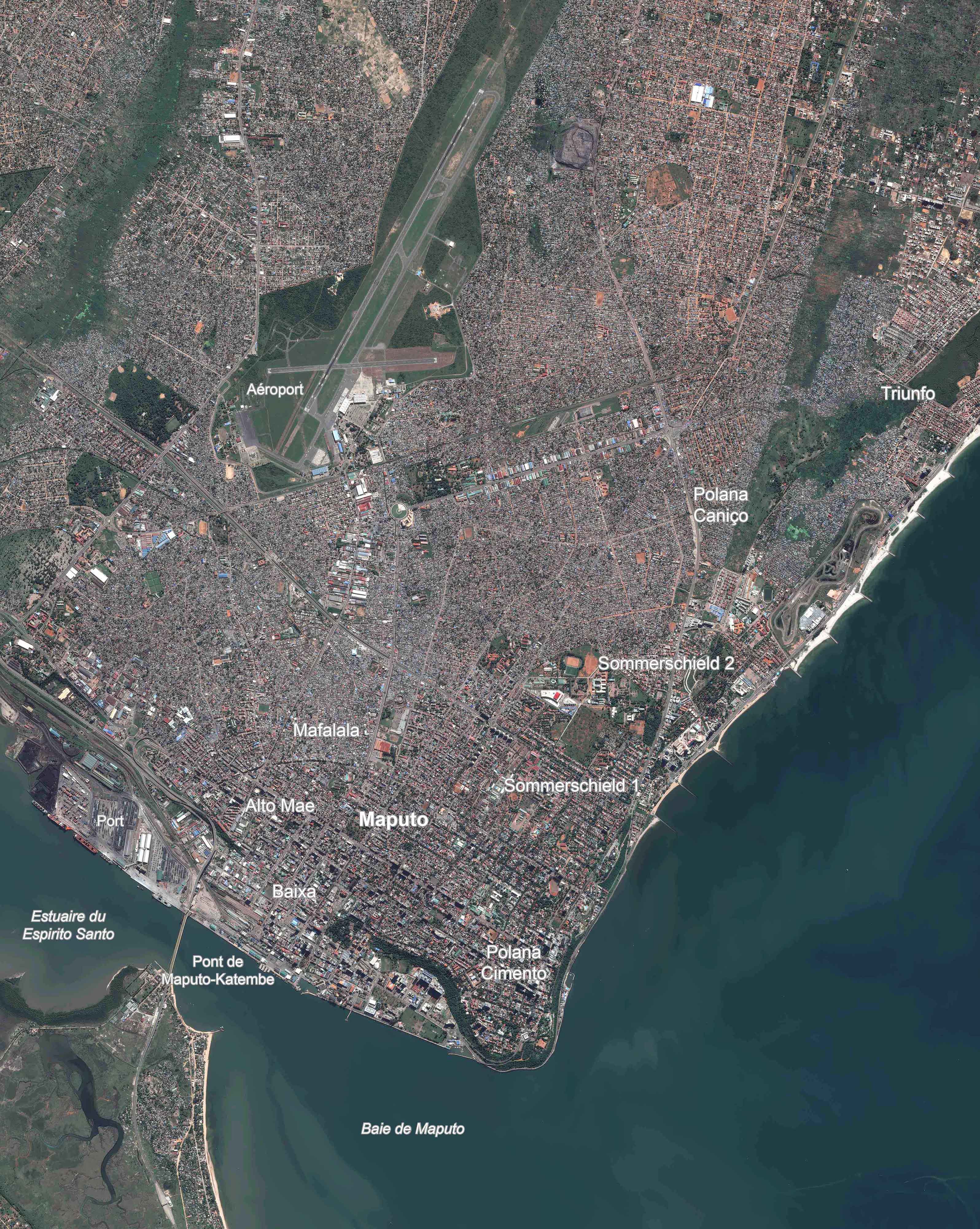 Maputo est aujourd’hui une métropole avant tout périurbaine. Sa belle skyline remplie d’immeubles relativement anciens et pas très hauts, que l’on voit bien de l’autre côté de la baie, à partir des rives de Katembe, ne doit pas faire illusion. Les images montrent bien, vers le Nord surtout, un étalement urbain constitué de petites maisons individuelles sans étages, situées sur des parcelles de terrain relativement grandes par rapport à l’enjeu urbain (voir zoom 10).