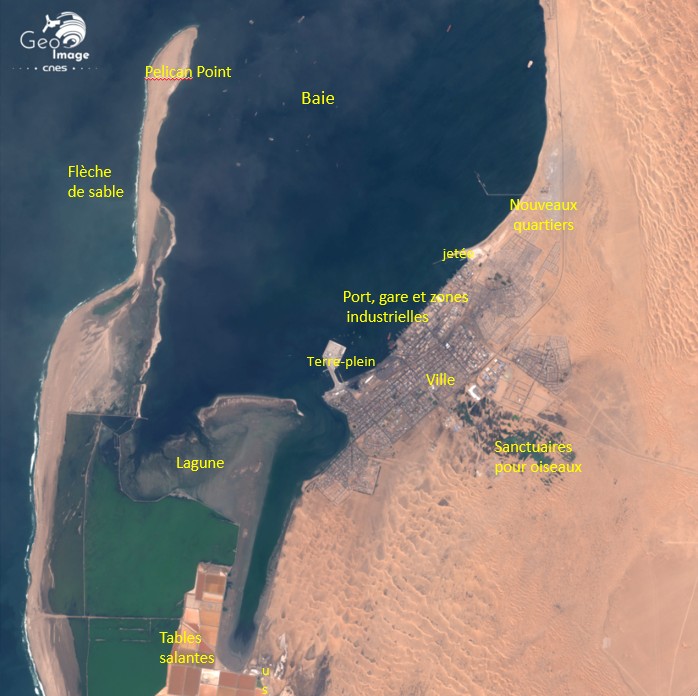 Enfin, au plan morphologique comme le montre l’image, le trait de côte se caractérise par la présence d’importantes flèches de sable, plus ou moins longues et surtout bien orientées du sud vers le nord selon le sens du courant. Elles isolent des lagunes plus ou moins étendues en particulier au sud de Walvis Bay et de Sandwich Harbour.