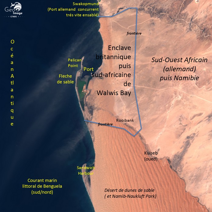 L'enclave britannique, puis sud-africaine, de Walwis Bay dans le territoire du Sud-Ouest Africain (colonie allemande) puis la Namibie. Une frontière tracé au cordeau en plein désert avec pour seul objectif le contrôle du port en eau profonde.